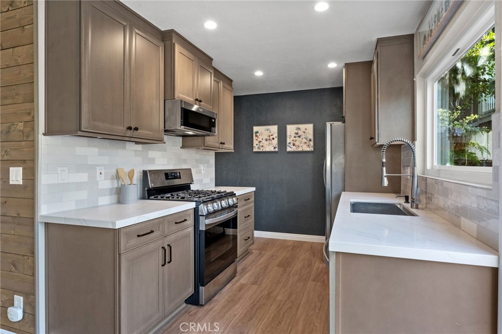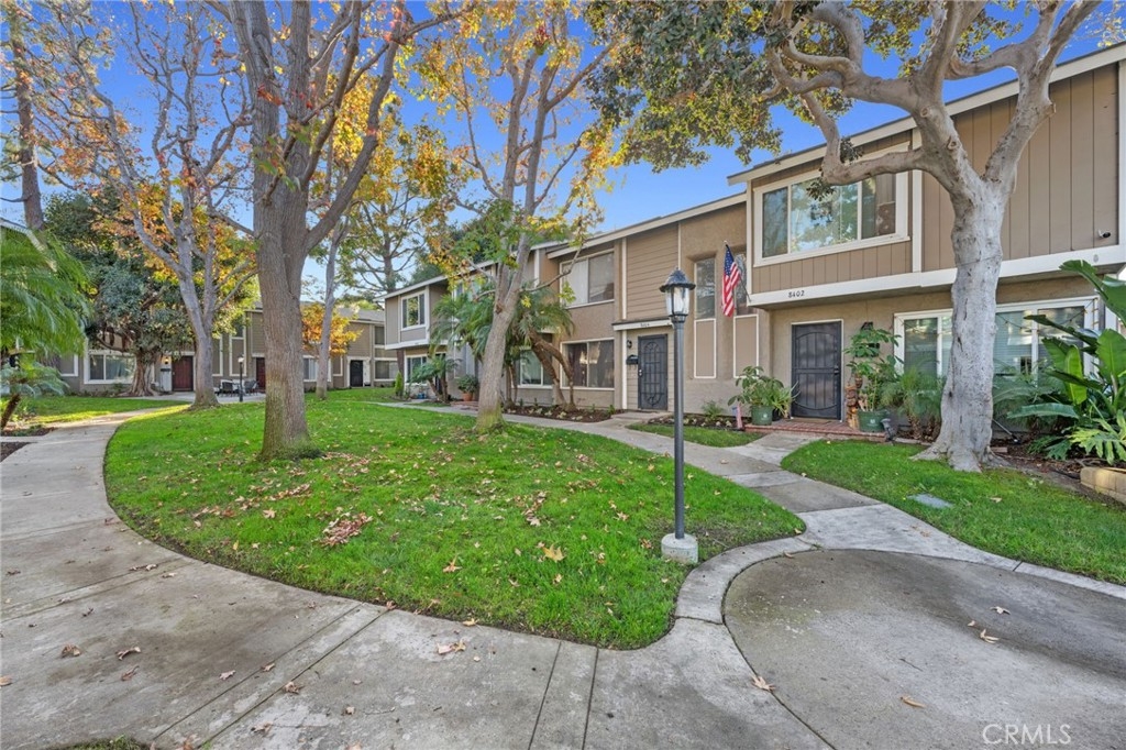 Welcome to this turnkey 3-bedroom, 1.5-bathroom townhome located in the charming Bayshores community. Nestled on an end unit along a serene green belt with oversized trees, this home offers both tranquility and convenience. As you enter the first floor, you'll be greeted by a spacious living room featuring luxury vinyl plank flooring, a large window with views of the lush green belt, and recessed lighting. The remodeled half bath on this level adds a touch of modern sophistication. The kitchen, also remodeled, boasts neutral tones, quartz countertops, slow-close cabinets and drawers, and sleek stainless steel appliances. There's an inviting eat-in area, perfect for casual dining, and a cozy nook ideal for a beverage station or added storage. The kitchen and dining area open up to a patio filled with plants and a magnolia tree, offering direct access to your carport with added storage. Upstairs, you'll find three bedrooms, each featuring brand-new carpet, and a beautifully remodeled bathroom. The primary bedroom is generously sized, with double door entry, a ceiling fan, large window, and an oversized mirrored closet. It also offers direct access to the remodeled bathroom. Completing this home is an inside laundry area, conveniently located for ease of use. Recent updates also include new Milgard windows and a new sliding door. The Bayshores community enhances your living experience with amenities such as a pool and clubhouse, while also covering water and trash services, all for one of the lowest HOA fees in Huntington Beach.