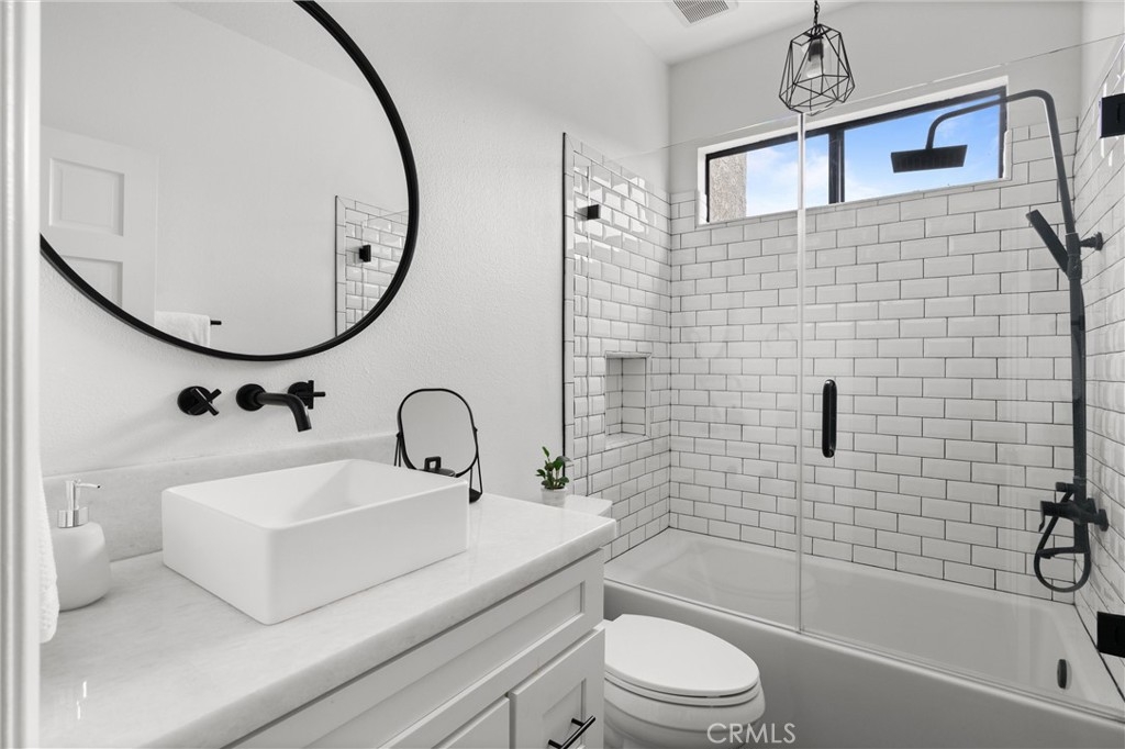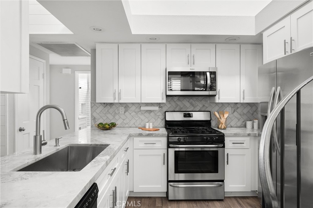 Welcome to this beautifully remodeled 2 bedroom, 2 bath condo with a loft in the highly sought-after gated community of Huntington Beach. Boasting a recent full renovation, this condo offers a modern and stylish living space perfect for those seeking both comfort and convenience. Step inside and be greeted by the open and bright floor plan, featuring vaulted ceilings and large windows with plantation shutters that flood the home with natural light. The spacious living room offers a cozy fireplace, ideal for relaxation and entertaining guests. Above the living room is a versatile loft area, perfect for a home office, playroom, or additional sleeping quarters. The fully remodeled kitchen is complete with sleek dolomite countertops, stainless steel appliances (refrigerator included), ample cabinet space, and a coffee bar. Enjoy preparing delicious meals while staying connected with your loved ones in the adjacent dining and living room area. The condo offers two generously sized bedrooms, including a luxurious primary suite with dual closets and a private ensuite bathroom with a triple-headed shower. Both bathrooms have been tastefully upgraded with modern fixtures, elegant tiling, and designer finishes. The condo also features convenient in-unit laundry facilities for added convenience, washer and dryer included. Situated within a gated community, this condo offers a resort-like lifestyle with an array of amenities. Take a dip in the sparkling pool on warm summer days, relax and unwind in the sauna, or challenge friends to a friendly game of tennis or indoor racquetball on the community courts. With ample guest parking available, you'll never have to worry about accommodating visitors, and with two reserved covered parking spots, you'll always have a secure place for your vehicles. Located in Huntington Beach, this condo is a bike ride away from its famous beaches, and the complex backs up to the Bolsa Chica Wetlands with beautiful hiking trails. Enjoy the coastal lifestyle with easy access to shopping, dining, entertainment, and outdoor activities. Don't miss out on this incredible opportunity to own a fully remodeled 2 bedroom condo with a loft in the desirable Cabo Del Mar community. Schedule a showing today and make this your new dream home!