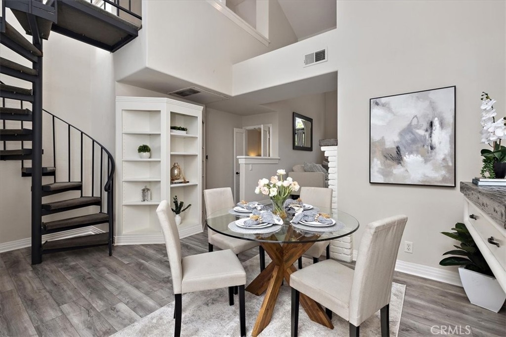 Tucked into lush, tropical landscaping, this beach-close home offers the perfect blend of style and serenity. Soaring ceilings, floor-to-ceiling windows, and a skylight flood the space with natural light. Custom built-ins, bullnose corners, detailed molding, and a beautiful spiral staircase add architectural charm, while a sunny private patio feels like your own treehouse escape. The updated kitchen features timeless white quartz countertops, classic subway tile, and stainless steel appliances. Luxury vinyl plank flooring flows through the main living areas, complementing soft carpet in the loft and on the stairs. The spacious primary suite includes an ensuite bath, and the versatile loft makes an ideal second bedroom or home office. Additional highlights include in-unit laundry, a cozy fireplace, new ceiling fans, and reserved parking. Located in the gated Cabo del Mar community just steps from the Bolsa Chica Wetlands and minutes to the beach, dining, and shopping. Enjoy resort-style amenities including a pool, spa, sauna, tennis and racquetball courts, clubhouse, and greenbelts. This one has it all—don’t miss it!