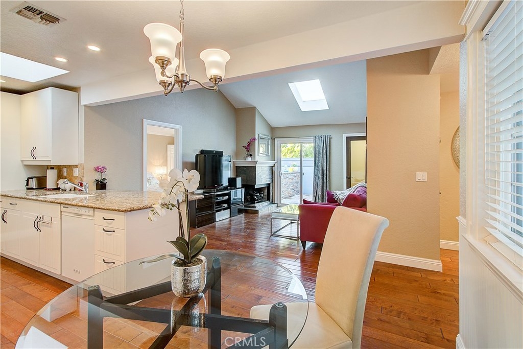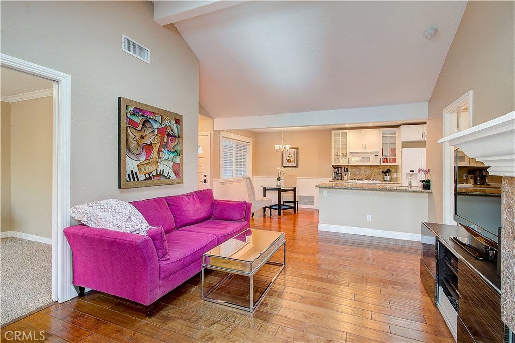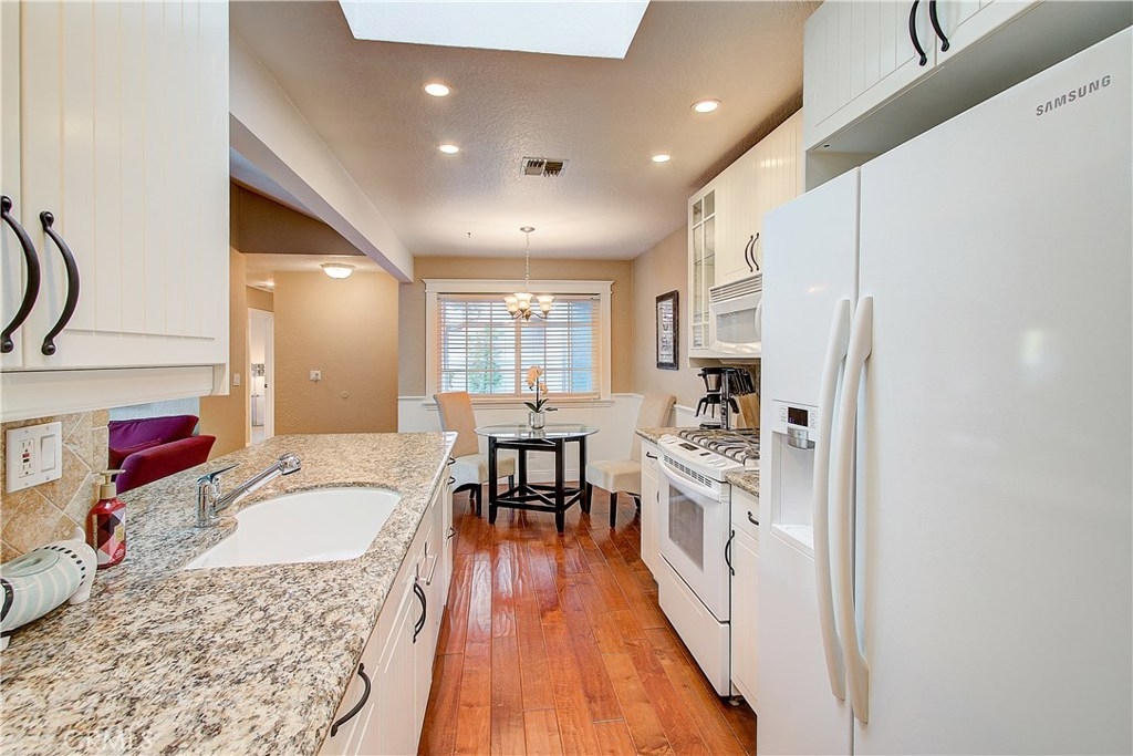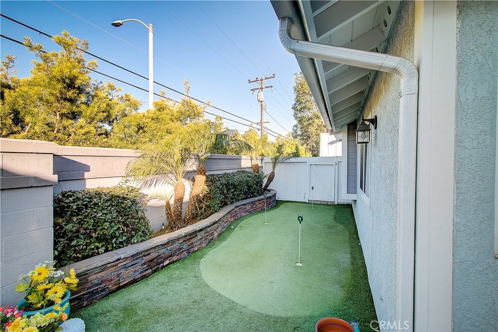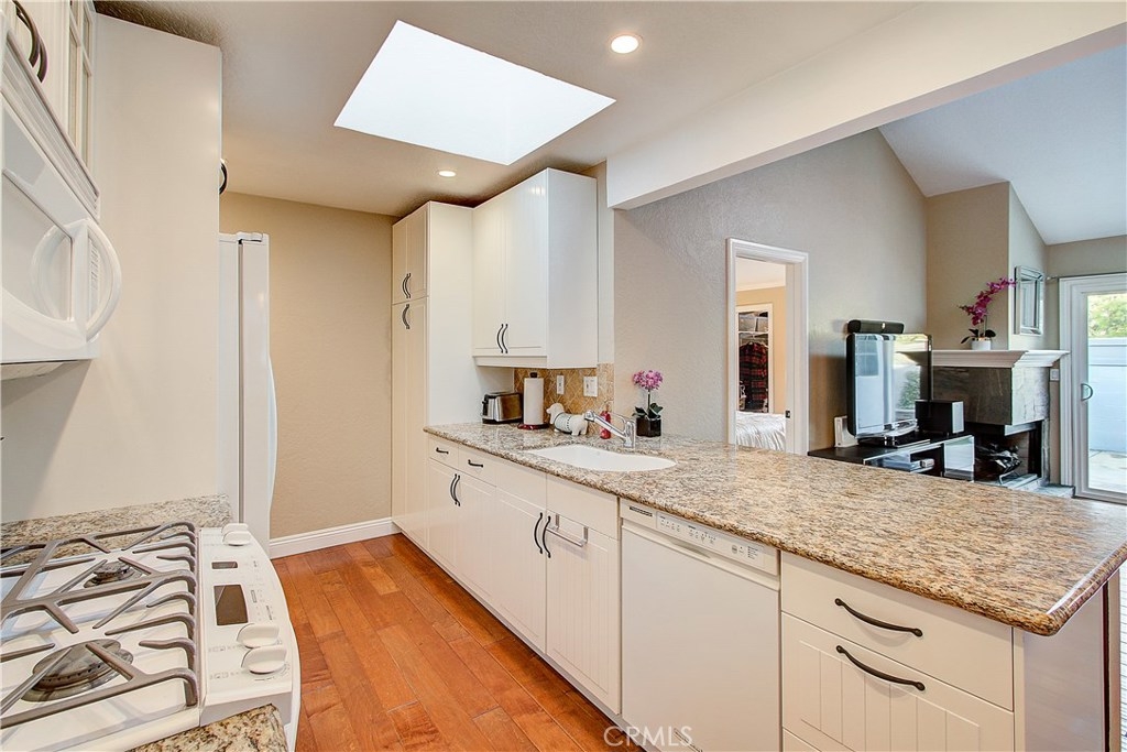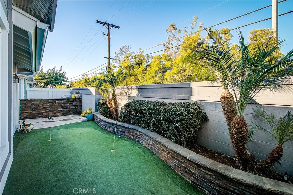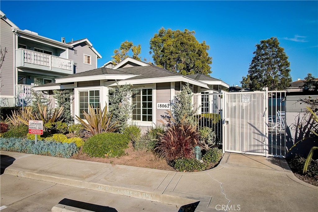 Bright and open, single-level condo located in the Capewoods community, just minutes from downtown Huntington Beach. Warm distressed wood floors, upgraded baseboards and modern paint colors throughout complement the bright and open floorplan. Enter into the open and inviting living room featuring vaulted ceilings, a light-catching skylight, cozy fireplace and sliding doors to the backyard. An adjacent den features crown molding and is perfect for use as an office or bonus room and features a neighboring closet that was used as a wine storage. The living room opens to the kitchen well-appointed with fresh white cabinets, granite counters, recessed lighting and a light-catching skylight. The kitchen opens to the breakfast nook adorned with wainscoting. The master bedroom features crown molding, dual closets, sliding doors to the backyard and an en-suite bathroom with a walk-in shower. Down the hall, the secondary bedroom is generously sized, features wainscoting and is adjacent to the full hall bathroom. Additional features include A/C and a convenient two-car attached garage with laundry room and custom cabinetry inside. Relax or entertain in the upgraded backyard featuring a stacked stone BBQ island, putting green and stacked stone raised planter. Enjoy the nearby community pool and spa.