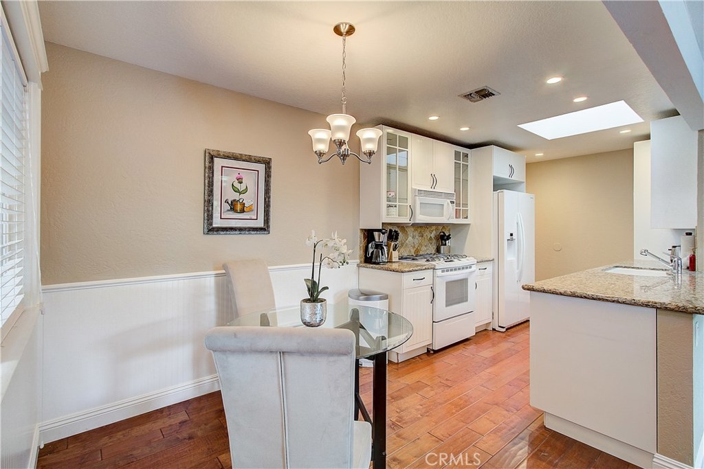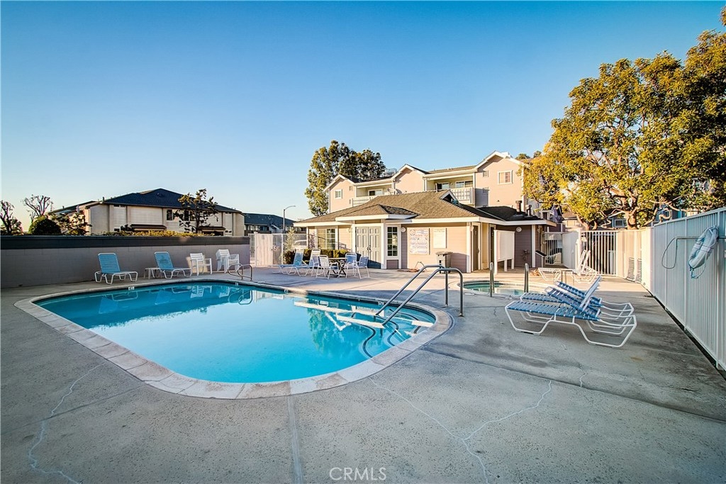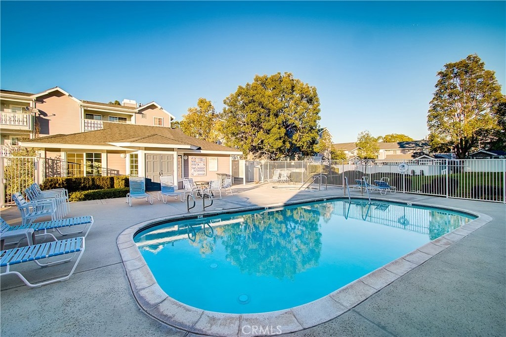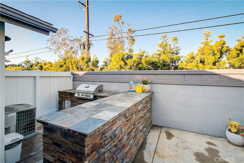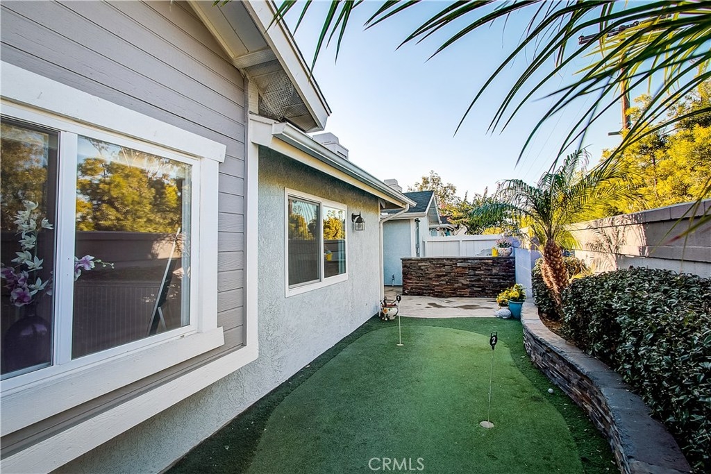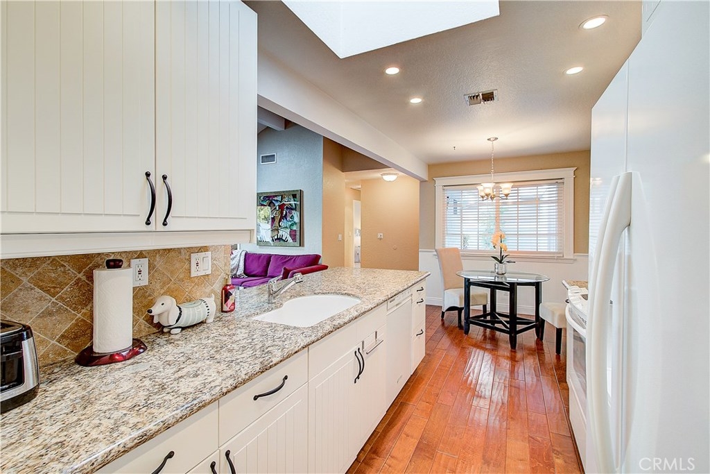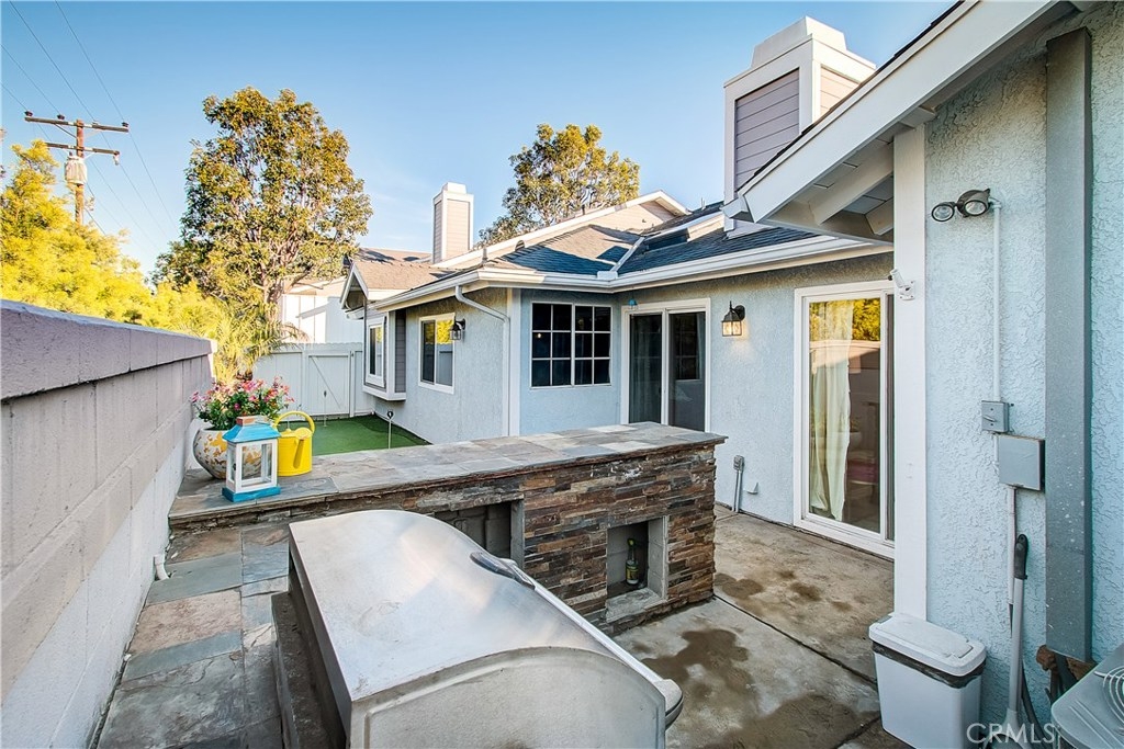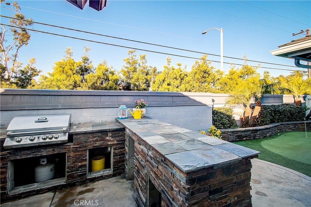 Bright and open, single-level condo located in the Capewoods community, just minutes from downtown Huntington Beach. Warm distressed wood floors, upgraded baseboards and modern paint colors throughout complement the bright and open floorplan. Enter into the open and inviting living room featuring vaulted ceilings, a light-catching skylight, cozy fireplace and sliding doors to the backyard. An adjacent den features crown molding and is perfect for use as an office or bonus room and features a neighboring closet that was used as a wine storage. The living room opens to the kitchen well-appointed with fresh white cabinets, granite counters, recessed lighting and a light-catching skylight. The kitchen opens to the breakfast nook adorned with wainscoting. The master bedroom features crown molding, dual closets, sliding doors to the backyard and an en-suite bathroom with a walk-in shower. Down the hall, the secondary bedroom is generously sized, features wainscoting and is adjacent to the full hall bathroom. Additional features include A/C and a convenient two-car attached garage with laundry room and custom cabinetry inside. Relax or entertain in the upgraded backyard featuring a stacked stone BBQ island, putting green and stacked stone raised planter. Enjoy the nearby community pool and spa.