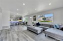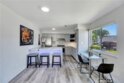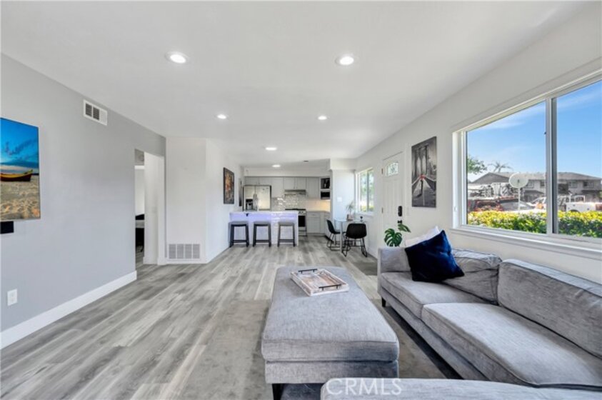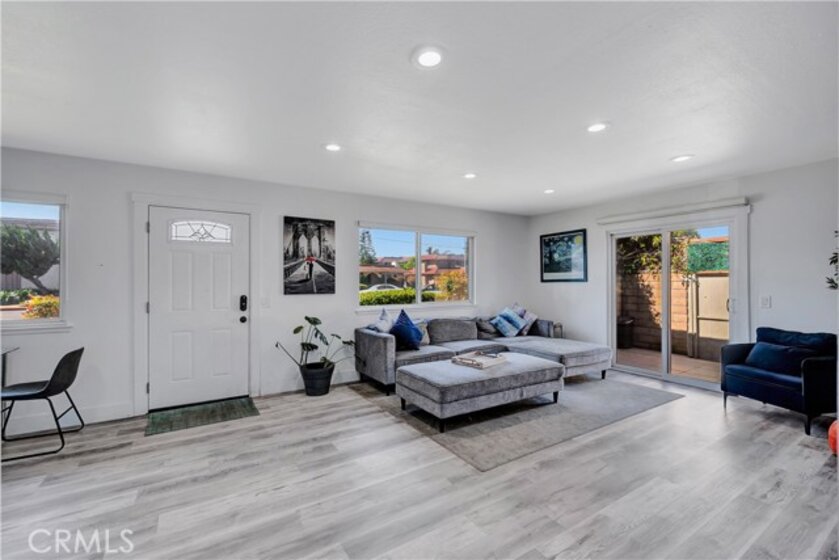 Rare single-story, ground-level unit with no stairs and no one above or below. Located in Harbor Heights Villas, surrounded by landscaped greenbelts and near the community pool and clubhouse. Light-filled open floor plan with updated kitchen featuring refreshed cabinetry and stainless steel appliances, including refrigerator. Kitchen opens to dining area and living room with smooth ceilings and tile flooring. Dual-pane windows and sliding door, recessed lighting with smart switch, Ring doorbell, ceiling fans, and laminate flooring in both bedrooms. One bedroom includes built-in storage bench. Upgraded full bathroom with custom tile tub/shower and updated fixtures. Private patio and indoor laundry inside the unit. Includes one designated parking space and storage in shared two-car garage (half garage per unit). HOA amenities include pool, clubhouse, basketball court, RV parking, water and trash. Close to Huntington Harbor, beaches, shopping, dining, and approximately 1.3 miles to Bolsa Chica Wetlands.