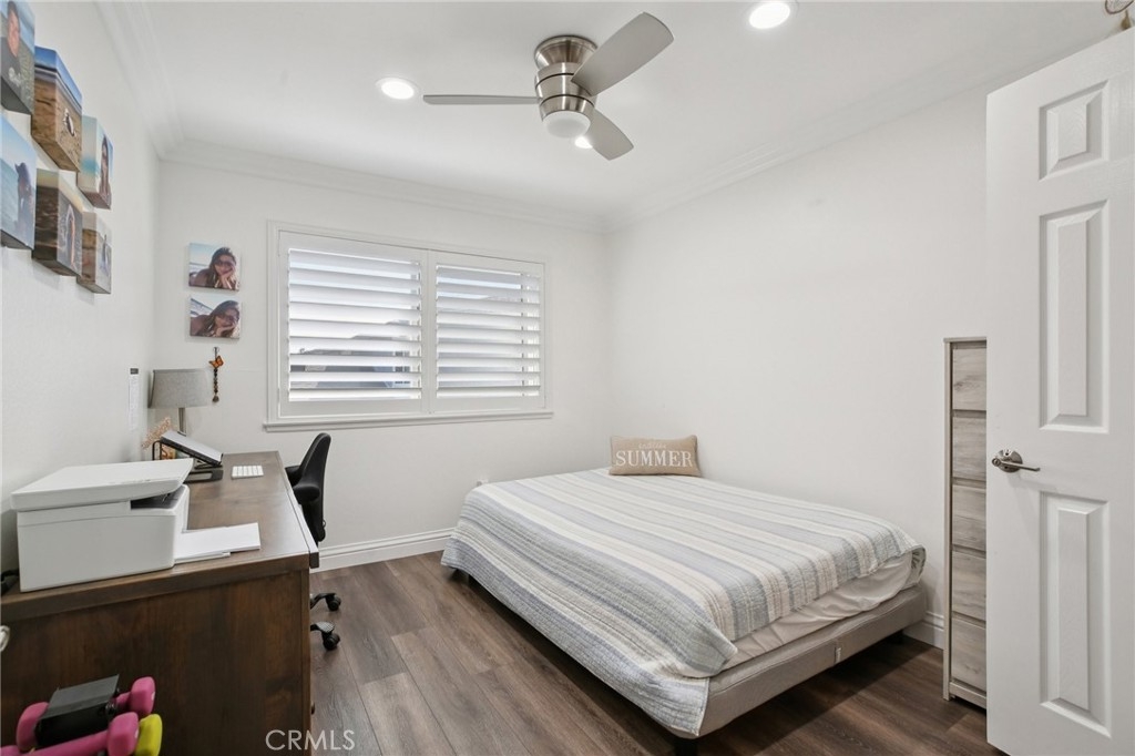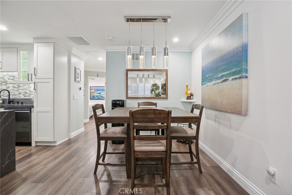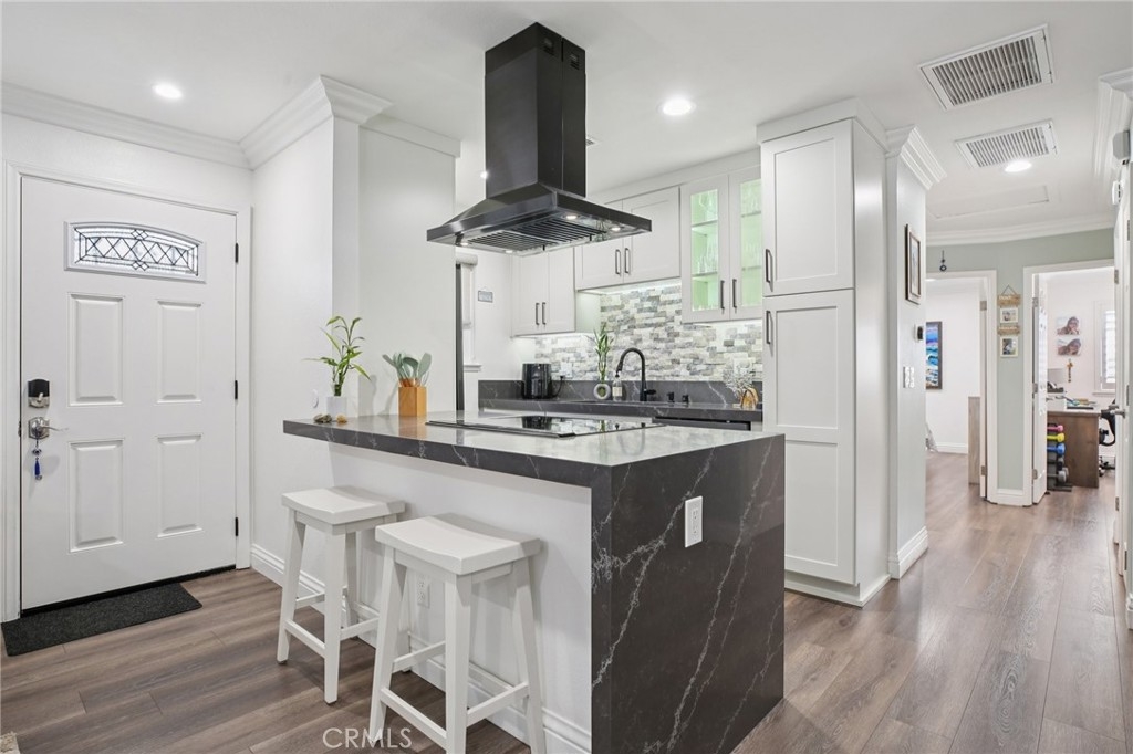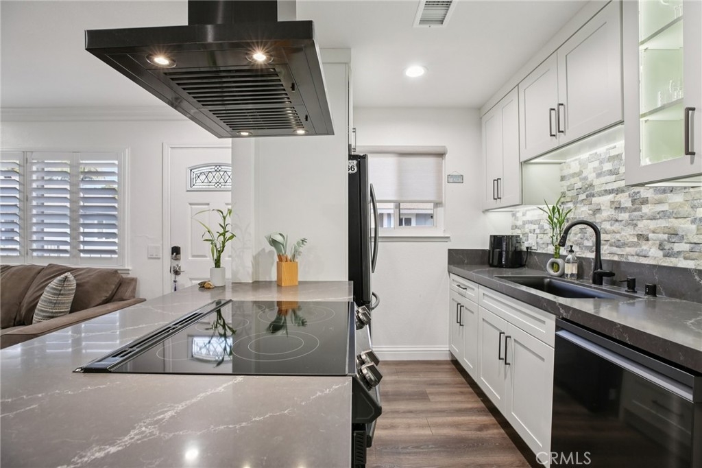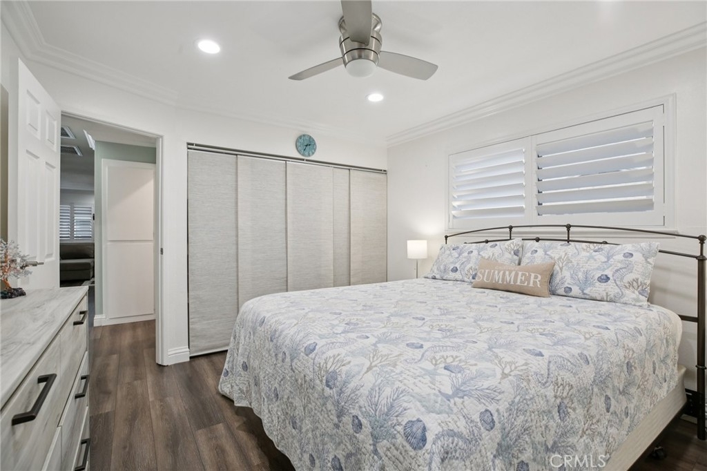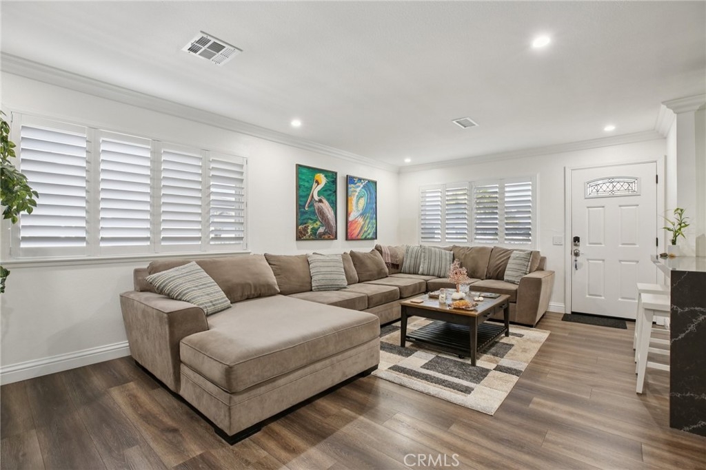 Welcome to Harbor Heights Villas, a beautifully maintained coastal community just minutes from Sunset Beach, Bolsa Chica Wetlands, and the scenic trails and waterways of Huntington Harbour. This upgraded 2-bedroom, 1-bath upper-level end unit offers modern style and comfortable living in one of Huntington Beach’s most desirable neighborhoods. The home features wide-plank flooring, plantation shutters, recessed lighting, and an open-concept layout filled with natural light. The remodeled kitchen includes updated cabinetry, sleek stone countertops, a designer tile backsplash, and a breakfast bar that flows seamlessly into the living and dining areas. The bathroom has been thoughtfully renovated with contemporary finishes, tile detail, and a glass-enclosed shower. Both bedrooms are spacious with ample closet storage and ceiling fans. Additional highlights include a private balcony entrance area, access to the community’s serene greenbelts, and a shared garage with one dedicated parking space plus additional community parking. Conveniently located near shopping, dining, everyday amenities, and some of the area’s best outdoor recreation. A fantastic opportunity to own a turnkey home in a highly sought-after Huntington Beach enclave.