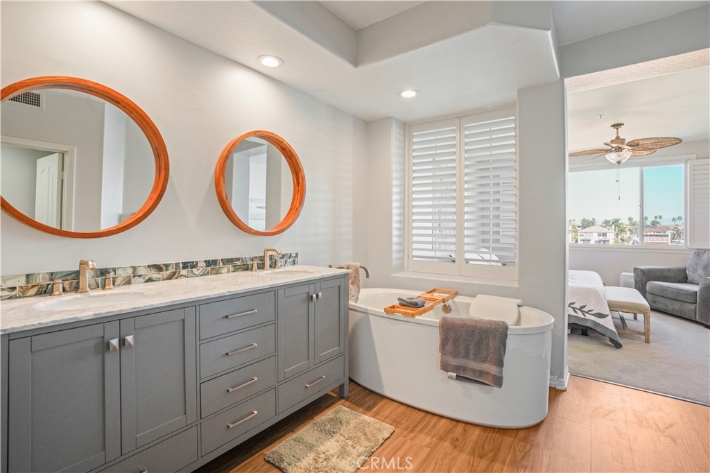 Beautiful End Unit with Stunning Views in Huntington Harbour Bay Club. Welcome to this gorgeous end-unit condo in the highly sought-after Huntington Harbour Bay Club. This second-floor home boasts elevated views of the back bay/marina, Bolsa Chica Wetlands, and the ocean, with breathtaking vistas of Catalina Island. The spacious single-level floor plan features two bedrooms and two bathrooms, with elevator access for convenience. Enjoy the natural light that pours in through large, recently replaced windows and sliders (just two years old). The primary bathroom was completely remodeled last year, and luxury laminate flooring was installed throughout. The second bathroom has been partially updated with a new vanity and flooring. A brand-new washer and dryer were installed last month. Relax on the two balconies—one on the front and the other on the bayside—perfect for enjoying serene sunrises from the kitchen window and stunning sunsets from the balcony or front door. You'll also appreciate the picturesque pond views, home to egrets, blue herons, pelicans, and ducks, visible from the balcony and front bedroom. The Huntington Harbour Bay Club offers exceptional amenities, including a swimming pool, spa, and a two-story clubhouse with a kitchen, fireplace, and pool table (available for rent). The community is steps away from shopping, fitness studios, personal care services, and waterfront neighborhoods. Enjoy an easy walk or bike ride to the beach, local bars, and restaurants. The Bolsa Chica Wetlands and trails are right across the street, perfect for outdoor enthusiasts. Trader Joe’s and the shops at Huntington Harbour Mall are just minutes away. Boat enthusiasts will love the convenience of docking at the marina on the bay side of the community. This is coastal living at its finest—don’t miss your opportunity to call this beautiful home yours!