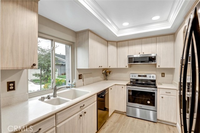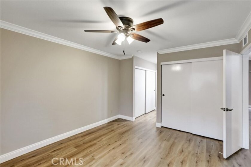 Welcome to the Iconic Landmark-- a surf city gem. Ocean breezes keep the weather temperate year round. Sustainable lush landscaping throughout Landmark. Just minutes to the beach in coveted Huntington Beach. This friendly 55 and up community has all the amenities. Two Community Pools, Clubhouses, Guarded Security Gate, Tennis/Pickleball courts, Events, Concerts, Clubs, Billiard Room, Putting Green, Fitness Center, and activities galore. Enjoy the expansive green space easy to walk or bike in this enchanting Community. This gem boasts a beautiful 2 Bedroom and 2 full baths corner unit condominium with high ceilings and a skylight in the main bathroom, ensuite in the Primary Bedroom, and updated laminate flooring. Two double closets in the Primary and one double in the 2nd bedroom plus 2 hall closets allow for lots of storage. Ceiling fans in dining and bedrooms. Kitchen though not large, has a soothing design, great layout and functionality for any cook. Features in the kitchen include a built in microwave, pull out dedicated spice storage, beautiful over the sink window, and a corner cabinet with rounders for pots and pans. Two sets of sliding glass doors open to a patio with high walls for privacy and there you will find access to the enclosed washer and dryer with more storage. Easy ample parking. The one-car garage is detached with ample storage space. Easy access to the main Clubhouse. Blocks away from Beach Boulevard, PCH and shopping centers, cafes and the cool vibe of beach living. Come visit Landmark and you will want to stay!