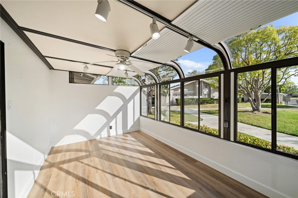 Immaculate, and rarely listed Marina floor plan in the sought after Huntington Landmark 55+ community. This end unit also features a breezy sunroom adding tremendous options for increased space. A spacious and private front patio invites you in and leads to the leaded glass front door. Soaring ceilings with smooth finish energy efficient Led recessed lighting illuminates an already bright and airy interior. An immense skylight brings peaceful natural lighting to the living and dining areas. Open to the kitchen, living room and front patio, the dining room is at the heart of this home. With an expansive wet bar and counter, plus ample storage, this dining space becomes an entertainers dream! Dramatic sand tone luxury vinyl plank flooring meanders seamlessly through the interior and the sunroom, making a striking statement throughout. The kitchen features crisp white cabinetry with bold black hardware, Corian counters and newer white appliances. Refrigerator, stackable washer and dryer, newer range and dishwasher plus the brand new microwave are all included in the purchase of this desirable home. The hall bath includes a wonderful walk-in jetted bathtub, newer cabinetry, over sized tile in deep rust tones, new lighting, newer Toto commode, plus the convenience of a skylight. The Primary bedroom has direct access to the sunroom, and features a walk in closet. New lighting and hardware dress the bathroom cabinet with it's ample storage and wide drawers. A Toto commode, new Wifi exhaust fan and new shower head are a few more upgrades offered in this wonderful property. Interior improvement include newer central A/C, newer tankless water heater with filtration, recessed Led lighting t/o, new baseboard t/o, new flooring, a breezy sunroom, three skylights, plus new screens to all windows. Community features include RV storage, 2 pools, spa, tennis courts, pickle ball courts, shuffle board, fitness center, billiards hall, library, arts and crafts room, game room, wood shop, and putting green...plus 24 hour security with a guard at the front gate!