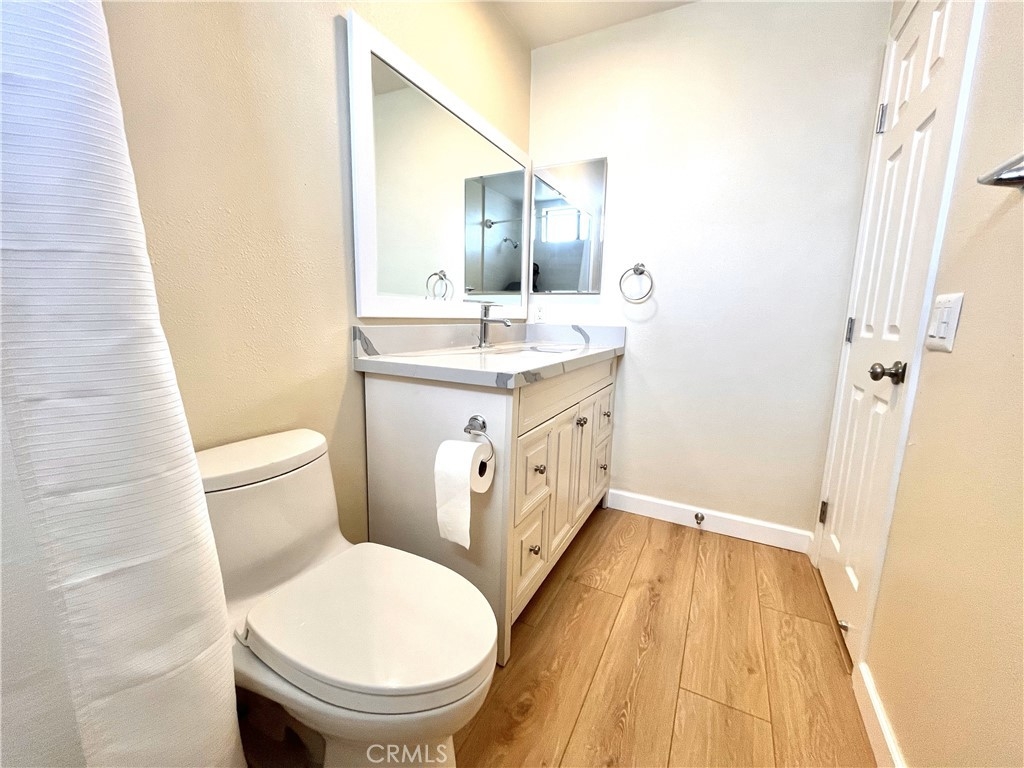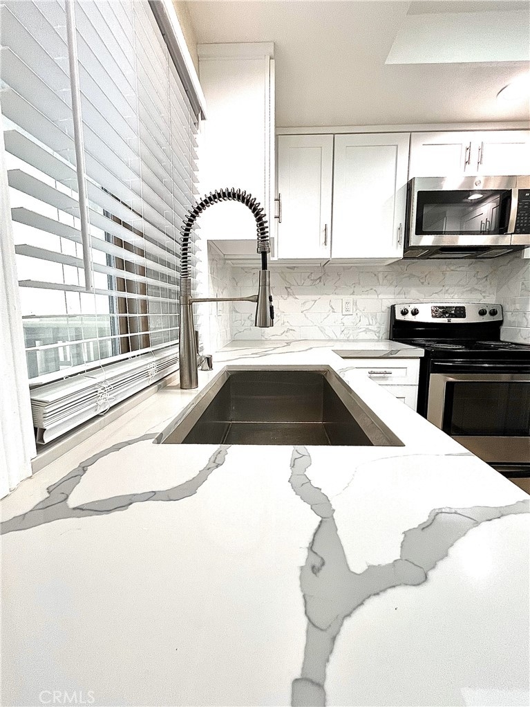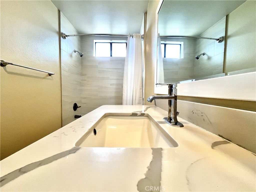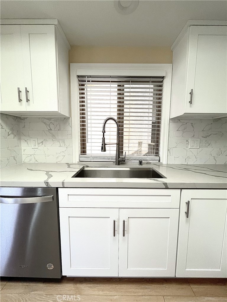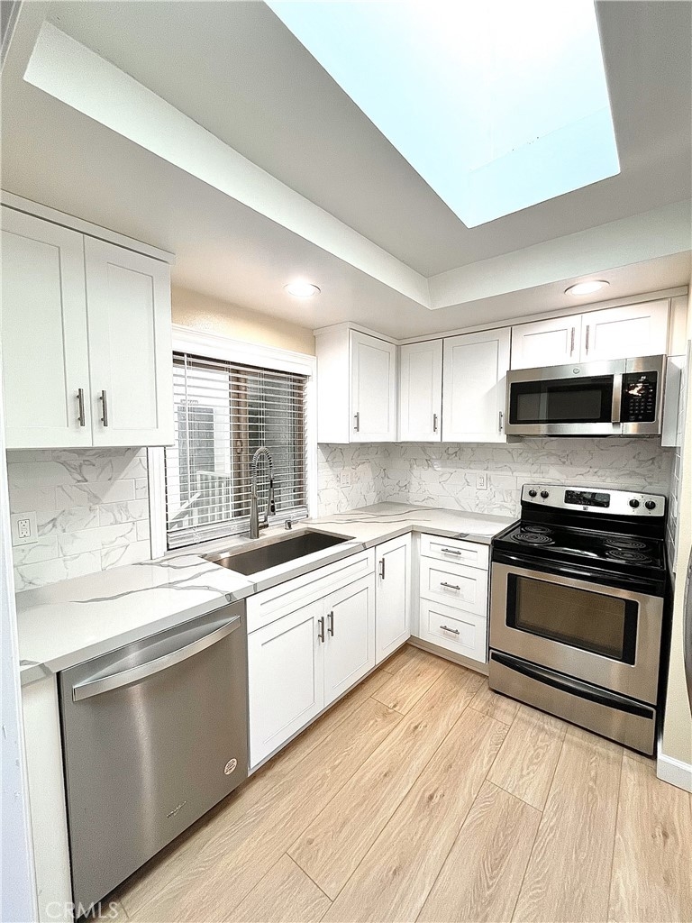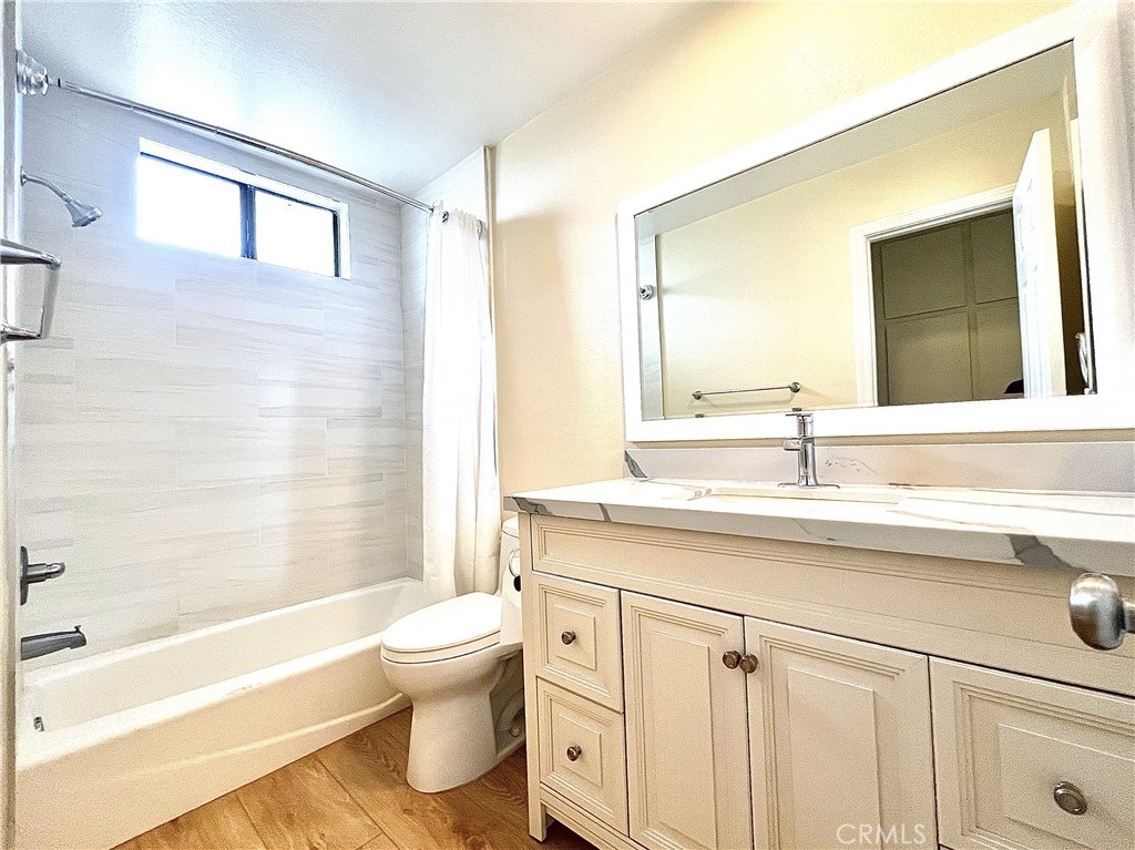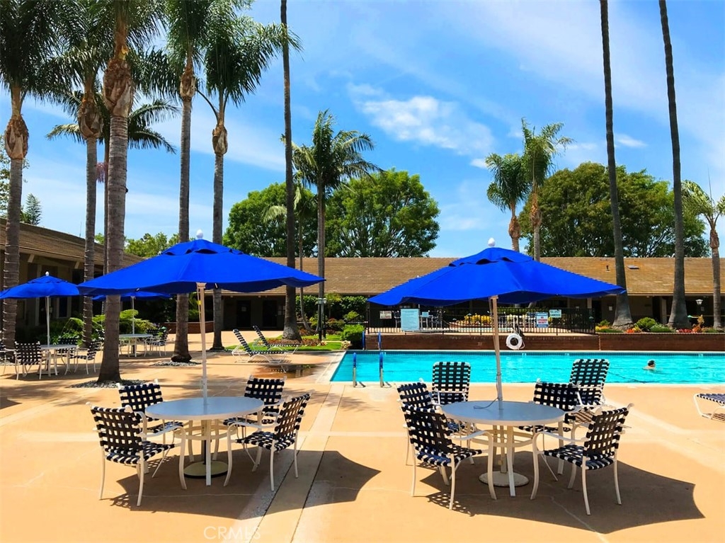 Discover the highly desirable resort-style living in the Huntington Landmark Community. Residents will enjoy the 24-hour gated highly secure enclave with exclusive access to two heated pools, spas, lighted tennis courts, pickleball courts, fitness center, BBQ areas, billiard room, ping pong tables and many other recreational facilities. This sought after end unit features a completely remodeled kitchen including modern white cabinetry, quartz countertops with stylish tile backsplash, updated stainless steel appliances including refrigerator and luxury vinyl plank flooring. In addition, completely remodeled modern bathroom including new vanity sink, tiled shower-bathtub combo and luxury vinyl flooring. This desirable floor plan includes a private balcony and new washer and dryer are included. Detached 1-car garage with brand new door and automatic opener. The water and trash services are included in HOA fee. Located just a mile from the beach, enjoy one of Huntington Beach's most popular 24-hour guard-gated 55+ community.