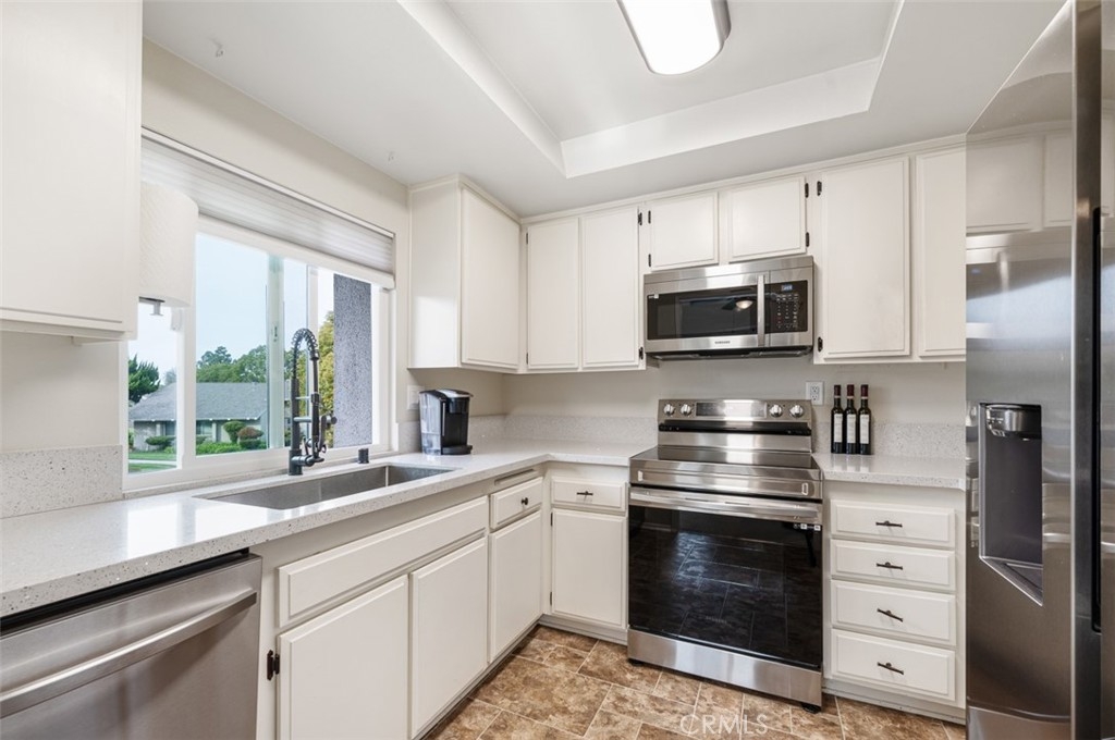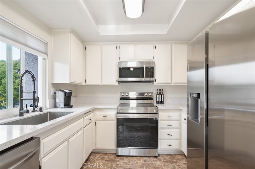 Welcome to 8644 Portola Court! Located in Huntington Beach—a luxurious coastal haven just 1 mile from the beach, nestled within a vibrant 55+ guard-gated community. This elegantly appointed home boasts an open floor plan with new stainless steel appliances, quartz countertops, and a spacious bedroom overlooking serene greenbelt views. The dual pane windows flood the space with natural light, offer energy efficiency, and frame the picturesque surroundings. You'll Experience resort-style living with Landmark's extensive resort style amenities, including two heated pools, spas, tennis and pickleball courts, shuffleboard, and a putting green. The fitness center, professional workshop, sewing room, and library cater to diverse interests, while ping pong and billiards provide lively social spaces. Here you will engage in a rich social life with organized activities, clubs, and classes ranging from dances and trips to woodshop, chorale, and art. Each day is an opportunity for relaxation, recreation, and community engagement. Fully embrace this luxurious beachside living at 8644 Portola #12E, where comfort meets convenience just a stroll away from the sandy shores. Your dream coastal retreat in Huntington Beach, where every detail is curated for a sophisticated and active lifestyle, awaits.