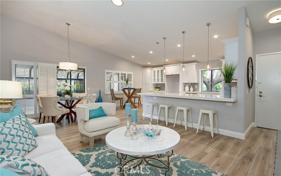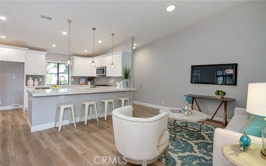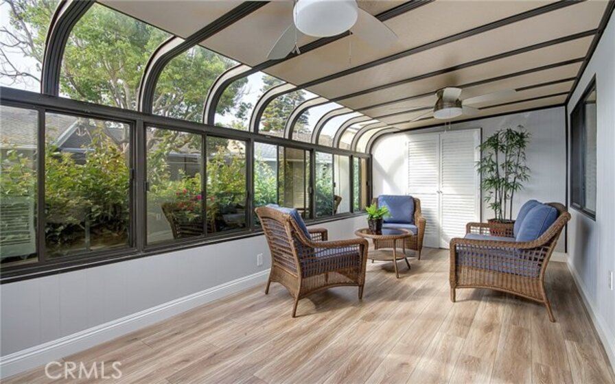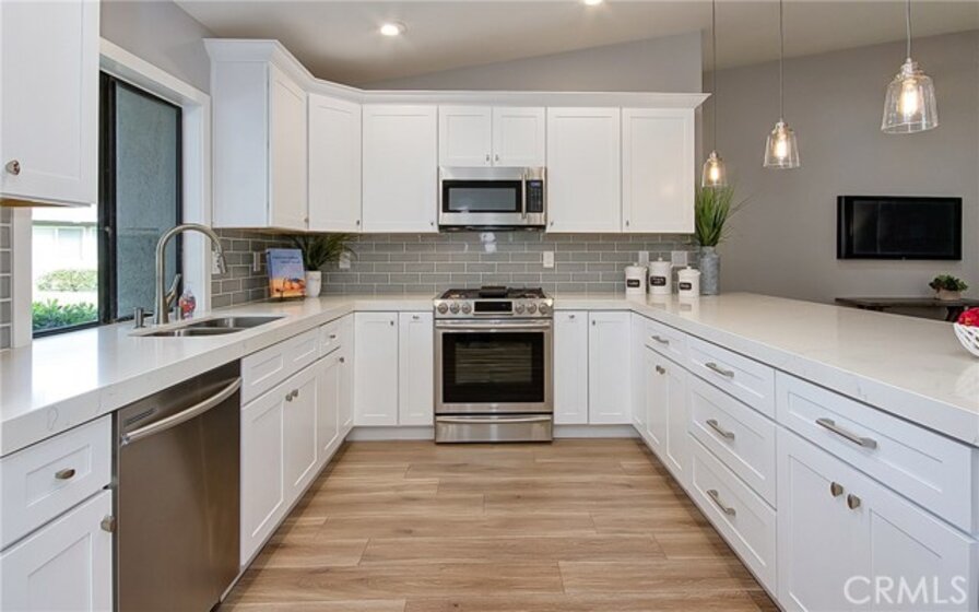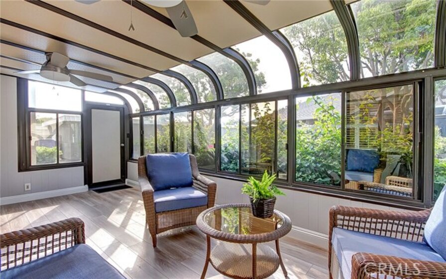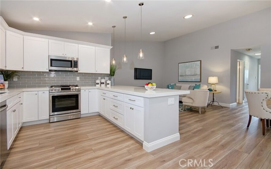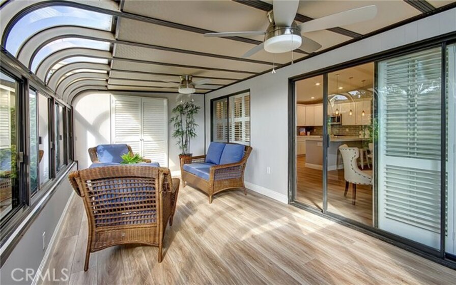 One of the finest examples of the Laguna Model floor plan to be offered in the highly desirable 55+ community of Huntington Landmark. This completely remodeled and redesigned end unit home is perfectly situated in a very quiet interior location. Upon entry, you are greeted by wide plank engineered wood/laminate floors and impressive vaulted ceilings. Your brand new and expanded open concept kitchen showcases designer white cabinetry, stainless steel appliances, chic Quartz countertops, peninsula with breakfast bar seating, subway tile backsplash and energy efficient recessed lighting. Through sliding glass doors, enjoy the finished sunroom, a wonderful extension of your indoor/outdoor living space. The gracious master bedroom with ceiling fan offers a walk in closet and deluxe master bathroom with dual vanity, designer tile flooring, brushed nickel fixtures and enclosed bathtub & shower. Two spacious guest bedrooms share a full guest bathroom equally as beautiful as the master. Additional highlights include: light tube skylights, ceiling fans, full width inside laundry area and a one car garage. This home is absolutely stunning!