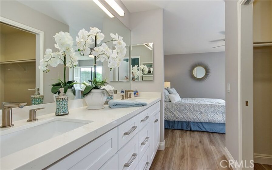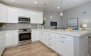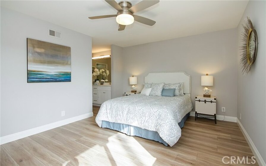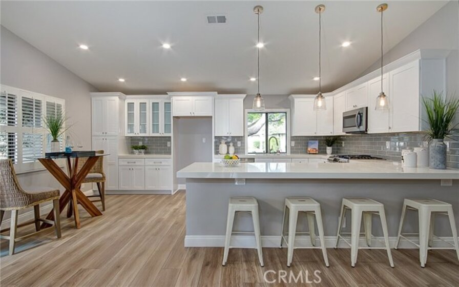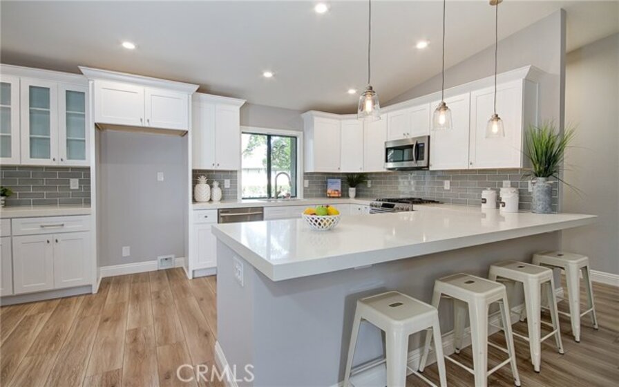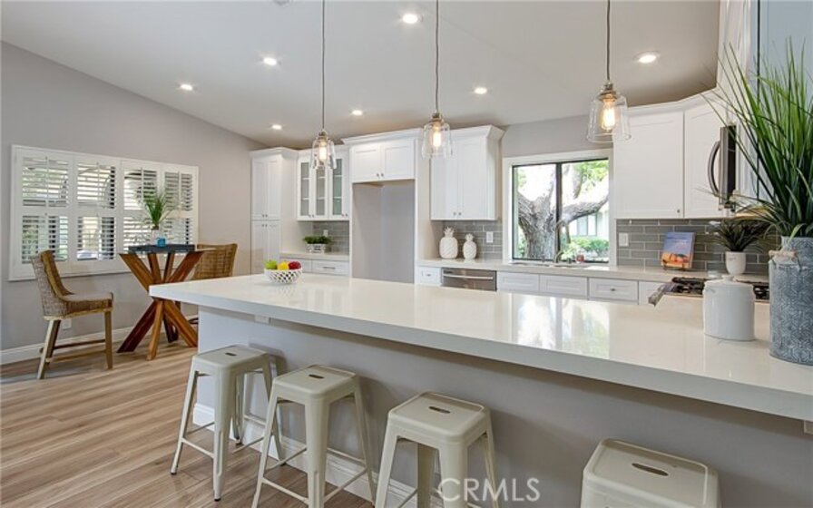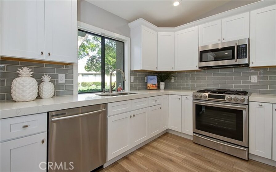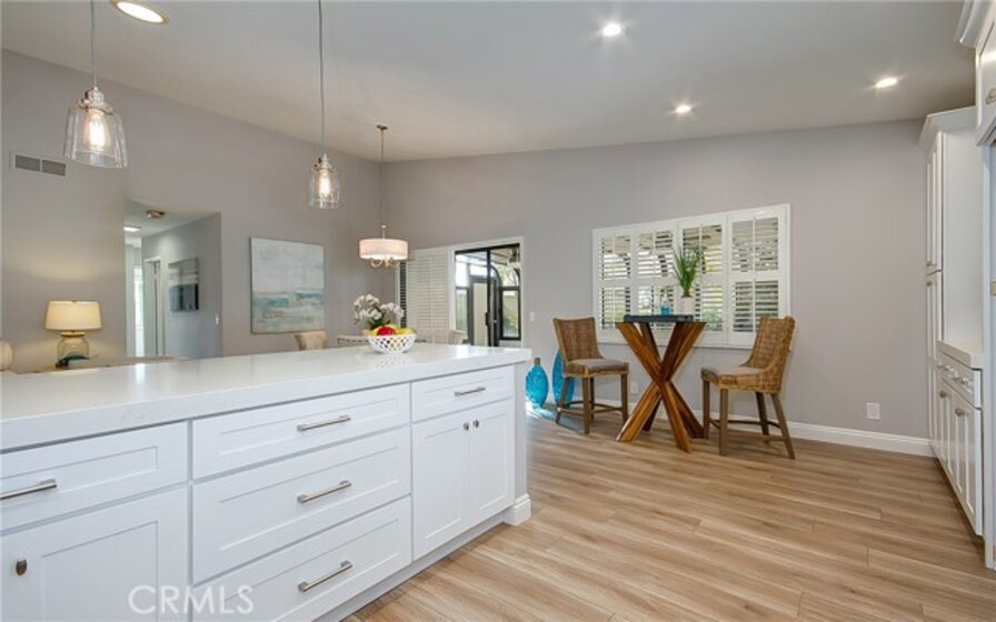 One of the finest examples of the Laguna Model floor plan to be offered in the highly desirable 55+ community of Huntington Landmark. This completely remodeled and redesigned end unit home is perfectly situated in a very quiet interior location. Upon entry, you are greeted by wide plank engineered wood/laminate floors and impressive vaulted ceilings. Your brand new and expanded open concept kitchen showcases designer white cabinetry, stainless steel appliances, chic Quartz countertops, peninsula with breakfast bar seating, subway tile backsplash and energy efficient recessed lighting. Through sliding glass doors, enjoy the finished sunroom, a wonderful extension of your indoor/outdoor living space. The gracious master bedroom with ceiling fan offers a walk in closet and deluxe master bathroom with dual vanity, designer tile flooring, brushed nickel fixtures and enclosed bathtub & shower. Two spacious guest bedrooms share a full guest bathroom equally as beautiful as the master. Additional highlights include: light tube skylights, ceiling fans, full width inside laundry area and a one car garage. This home is absolutely stunning!