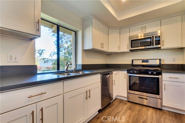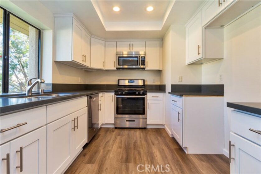 This beautifully Remodeled home is located in the Highly desirable 55+ Gated Community of Huntington Landmark! Offering 2 Bedrooms, 2 Bathrooms, and an enclosed 1 Car garage, this is an end unit with no one above you and only 1 common wall! This open concept popular floor plan has vaulted ceilings and is filled with light through skylights in the main rooms and bathroom. The unit has been completely renovated including new wood like laminate flooring and a New Kitchen! The Designer kitchen features New custom wood-shaker cabinets, Quartz countertops, New High-end Stainless Steel Appliances including dishwasher and gas range, double sink and a nice window looking out to the greenbelt. Step out from the living room and enjoy dining and relaxing on the Large Patio overlooking a beautiful Greenbelt. The bathrooms have new tiled showers, gorgeous tile floors, new vanity and sink and light fixtures. The unit has laundry hook-ups and tons of storage. The community offers Resort Style living with many amenities including Tennis courts, shuffleboard, ceramics room, gym & weight room, a club house, billiard room, gate guard, wood shop, library, putting green, and Two Heated Swimming pools and spas!! Tons of Activities and events, come enjoy all this home has to offer, and live 10 Blocks from the Beach!
