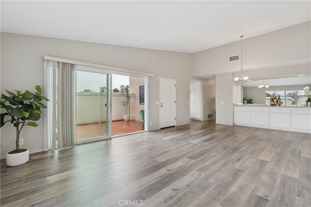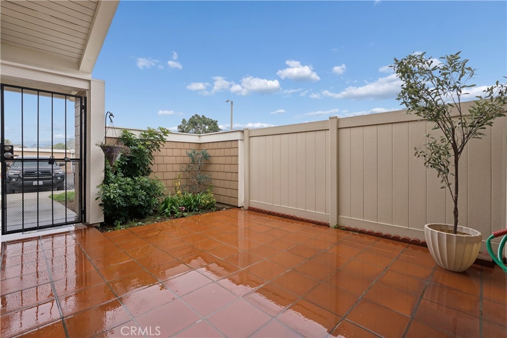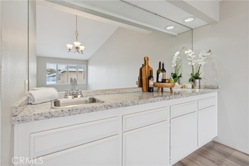 Welcome to this highly sought-after end-unit townhome located in the guard-gated, 55+ community of Huntington Landmark. This light and bright residence offers a desirable layout with two private outdoor living spaces, creating a wonderful indoor-outdoor flow. The front patio, accessed directly from the living and family room area, provides a charming space to relax or entertain. The primary bedroom features its own rear patio, offering a quiet retreat with added privacy—an appealing and rarely available feature. Inside, the home offers luxury vinyl plank flooring throughout the main living areas, with carpeted bedrooms for added comfort. The kitchen features white cabinetry, granite counter tops, stainless appliances, lovely window overlooking patio and a stackable washer and dryer conveniently located within the space. A custom built-in wet bar with sink adds both character and functionality, ideal for entertaining or everyday enjoyment. Both bathrooms are original and well maintained, offering a clean, light, and bright feel. The primary bathroom includes a grab bar in the shower, providing added convenience and accessibility. Additional features include a detached one-car garage and guest parking conveniently located directly in front of the unit. Huntington Landmark is a premier 55+ community offering resort-style amenities including two heated swimming pools and spas, pickleball, tennis, fitness center, library, billiards, ceramics studio, woodshop, putting green, shuffleboard, bocce ball, RV storage, organized clubs and activities, expansive greenbelts, on-site management, and guard-gated security. HOA dues include access to all the terrific amenities. Ideally located close to the beach, shopping, dining, and transportation—this is Southern California living at its best.