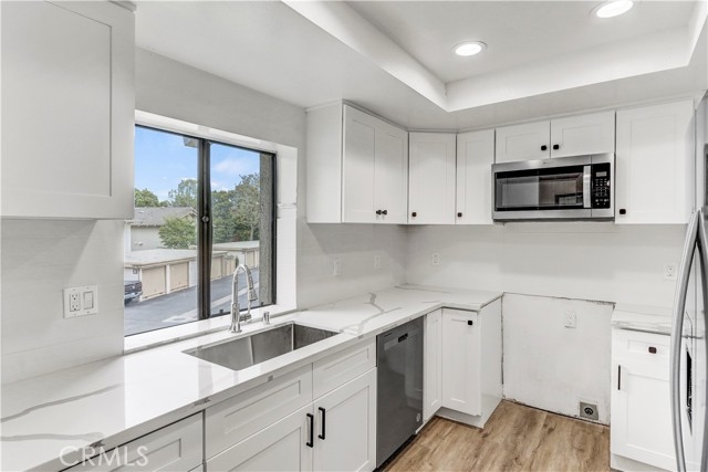 Perfect location! Completely remodeled and updated. New kitchen countertops, appliances, and flooring throughout. New bathrooms with modern features. Two bedrooms, two bathrooms, one car garage - 2nd level condo in desirable 55+ community of Huntington Landmark. Private end-unit tucked away with good access to shops and easy access to the club house. Lots of natural light with an abundance of skylights and broad windows. Large closets and refreshing ceiling fan. Spacious balcony for enjoying the ocean breeze and beautiful grounds. Come live in a resort style community with two heated pools, spa, tennis courts, pickleball courts, putting green, shuffleboard, gym and weight room, guard gated community, ceramic room, wood-shop, library, billiard room, and a multitude of activities. Only 10 blocks from the beach.