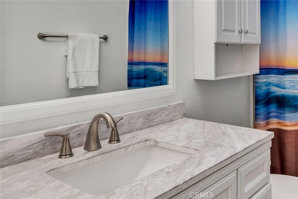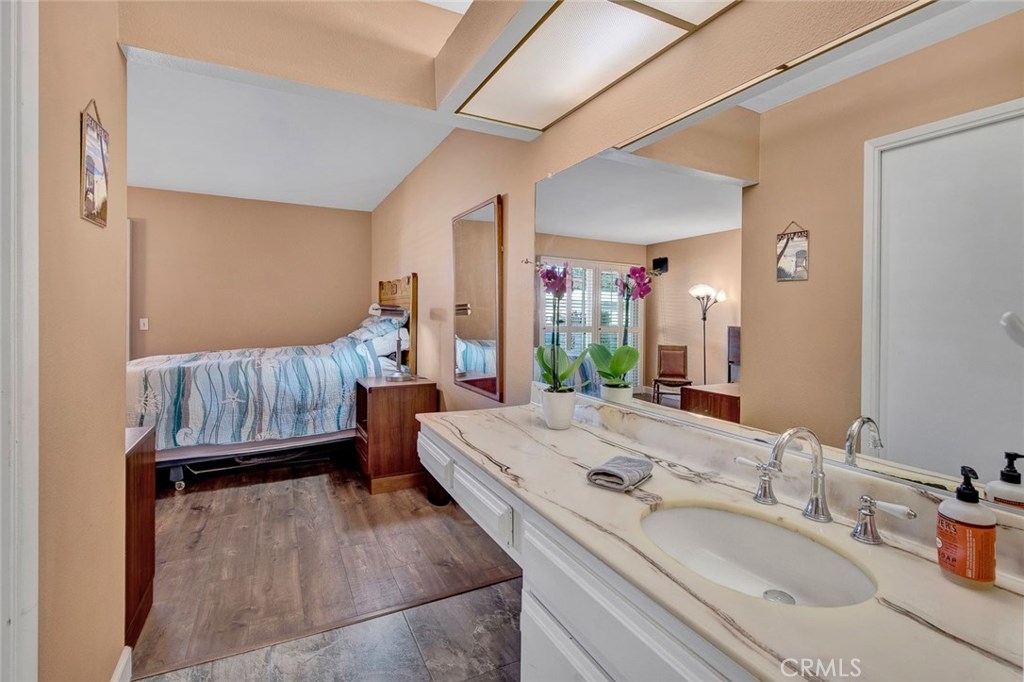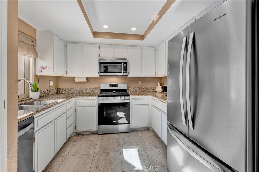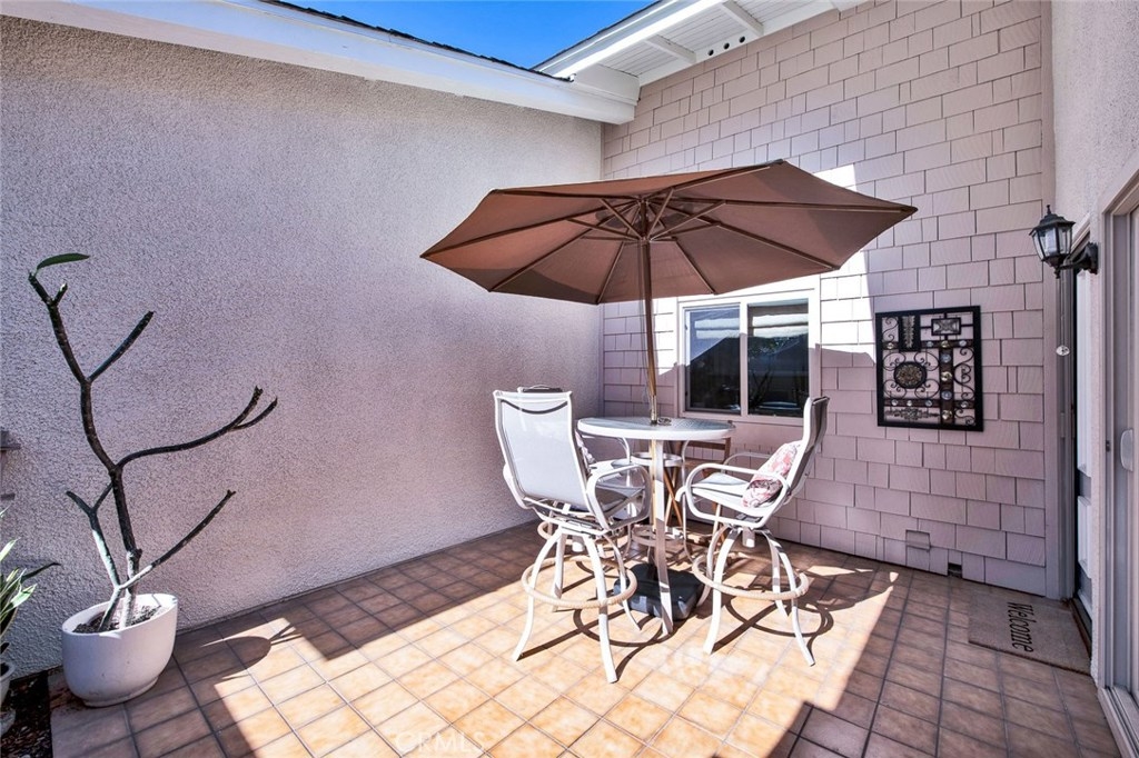 Fabulous upgraded Marina model in the Huntington Landmark 55+ community. New premium laminate flooring with sound deadening underlayment. New upgraded baseboards. Vaulted ceilings in living and dining area. Granite counters on buffet in dining area make a perfect entertaining area. Solar tubes in dining and bathrooms make the rooms light and bright. New windows and sliders. Scraped ceilings throughout. Beautiful kitchen with granite counters, new stainless gas appliances, tile floors and recessed lighting. Refrigerator and new washer and dryer will stay. Laundry closet is inside in the kitchen. New custom vanity in hall bathroom with quartz countertop, new fixtures, Kohler highline toilet, lighting and tile floors. Master suite has a walk-in closet plus a patio with direct access. There is a convenient gate off the patio that leads to parking and the single car garage. Master bathroom has separate room for shower and new Kohler highline toilet and tile floors. Guest bedroom is spacious and has new blinds. Front patio gets plenty of sunshine. The home has been repiped and the furnace is almost brand new. Huntington Landmark floorplan states 1179 Square feet, 2 bedroom 1.75 baths. Move in ready.