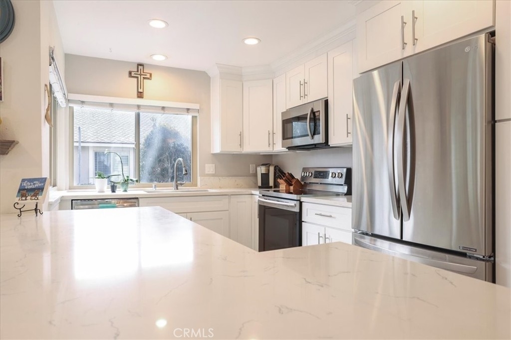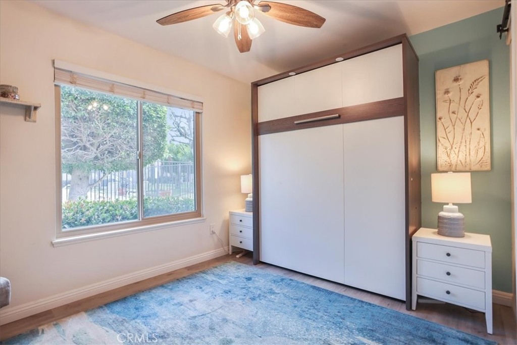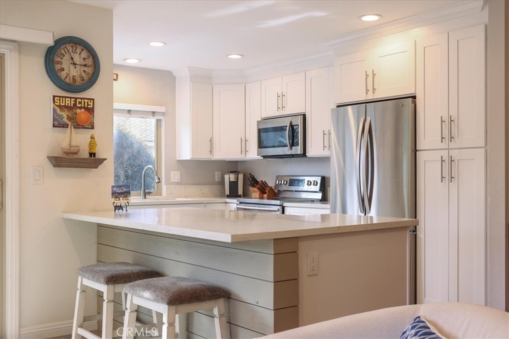 If you’re looking for an interior tract condo in a highly desirable beach close community, then this is the perfect home for you! Located approximately 3 miles from the world famous, white sand beaches of “Surf City”, this nicely remodeled, SINGLE STORY condo offers 2 bedrooms, a ¾ bath and is tucked away on a quiet cul-de-sac. Entering the home, you are greeted by an open floor plan, including a living room with dual sliders to the private back patio and a dining area off the kitchen. Between the great natural light, combined with the neutral-colored laminate floors, this home is warm and inviting. The nicely appointed kitchen has plenty of white shaker style cabinets with soft closing drawers, two lazy susans and quartz countertops, a breakfast bar/peninsula, stainless steel appliances, including a 5-burner electric stove, and recessed lighting throughout. Down the hall from the dining area, there are two bedrooms. A double door entry leads to the spacious master suite that has laminate flooring, a ceiling fan and a walk-in closet with built-ins and a barn door. There is a nicely sized secondary bedroom/office with a Murphy bed, ocean/beach wall mural, ceiling fan and closet barn doors as well. Both bedrooms share a nicely upgraded hallway bathroom with a mosaic tile step-in shower and glass enclosure. Next to the hallway bath is a service room, with a stackable washer and dryer, water heater, central furnace, and direct access to your 2 carports with plenty of storage space! Other upgrades include a nest thermostat, recessed lighting, scraped ceilings, new dual pane windows, slider and security door and hardware, laminate flooring and fresh interior paint throughout, and newer baseboards. Close to award winning schools and Golden West College. A short stroll to Irby Park and Murdy Community Center, as well as world class beaches, and the fine dining, entertainment and shops at Main St, Pacific City and Bella Terra. Also nearby is HB Central Park, library and senior center, HB Sports Complex, the equestrian center, Meadowlark golf course, the Wetlands and Huntington Harbor. Easy access to freeways and PCH. With many recent improvements, enjoy California coastal living at its finest!