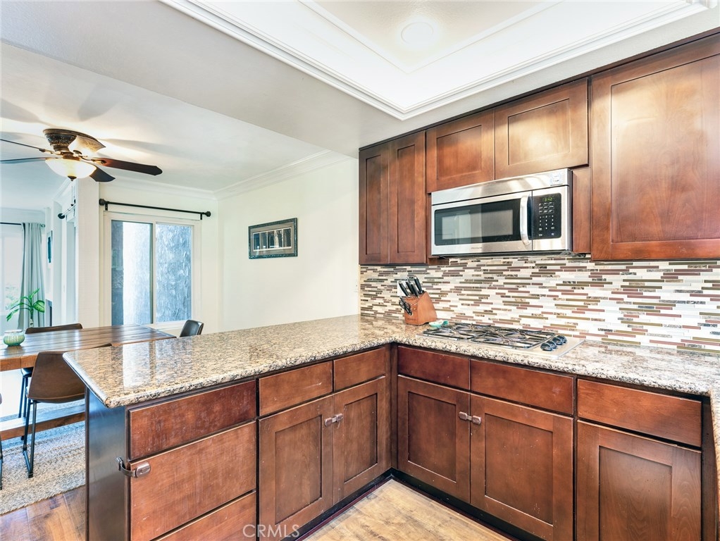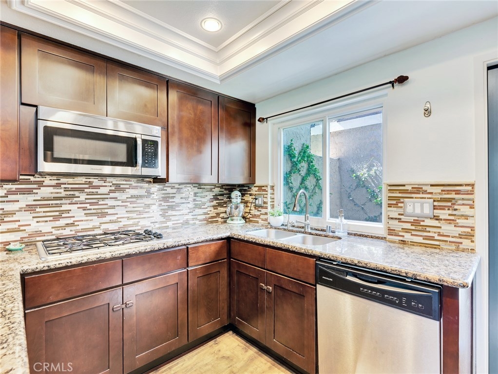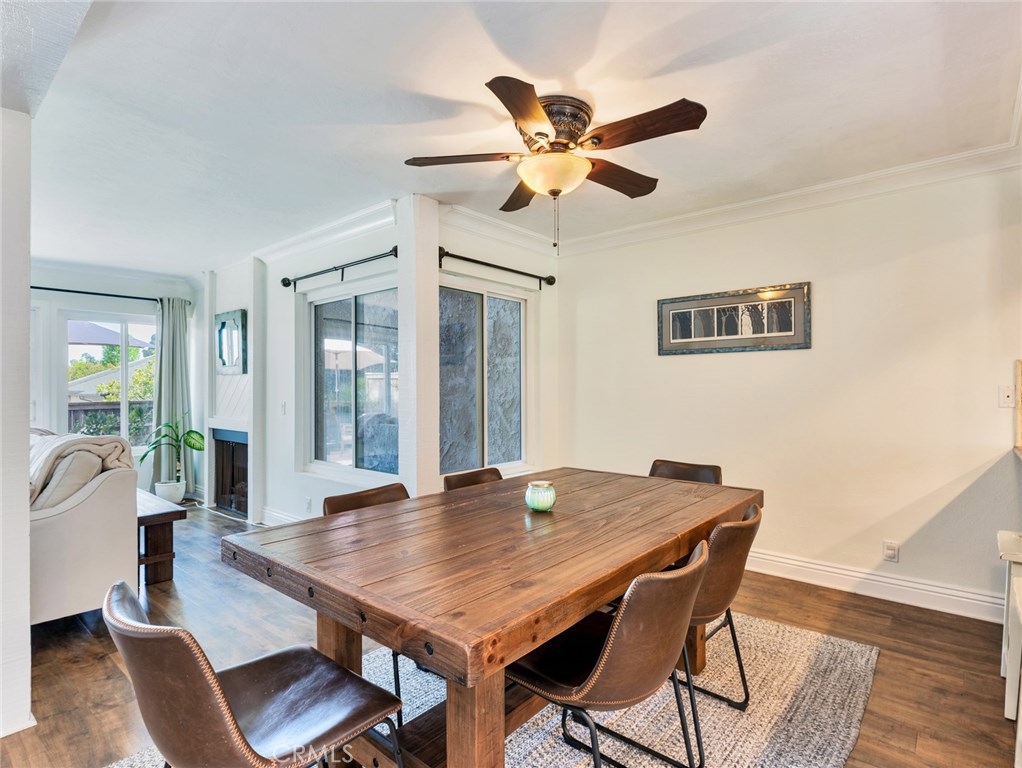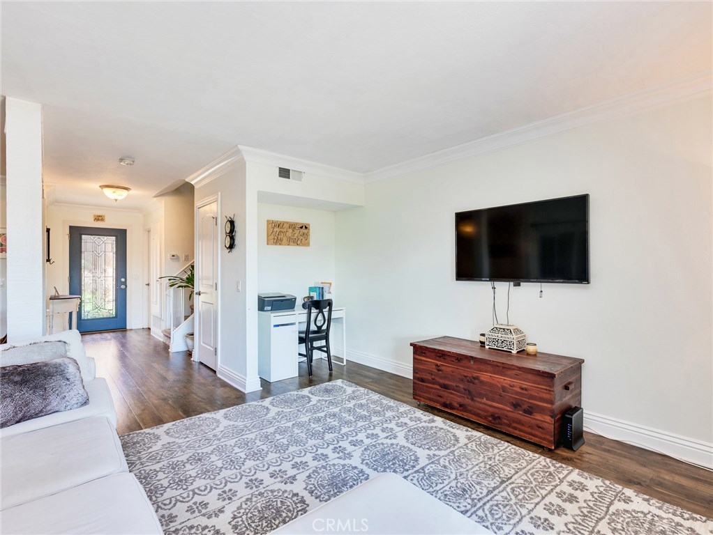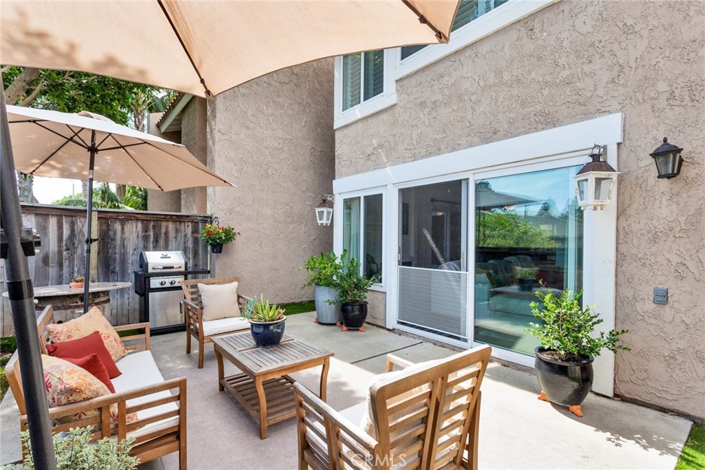 A stunningly bright and airy townhome in the highly sought after development of Huntington Viewpoint offers stylish decor and luxurious living just a few miles from the beach. A private front courtyard and decorative leaded glass front door sets a welcoming tone. Step inside to find a functional living space highlighted by rustic wood floors, Santa Fe doors, large picture windows and a gas burning fireplace. The open concept allows you to cook, eat and entertain with ease. The kitchen has granite tops with decorative splash, updated cabinetry, stainless appliance and a garden window peaking into the courtyard. Ample dining space will host large families. The living room is very spacious allowing for guests to comfortably mingle inside or enjoy conversations on the intimate, open air backyard patio. Sitting slightly above your neighbors, you'll enjoy a private respite from the days activities and a treetop view. Downstairs is completed by a workstation niche and half bathroom. Continuing upstairs, you'll find the master bedroom with vaulted ceiling, plantation shutters, walk-in closet and large oval soaking tub. The Space affords a king size bed as well as a reading space. Secondary bedroom is privately situated with it’s own bathroom. The beautifully maintained HOA boasts sparkling pool and spa, tennis courts plus in a gorgeous public park just across the street. This home has all the makings necessary to start your good life. Info deemed reliable, buyer to verify.
