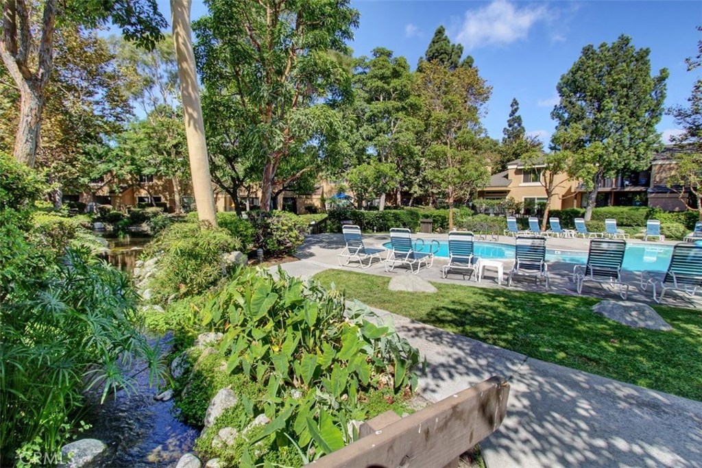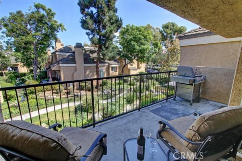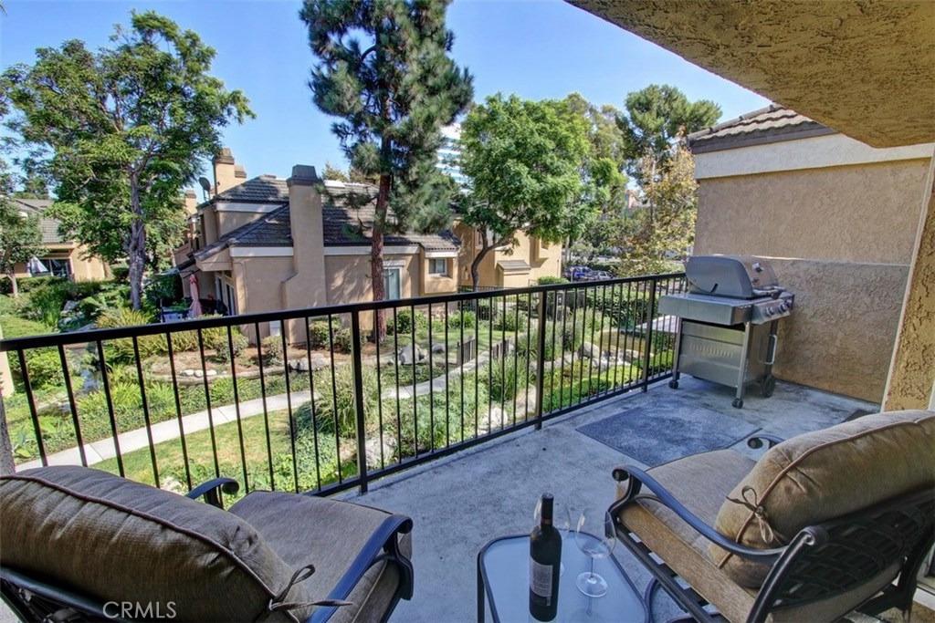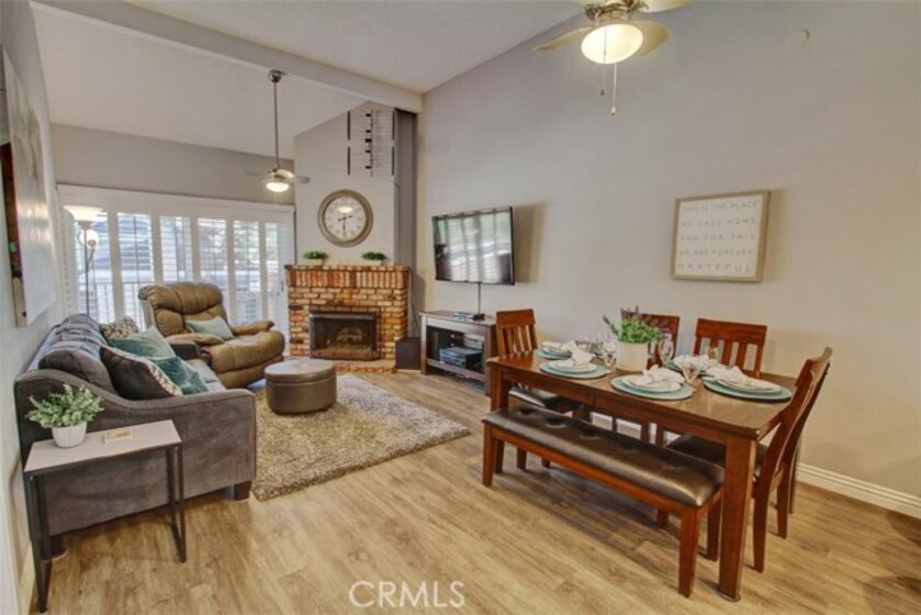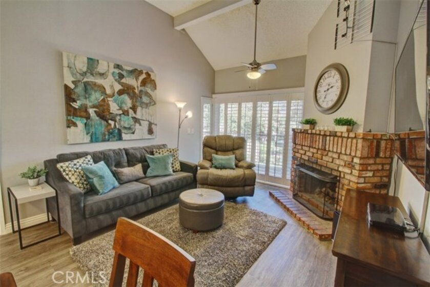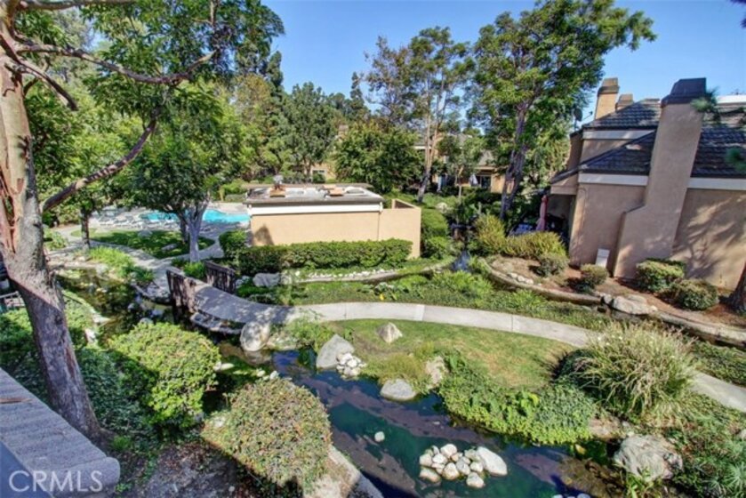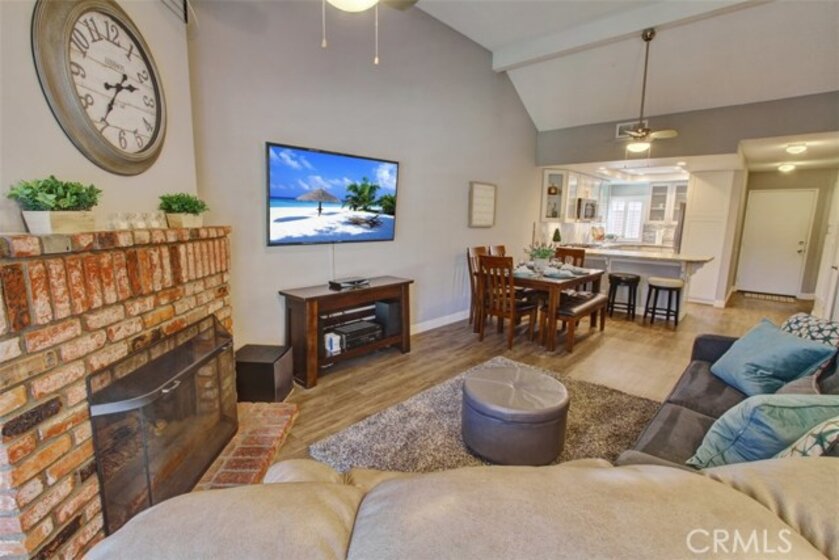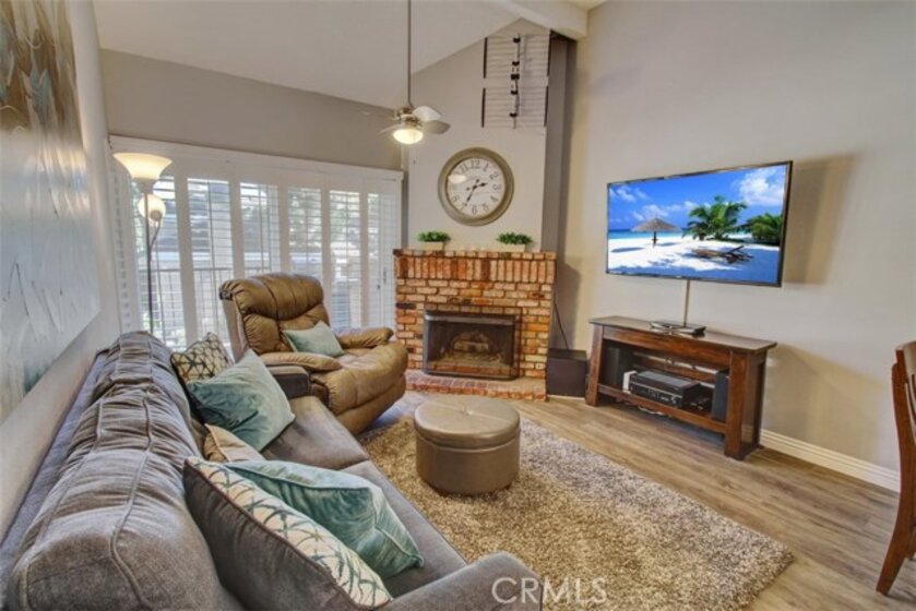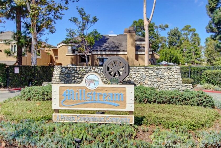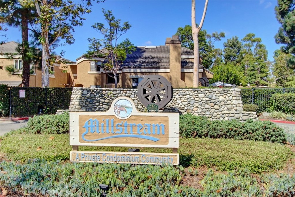 Beautifully upgraded condominium located in the private Huntington Beach gated community of Mill Stream. Kitchen is absolutely gorgeous with leathered quartz counters and backsplash, white custom wood cabinets with glass fronts, and stainless steel appliances. Kitchen with eating bar opens into the living and dining area with high vaulted ceilings which lend a spacious and airy feeling to the home. Living room has a warm brick fireplace and looks out onto the meticulously manicured grounds and babbling streams. Both the living room and master bedroom have plantation shuttered doors which open out to the large balcony, perfect for relaxing and enjoying the soothing and tranquil views. Full size laundry area is conveniently located indoors along with second bedroom and 1.5 customized baths. One car garage has ample storage and has rear door which opens directly to the staircase and entry. Newer: flooring, dual pane vinyl windows, heating and air conditioning. Community amenities include pool, spa and tennis courts as well as relaxing pathways amongst streams and lush landscaping. Centrally located close to shopping, entertainment, parks, beach and freeway access. Must see for yourself!