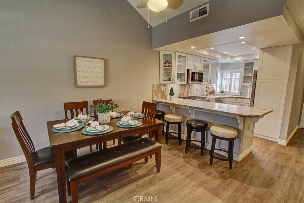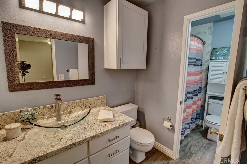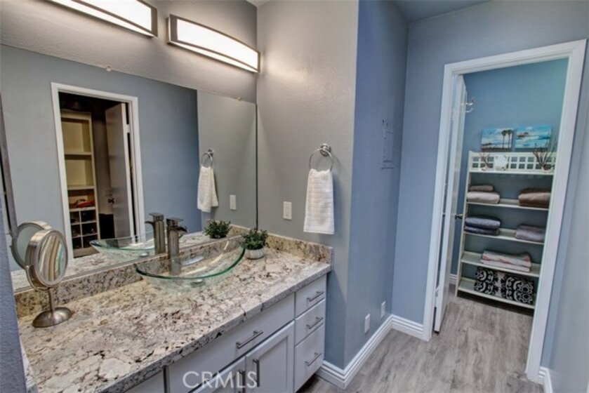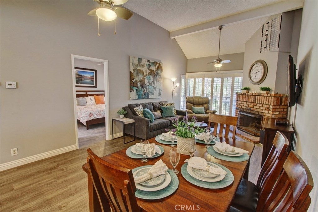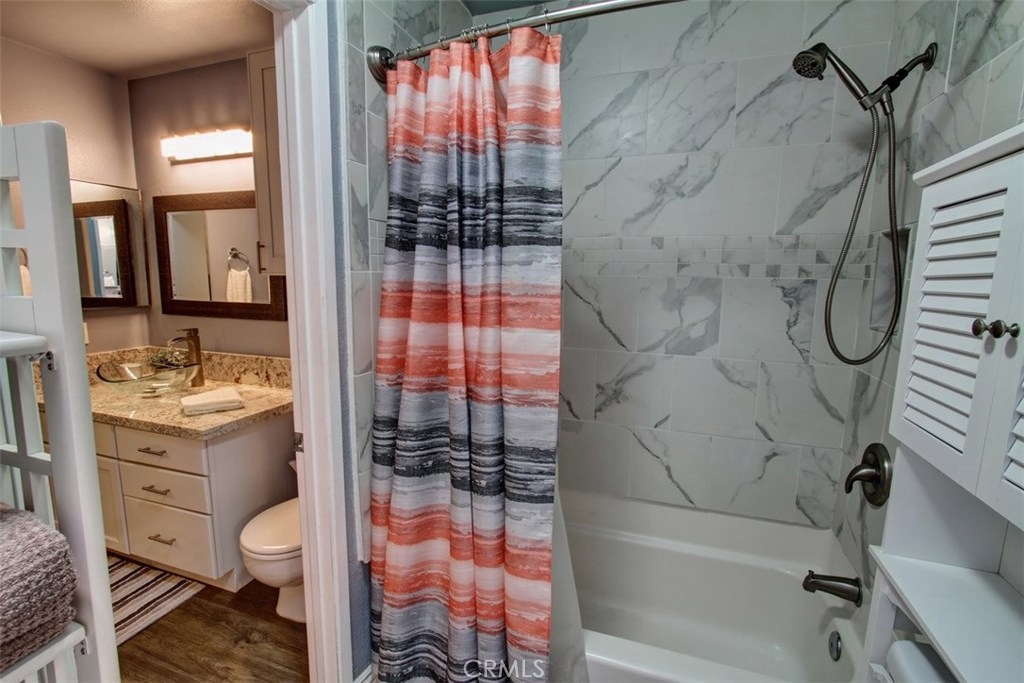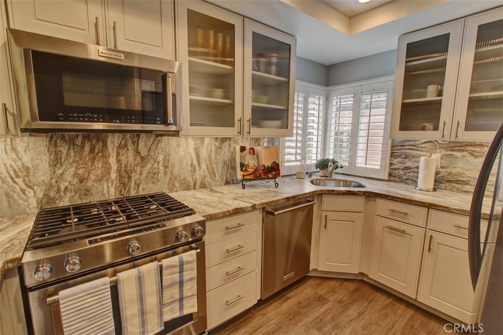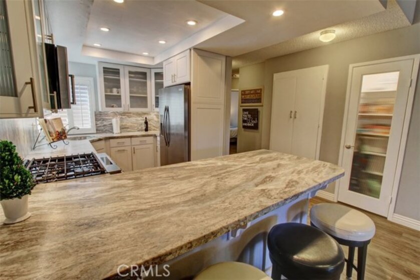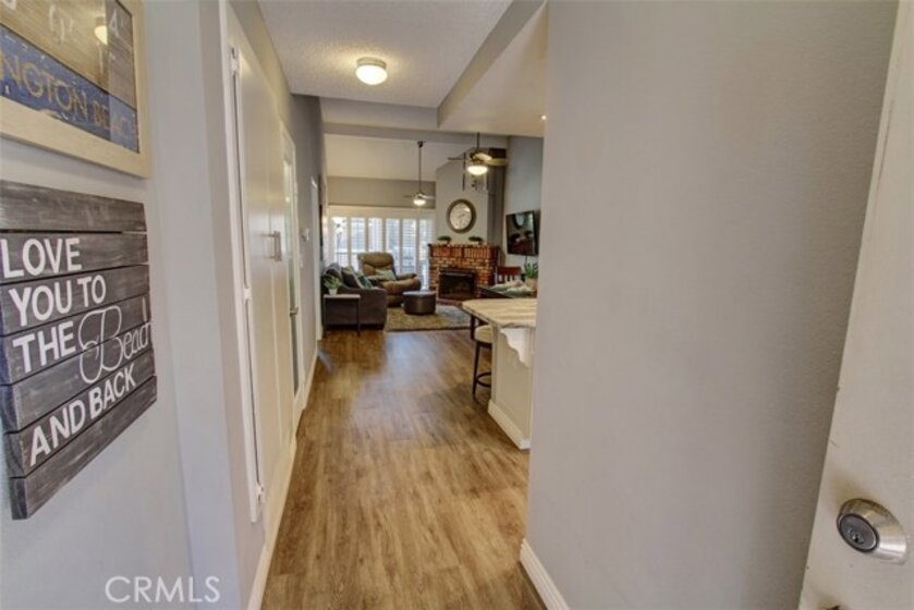 Beautifully upgraded condominium located in the private Huntington Beach gated community of Mill Stream. Kitchen is absolutely gorgeous with leathered quartz counters and backsplash, white custom wood cabinets with glass fronts, and stainless steel appliances. Kitchen with eating bar opens into the living and dining area with high vaulted ceilings which lend a spacious and airy feeling to the home. Living room has a warm brick fireplace and looks out onto the meticulously manicured grounds and babbling streams. Both the living room and master bedroom have plantation shuttered doors which open out to the large balcony, perfect for relaxing and enjoying the soothing and tranquil views. Full size laundry area is conveniently located indoors along with second bedroom and 1.5 customized baths. One car garage has ample storage and has rear door which opens directly to the staircase and entry. Newer: flooring, dual pane vinyl windows, heating and air conditioning. Community amenities include pool, spa and tennis courts as well as relaxing pathways amongst streams and lush landscaping. Centrally located close to shopping, entertainment, parks, beach and freeway access. Must see for yourself!