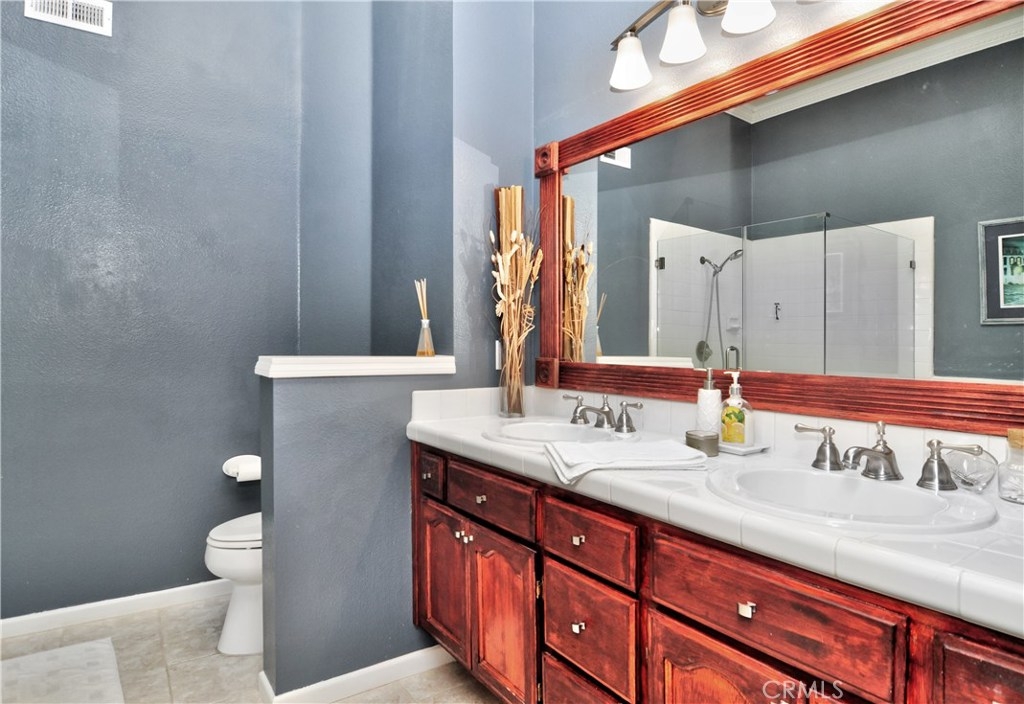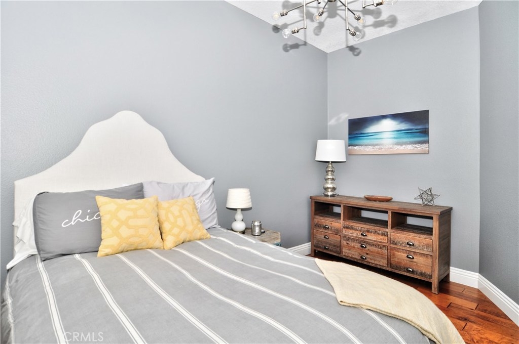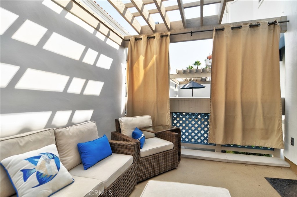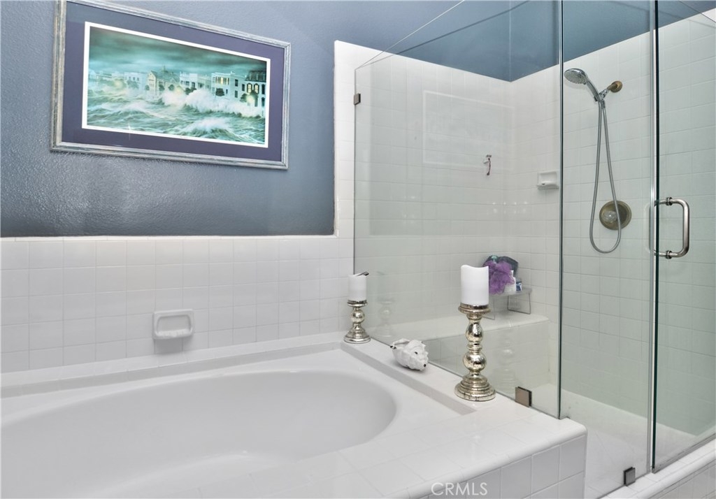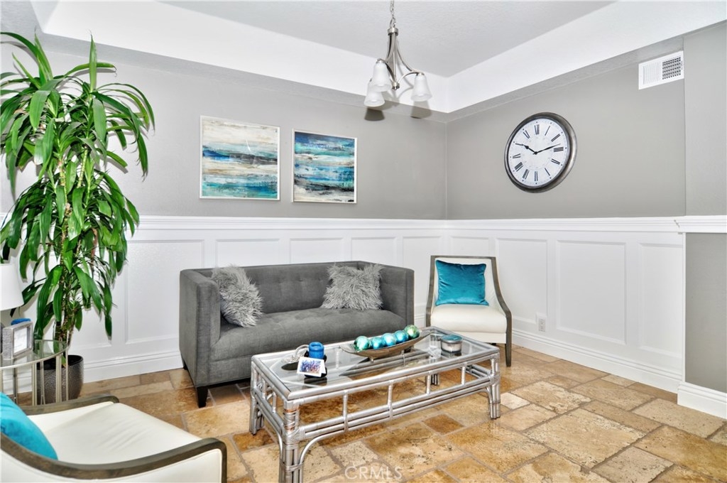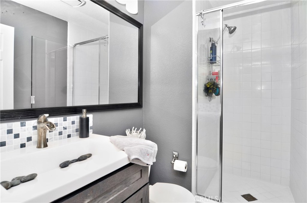 Stunning Barcelona model has been tastefully remodeled throughout and shows like a model home! Elegant home boasts distressed wide plank wood floors, travertine flooring in the kitchen, wainscoting in dining room, custom stone surround fire & ice fireplace in living room, crown moulding, recessed lighting, six panel doors and plantation shutters throughout. Gourmet chef’s kitchen has granite slab counters with custom stacked stone backsplash, soft close drawers and stainless steel appliances. Spectacular kitchen also has Miele espresso machine and GE Monogram 4 burner gas cook top with grill and griddle, two lazy Susan kitchen cabinets and plenty of storage. There is a nice sized patio off of the kitchen with a gas line for a barbeque and an additional large front patio. Lower level has separate laundry room and oversized room with closet for bedroom or bonus room. Large master suite with vaulted ceilings, sitting area, two large closets and sliding door to a private balcony. Large Spa like master bath with separate soaking tub and tile surround shower, and large vanity with dual sinks. Two good sized additional bedrooms upstairs (One bedroom does not have a closet) Great, quiet location in the community, but close to the gate for easy access to the high school, beach, shopping, etc. Community with lush green belts, 3 sparkling pools and spas, and club house.