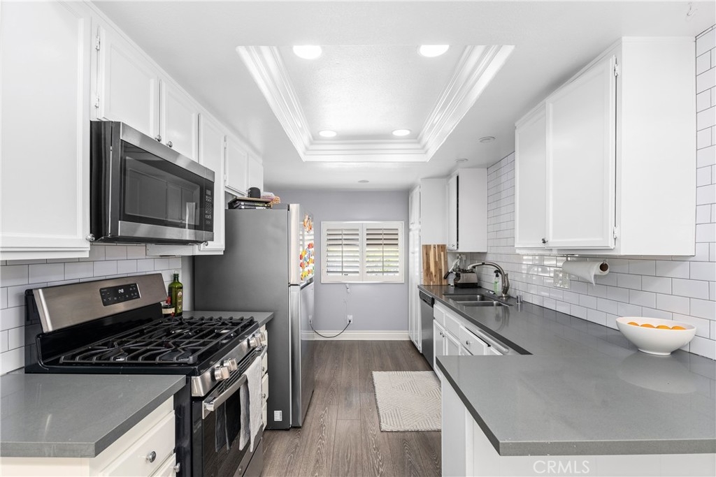 Minutes from the cool surf and warm sand of Huntington Beach, and located in a private gated community of only 18 residences, this tastefully remodeled multi-level townhome with high-end upgrades and a sleek modern aesthetic with designer-inspired architectural details, shows like a model home. Enter through your private walled courtyard with plenty of room for outdoor dining, and step inside. Laminate flooring flows throughout the space, accented by crown moldings, sculpted baseboards, plantation shutters, and a soft monochrome color palette of white and pale grey. You and your guests will enjoy a spacious living room featuring a gas fireplace with striking custom tile surround. An elegant dining area with high ceiling, large skylight, clerestory windows and mirrored wall adjoins a sparkling custom kitchen with quartz counters, full height subway tile backsplash, new stainless steel appliances, bright white cabinets, breakfast nook, tray ceiling, recessed lighting, and access to a patio overlooking the community’s pool. The sumptuous, high-ceilinged main bedroom, located on its own level for ultimate privacy, is filled with light from high windows and features a wall of mirror-door closets, free-standing marble topped European style “boudoir” vanity and adjoining bath with large shower enclosure. The secondary bedroom features a slider with custom plantation shutters leading to a sunny balcony, and the nicely updated secondary bath is easily accessible as a guest powder room. Other amenities include an oversize two-car garage with laundry area and ample guest parking. This truly outstanding turn-key home is perfectly located near a wide array of shopping and dining, three golf courses, lush parks, outdoor recreation, Huntington Dog Beach, and easy access to Beach Blvd and the 405. If you are yearning for the beach lifestyle, this is a must-see.