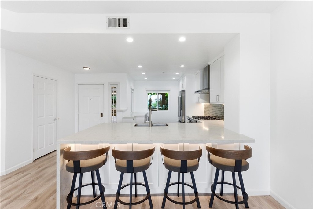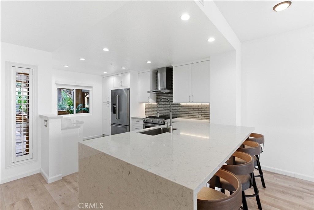WOW! Welcome to this beautiful, single level, corner unit condo in the highly desirable and sought after Portofino Cove in Huntington Harbour. This home features 2 bedrooms and 2 bathrooms, with 1243 sq feet of living space plus a huge semi-wrap around deck which is perfect for morning coffee and evening sunsets while viewing harbor, channel and park views! This home has some fantastic upgrades including recessed lighting, vinyl plank flooring, brand new heating, and dual pane windows. The updated kitchen features quartz countertops, soft closing kitchen cabinets, newer appliances, including a wine refrigerator, as well as a coffee/cocktail counter space plus a breakfast bar open to the living room. The spacious floor plan in this home is perfect for all needs, including private space, shared space and office space. The primary suite includes an en suite bathroom with double vanity and a large walk-in closet. The secondary bedroom has great views and an attached full bathroom. Super giant wrap around patio great for cook outs and watching the sunset. Portofino Cove is resort style living on the water - a premier gated community with a relaxing pool, spa, sauna and outdoor kitchen overlooking the main channel in Huntington Harbour. There are two assigned parking spots in the subterranean parking garage that are close to the elevator and super convenient. Living in Portofino Cove is the ultimate lifestyle..make it yours!