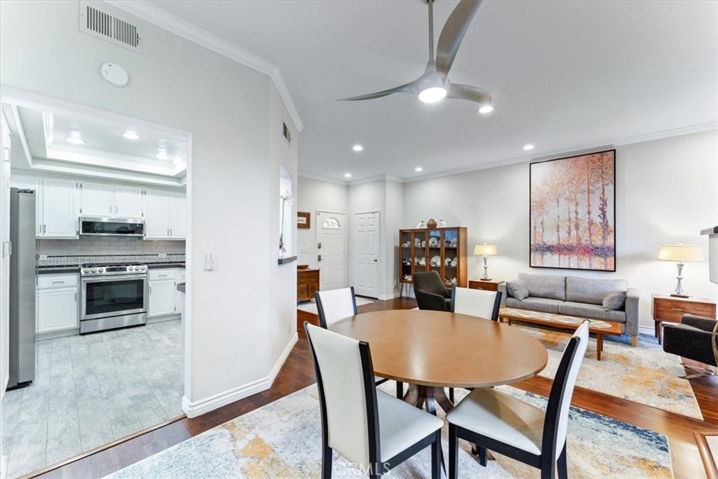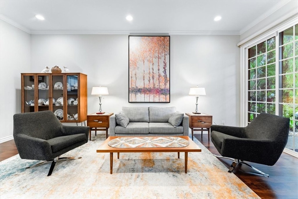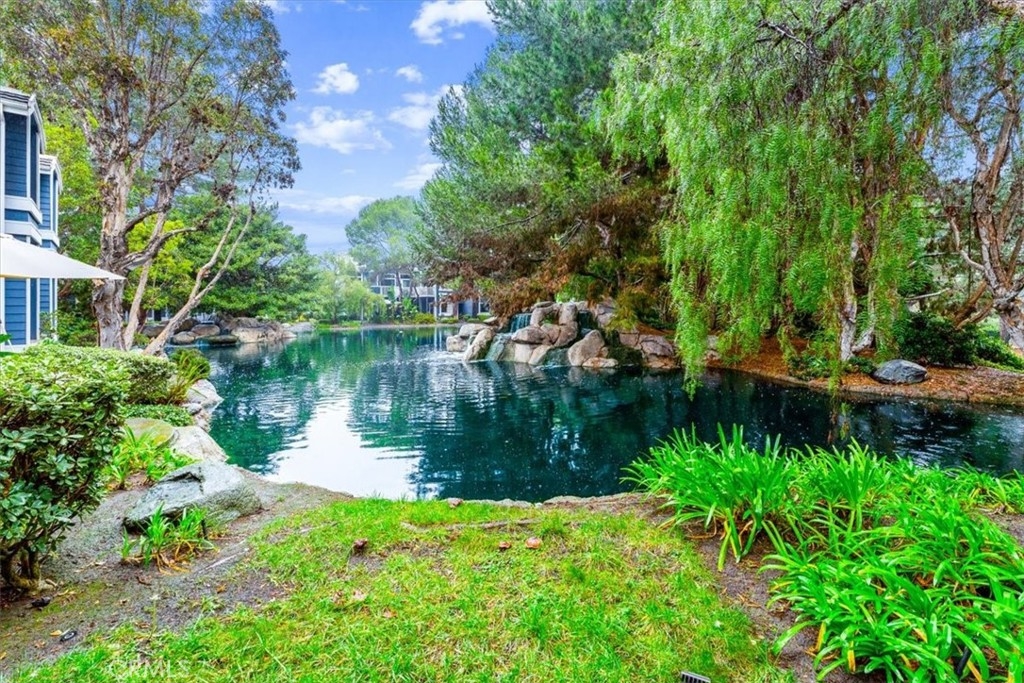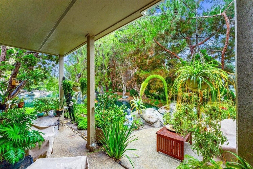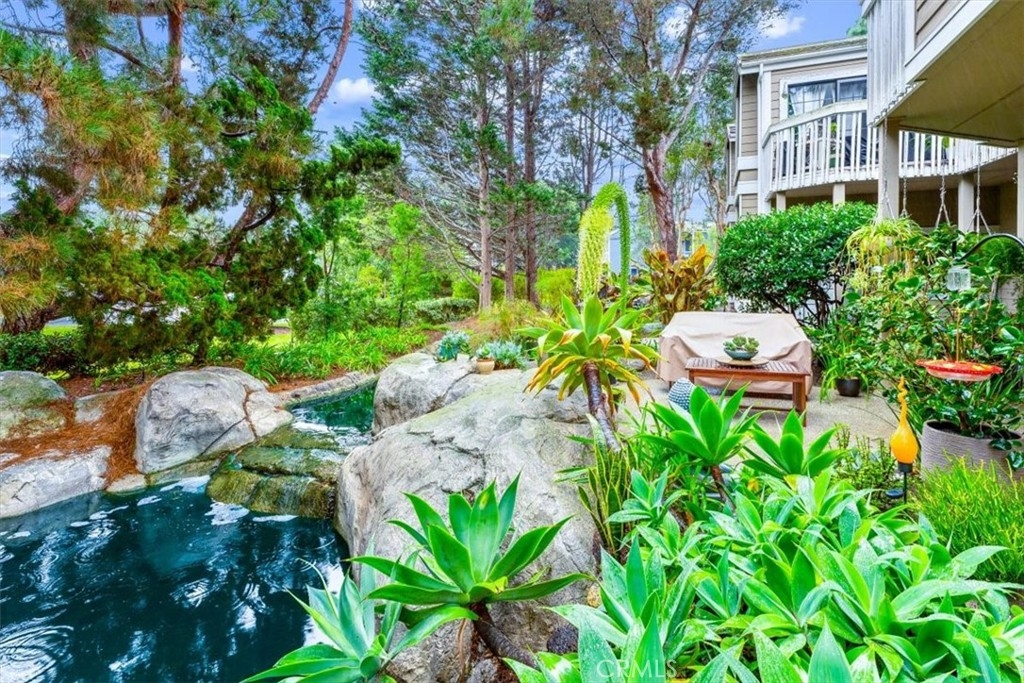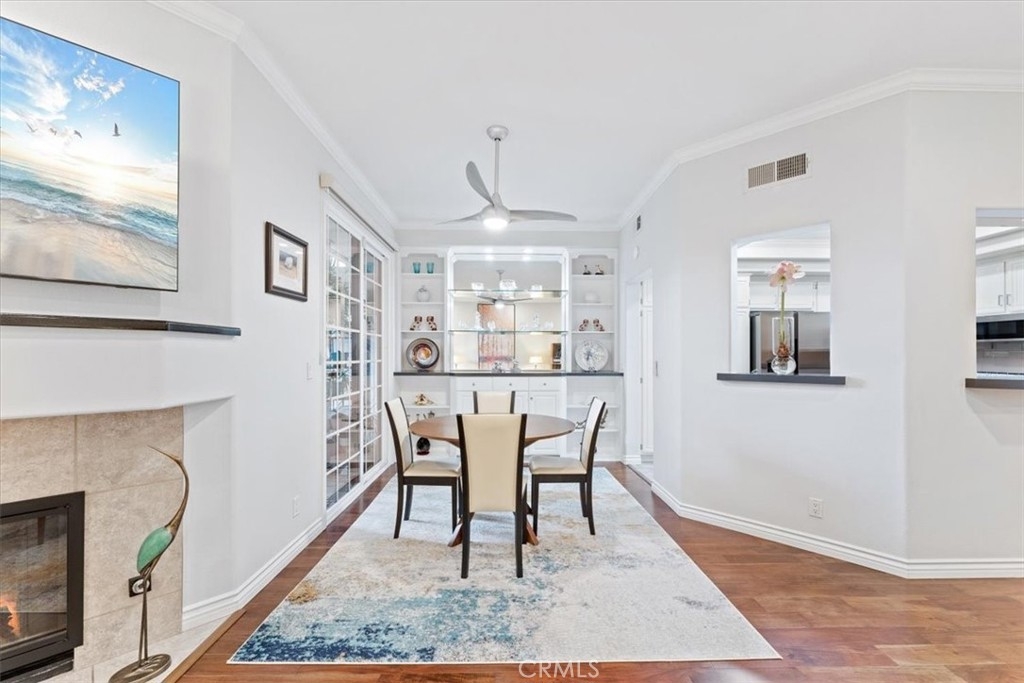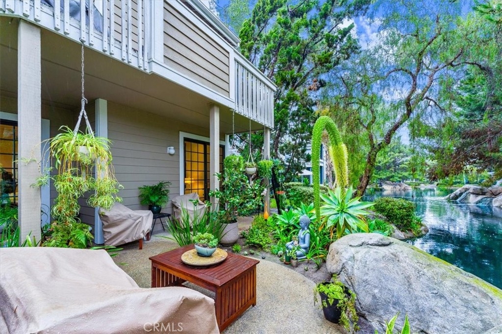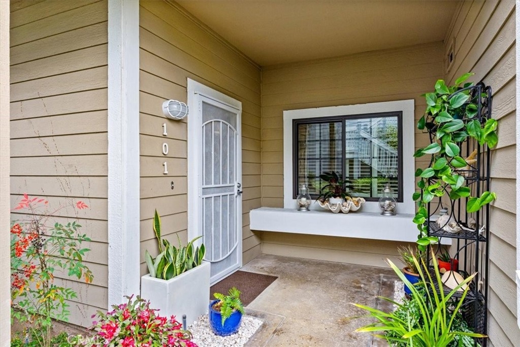 Elevated appointments abound in this Huntington Beach haven located just over a mile from the beach. This 2 bedroom, 2 bathroom end-unit is nestled in a lush garden setting that regularly entertains herons and osprey and provides the owner privacy and tranquility. Wood and porcelain tile flooring, canned lighting and crown molding throughout the unit complement the natural stone and quartz choices for the gas fireplace mantle and surround. The nine and a half foot ceilings and seven and a half foot patio doors give added dimension to the generous family room. All doors and windows are double paned glass. Opening the sliding doors invites the outside in and extends the living space of the family room and dining area on to the patio. In the evening, motorized shades transform this entertainment space into an intimate retreat. The custom built-in buffet lends a dramatic element to the dining area and provides storage as well as an area for displaying treasures. Quartz countertops and marble and glass backsplash are visual delights in the kitchen. Cooks will enjoy the various options afforded by the gas oven, including slow cook, dehydrate, bread proof, and convection as well as the five burner cooktop. The new refrigerator, microwave, dishwasher and pantry cupboard complete this culinary setting. The master bedroom has two double closets and is ensuite with a tiled shower, double sinks and linen closet. The guest bedroom has a double closet and a view of the park. The guest bathroom has an impressive contemporary feel and boasts a soaking tub and shower head with a seven foot height. With ample storage, a garage and parking space, this gem is available for your visit today.