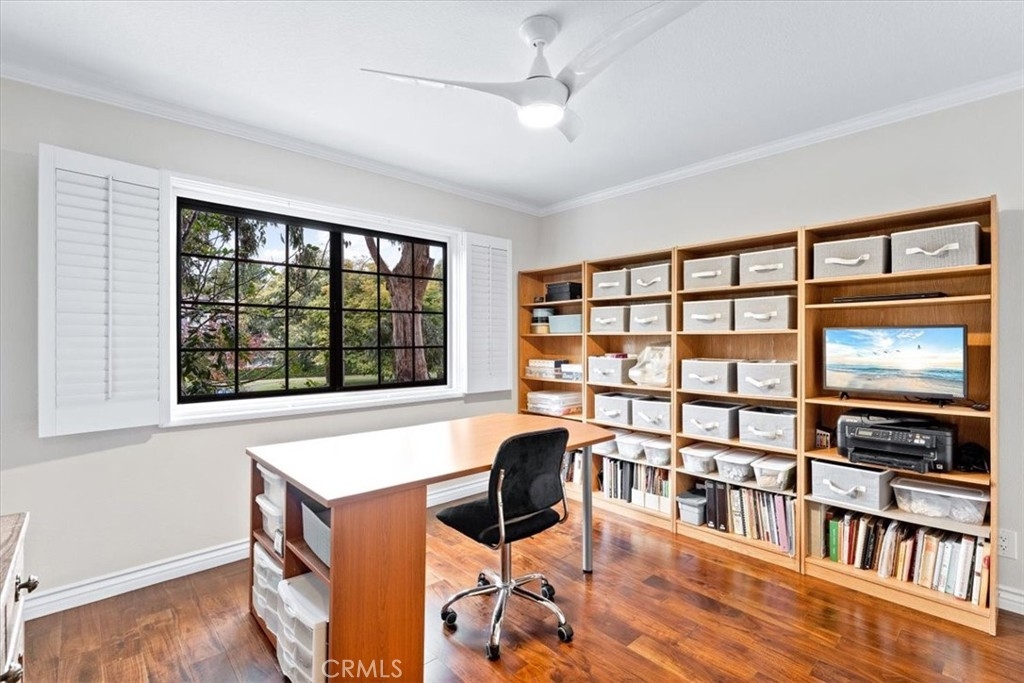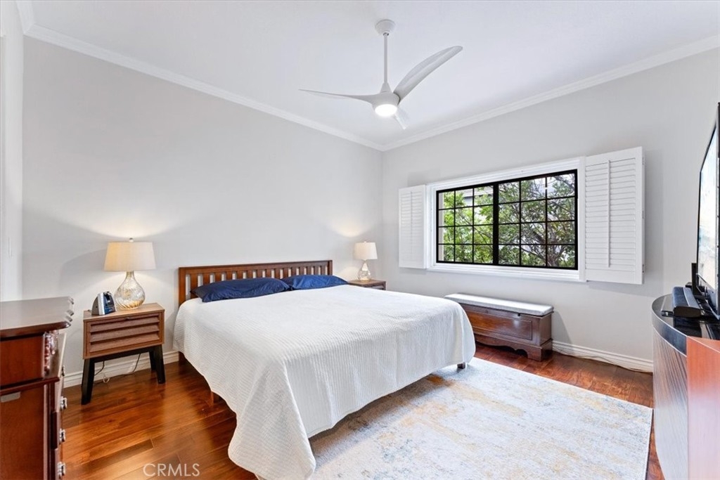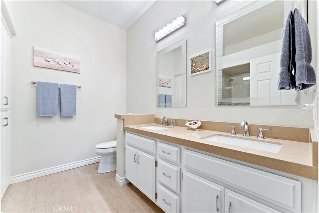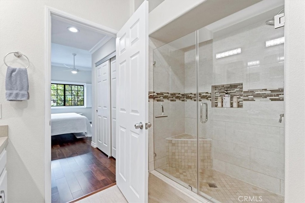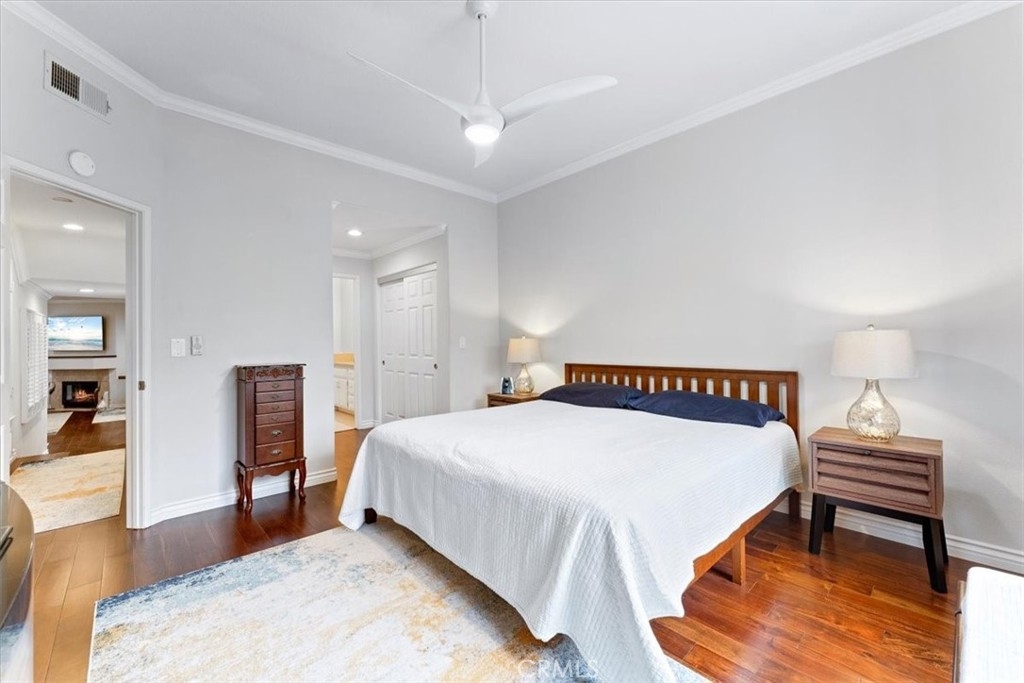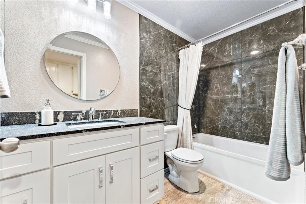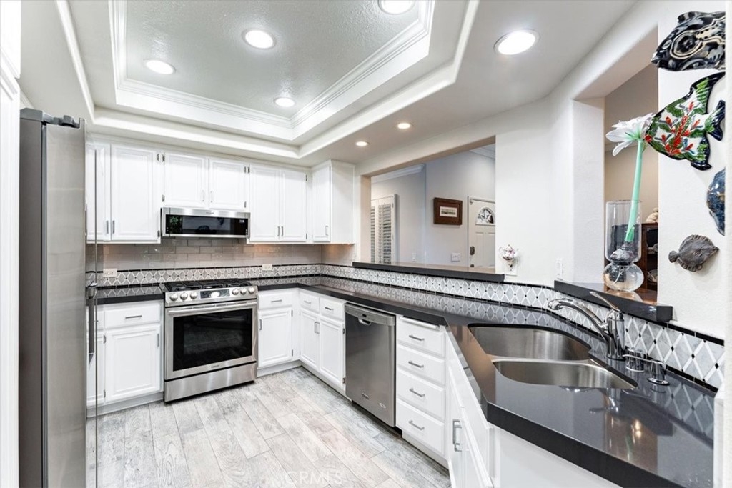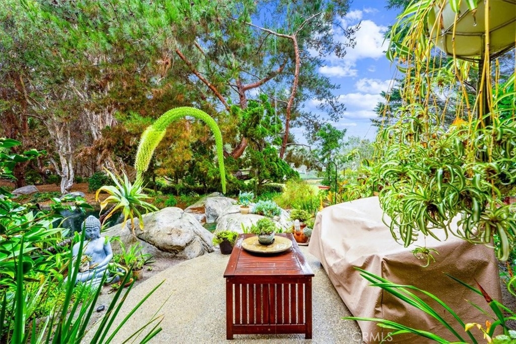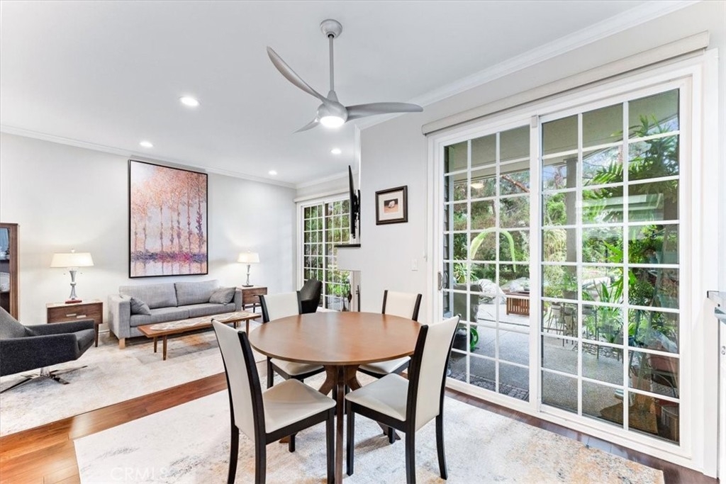 Elevated appointments abound in this Huntington Beach haven located just over a mile from the beach. This 2 bedroom, 2 bathroom end-unit is nestled in a lush garden setting that regularly entertains herons and osprey and provides the owner privacy and tranquility. Wood and porcelain tile flooring, canned lighting and crown molding throughout the unit complement the natural stone and quartz choices for the gas fireplace mantle and surround. The nine and a half foot ceilings and seven and a half foot patio doors give added dimension to the generous family room. All doors and windows are double paned glass. Opening the sliding doors invites the outside in and extends the living space of the family room and dining area on to the patio. In the evening, motorized shades transform this entertainment space into an intimate retreat. The custom built-in buffet lends a dramatic element to the dining area and provides storage as well as an area for displaying treasures. Quartz countertops and marble and glass backsplash are visual delights in the kitchen. Cooks will enjoy the various options afforded by the gas oven, including slow cook, dehydrate, bread proof, and convection as well as the five burner cooktop. The new refrigerator, microwave, dishwasher and pantry cupboard complete this culinary setting. The master bedroom has two double closets and is ensuite with a tiled shower, double sinks and linen closet. The guest bedroom has a double closet and a view of the park. The guest bathroom has an impressive contemporary feel and boasts a soaking tub and shower head with a seven foot height. With ample storage, a garage and parking space, this gem is available for your visit today.