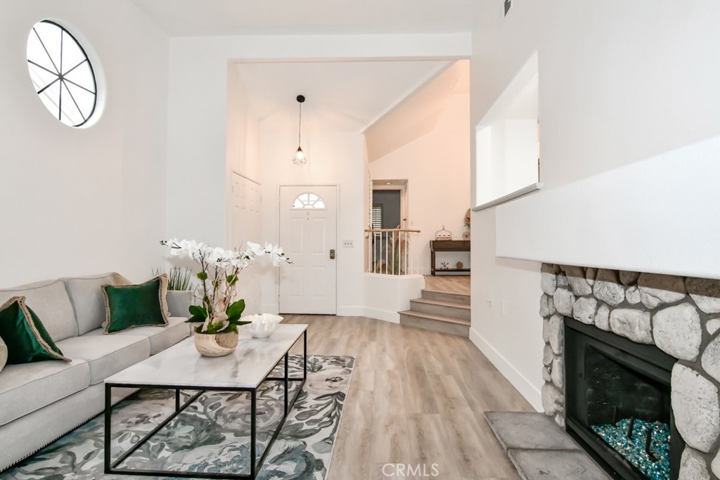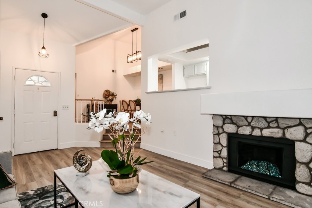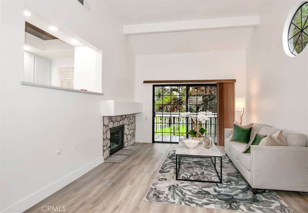 Welcome to luxury living just a 1.5-mile stroll from the beach! Discover this stunning top-floor 1 bed, 1 bath condo nestled in the guard-gated Seabridge community. As you step inside, you're greeted by an airy open floor plan accentuated by vaulted ceilings, sleek new vinyl plank flooring, and freshly painted walls and ceilings. The living room, with its cozy stone fireplace and modern touches, opens onto an expansive deck. This outdoor haven, complete with storage, offers breathtaking views of water features and lush green belts, all with the soothing backdrop of waterfall sounds, ensuring privacy and serenity as there are no condos directly behind. The kitchen shines with a brand-new gas range and oven, quartz countertops, updated cabinetry, and new electrical work, including 6 LED canned lights. An opening overlooking the living room makes this space perfect for entertaining. The generously sized primary suite, features a versatile nook ideal for a home office. The bathroom, freshly painted, includes a dual-sink vanity, new lighting, tile floors, and a walk-in closet with ample storage. Additional highlights include a formal dining area with a new chandelier, an in-unit laundry closet, custom shutters, and vertical blinds in the living room. Unique to this condo are the oversized 1-car garage and a private car pad, offering two exclusive parking spaces amidst ample community parking. Enjoy access to the array of luxurious amenities Seabridge offers: four pools, spas, a sauna, tennis courts, green belts, racquetball, onsite security, and beautifully maintained landscaping. The HOA covers water, trash, sewage, guard gate, and security. Seize this incredible chance to own a prime location within the community!