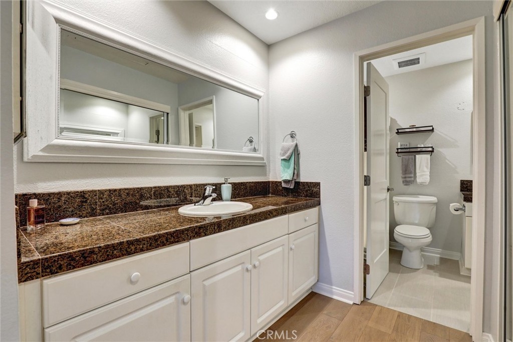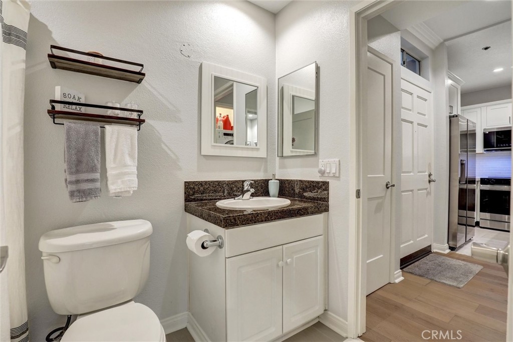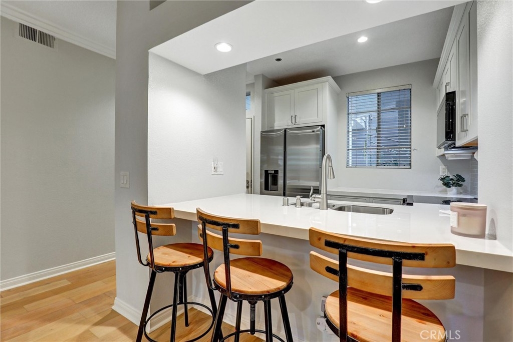 Beautifully Upgraded 1-Bedroom Condo in Seabridge. Don’t miss this rare opportunity to own a beautifully updated ground-floor 1-bedroom condo in the highly desirable Seabridge Community, just 1 mile from the beach! Step into a bright and welcoming space featuring a fully remodeled kitchen with sleek stainless-steel appliances, quartz countertops, and generous cabinetry. The home showcases elegant wood flooring, crown molding, recessed lighting throughout, and the added convenience of in-unit laundry. The spacious primary bedroom offers a custom-designed walk-in closet and direct access to one of two large private patios through sliding glass doors. The open concept living room also opens to the outdoor space, ideal for relaxing or entertaining. The upgraded bathroom is finished with granite counters and modern fixtures. Enjoy the convenience of two dedicated subterranean parking spots and access to premium community amenities, including two pools, two spas, a clubhouse with a full kitchen for gatherings, a sauna, four tennis courts, bike storage, and serene pathways lined with trees, waterfalls, and ponds. Seabridge is a 24-hour guard-gated community located just minutes from Pacific City, top-rated schools, shopping, dining, and the stunning Huntington Beach coastline. This is coastal living at its best—schedule your private showing today!