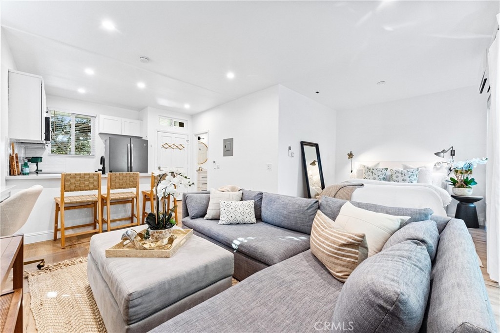 Experience coastal living just 1.5 miles from the sandy shores of Huntington Beach in this beautifully remodeled studio in the prestigious guard-gated Seabridge community. This unit offers over $25,000 in upgrades! This bright and open-concept end unit features luxury vinyl plank flooring, recessed lighting, a split AC unit, and new energy-efficient windows and doors. The designer kitchen is a showstopper with quartz countertops, shaker soft-close cabinets, subway tile backsplash, newer appliances (all included!), and a counter bar that opens seamlessly to the living space. The living area boasts hidden TV hookups, recessed lighting, and a custom-built farmhouse desk in its own cozy nook. An extra window floods the space with natural light, while the private balcony offers serene views of streams, waterfalls, and lush tropical landscaping, complete with a storage closet. The updated bathroom shines with a modern vanity and fixtures, plus a spacious walk-in closet with a stackable washer and dryer (included!). A newly upgraded electrical panel ensures modern convenience. Enjoy resort-style amenities including multiple pools, spas, a clubhouse, gym, tennis courts, sauna, park, and assigned subterranean parking with elevator access. HOA fees cover water, trash, and sewer. This Huntington Beach gem is a rare find—don’t miss the opportunity to call it home!