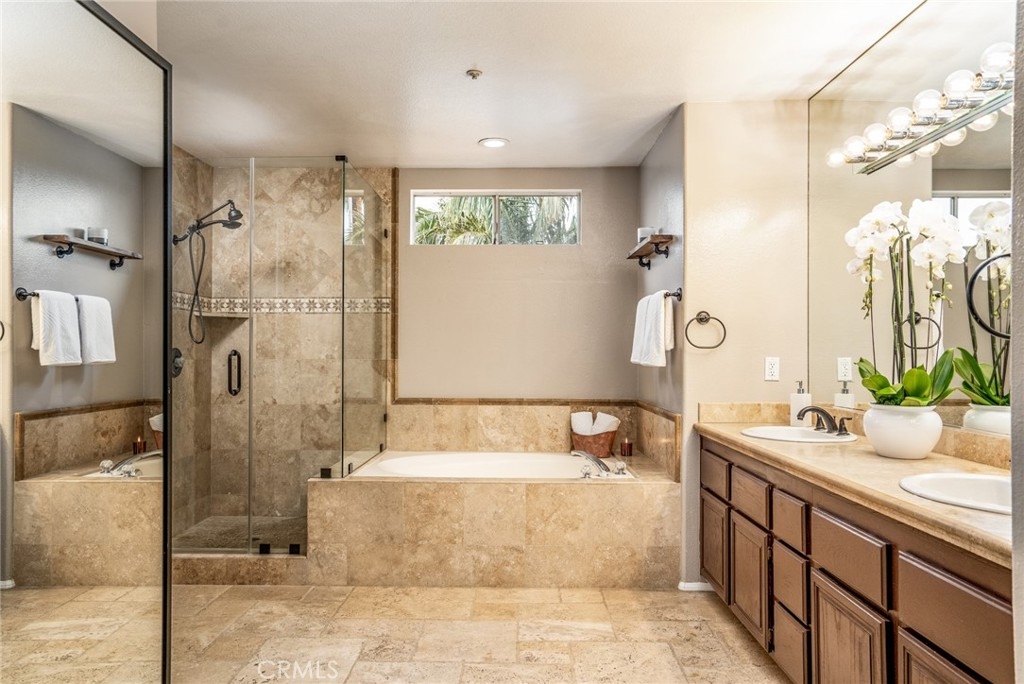 You're going to LOVE, LOVE, LOVE living in the quiet gated community of Seacliff Palms! This amazing, light-filled end unit townhome is located within the greater Seacliff area and is in a prime location near all of HB's most desired amenities. With only 32 attached properties in the development, you'll appreciate the tranquility and quality of life of the neighborhood. This wonderful home features beautiful engineered wood & tile floors, central air conditioning, bull-nose corners, smooth ceilings, recessed lights, elegant baseboards, plantation shutters, and dual pane windows & sliders throughout. The upgraded kitchen features granite counters & breakfast bar, stainless steel Frigidaire & Whirlpool appliances, and loads of storage cabinetry & pantry. This home boasts almost 1,800 sqft. and is the largest model in Seacliff Palms. This extremely desirable floor plan offers two large master suites that are completely distanced from each other (perfect for privacy) and each has their own ensuite bathroom. The upstairs bedroom suite offers two closets (including one large walk-in) and huge ensuite bathroom w/separate tub and frameless glass walk-in shower, high-end tumbled tile, travertine tile, dual sinks, and designer fixtures. This home has a private gated entrance and sunny wraparound patio w/lots of space for furniture, BBQ, and gardening. The 2 car attached garage has direct access, and features storage cabinets and included washer/dryer. This community features a heated pool & spa perfect for rest and relaxation. This home has everything you're looking for... a very safe, gated community w/awesome location & neighbors. This home is part of the Huntington Beach High (rated 9) and Seacliff Elementary (rated 9) School District. Five Points shopping center & Trader Joe's is located across the street. 350 acre HB Central Park & Library, The Equestrian Center, HB Sports Complex, Disc Golf Course, Meadowlark Golf Course & Club, HB Pier & Shops/Restaurants, and the ocean are just minutes away!