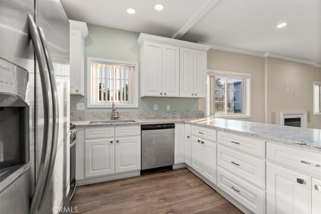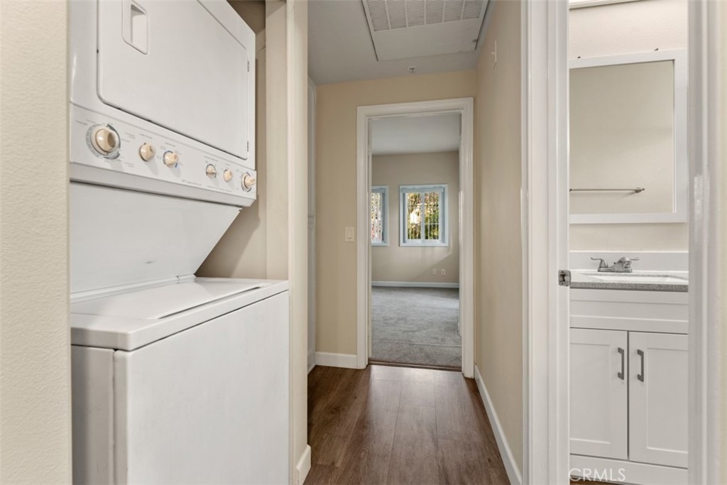 Beautiful Huntington harbor well maintained second floor unit. 3 bedroom, 2 bath, air conditioned accompanied with 6-panel doors and dual paned energy efficient windows that are easily maintained and provide for a light/bright space throughout. Do not miss out on this opportunity! Brand new wood flooring installed in entry, kitchen and living room, upgraded kitchen with shining new appliances, stackable washer and dryer hookups. Easy to maintain commercial grade low pile carpeting in bedrooms. Private and quiet unit, that has been very well taken care of by previous owners who spent minimal time in the unit. The balcony of the master provides for a peaceful view of the pool, spa and clubhouse. No attached parking but there is gated underground parking with 2 assigned spaces and plenty of street parking for guests. Great location in northern Huntington Beach, close to the harbor and conveniently within walking distance to the Trader Joes!