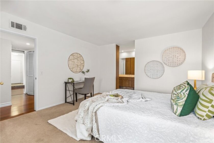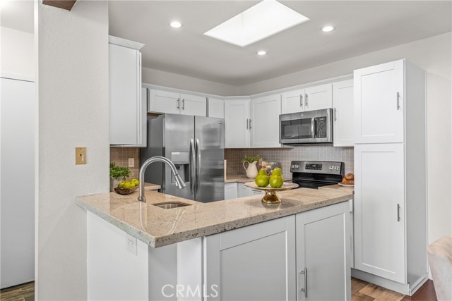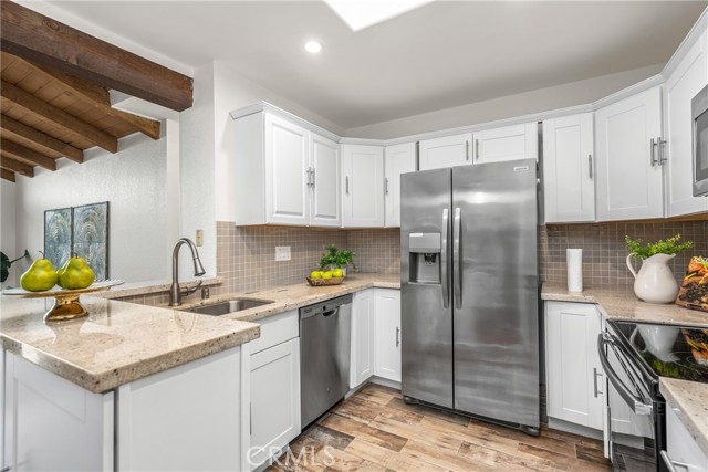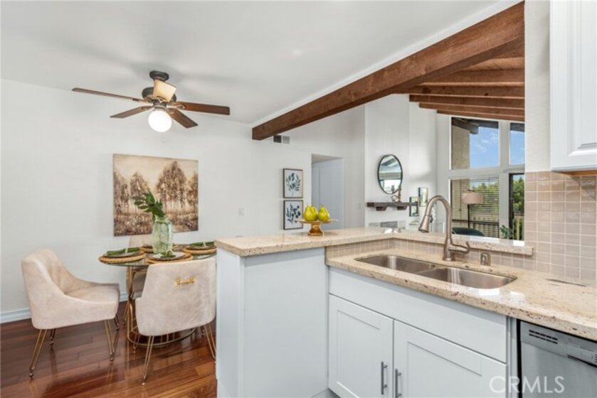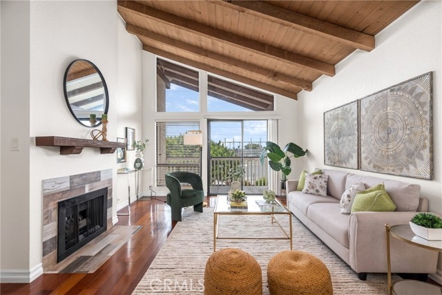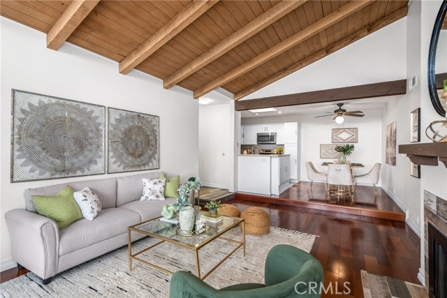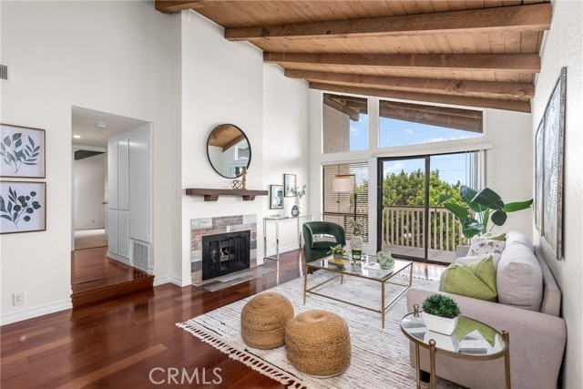 Don't miss out on this stunning two-bedroom, two-bath condo in Huntington Beach! This property features bright white cabinets, quartz countertops, and laminate flooring throughout. The kitchen is equipped with stainless steel appliances, including a refrigerator. Enjoy the spaciousness with cathedral beamed ceilings and two balconies—one off the primary suite and another accessible from the open living room. Convenience is key with a laundry closet that includes a washer and dryer. The HOA amenities are extensive, offering a sparkling pool, spa, picnic areas, tennis courts, clubhouse access, gas, outside maintenance, water, and controlled access within this gated community of Huntington Beach. This listing combines modern comforts with community amenities, making it an ideal choice for those seeking a vibrant coastal lifestyle in Huntington Beach.
