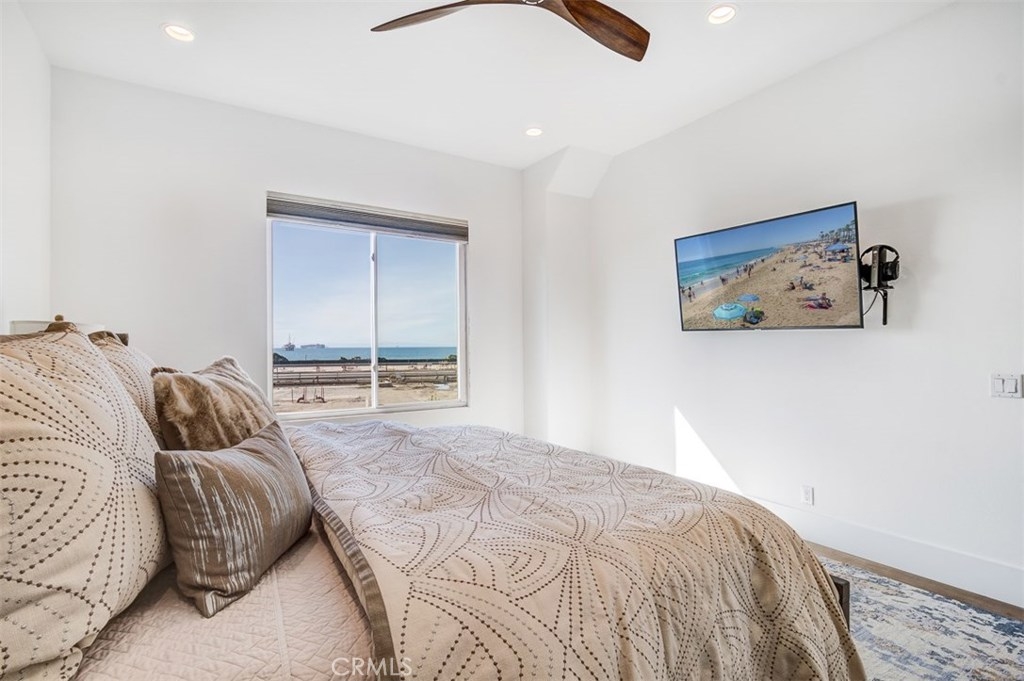 Located just steps to the surf and sand of Huntington Beach, this flawless home in the gated Surfcrest community is beach-close living at its finest! This stunning beach-close home has been meticulously upgraded and offers breathtaking panoramic ocean views that can be seen from the second and third levels. Enjoy the crisp ocean breeze in your spacious family room, or relax on your enclosed front patio. The entry greets you to custom beachwood flooring, leading to the incredible chef's kitchen, upgraded with a massive quartz center island with room for seating, quartz countertops and backsplash, top-of-the-line stainless steel appliances, custom wood panel ceilings with recessed lighting, and soft-close cabinets. The formal dining area offers access to the balcony, and the living area comes with a massive 80" inch TV, perfect for watching the game with family and friends. Upstairs you'll find the master bedroom with sweeping ocean views and the attached master bathroom is equipped with separate sinks, a huge shower with quartz surround, and a walk-in closet. Off the hallway you'll find two sizable guest bedrooms and a full bathroom with dual sinks. Located close to award-winning schools, eateries at Pacific City and Main Street, and just moments away from the beach, this contemporary upgraded home is a must-see!