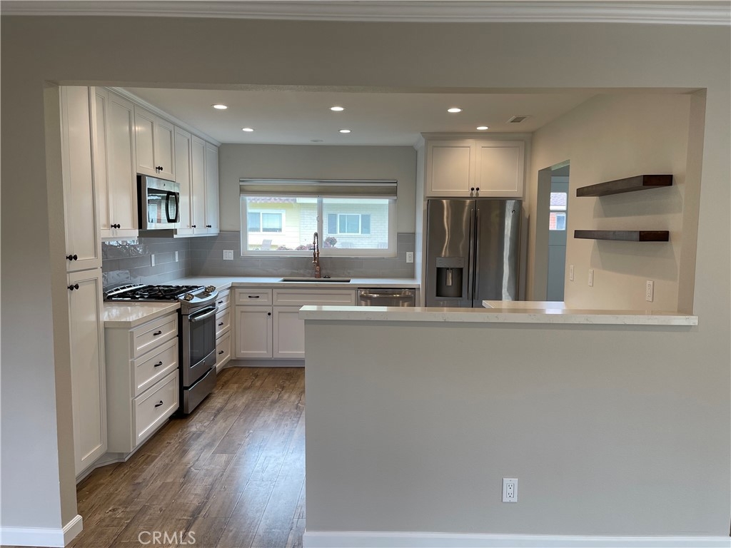 Extremely desired, and rarely on the market, charmingly updated three bedroom Surfside-by-the-Sea home. Adorably nestled in an interior location facing a green belt this is a home you won't want to miss seeing. From the moment you enter through your newly installed front, or back door, you will feel at home. The kitchen is light, airy and filled with custom white cabinets, beautiful quartzite countertops, soothing gray tile backsplash, GE appliances and custom touches like wood floating shelves for extra storage or display. The laminate floors expand through your entire first level and help maintain the open feeling of your first floor. In your open family room sits a cozy, white brick fireplace, perfect for those chilly beach nights. On the second floor you will find three spacious bedrooms, with custom Container Store closet systems, thoughtfully planned for maximum space and storage, a full bathroom with tiled shower/tub combo and granite countertop. Upstairs is also where you will find your laundry nook, complete with front load stackable GE washer and dryer. The back patio gets plenty of sunshine and has been redone with pavers and is perfect for entertaining family & friends or just soaking up the Cali sun. Surfside-by-the-Sea's resort like amenities include two pristine pools, a playground, sports court, clubhouses and tons of greenbelts with lush trees throughout. Surfside is a sought after location that is walking distance to the beach, Pacific City, downtown Main Street, restaurants, shopping, entertainment and bike trails! The home is close to highly rated schools and has low HOA's. You will not want to miss out on making this adorable home yours!!