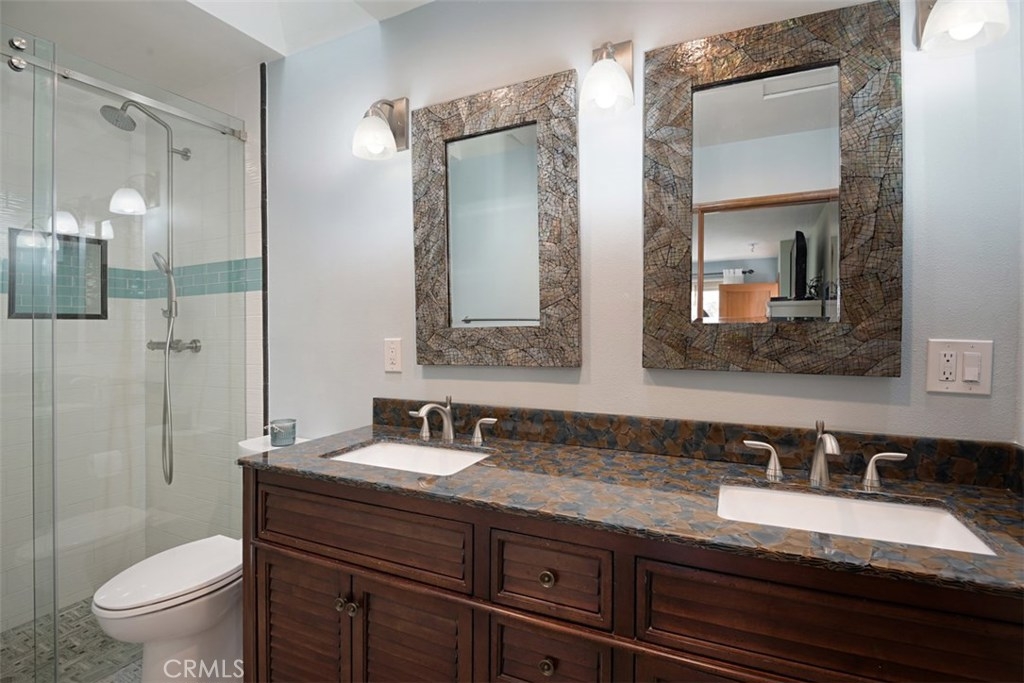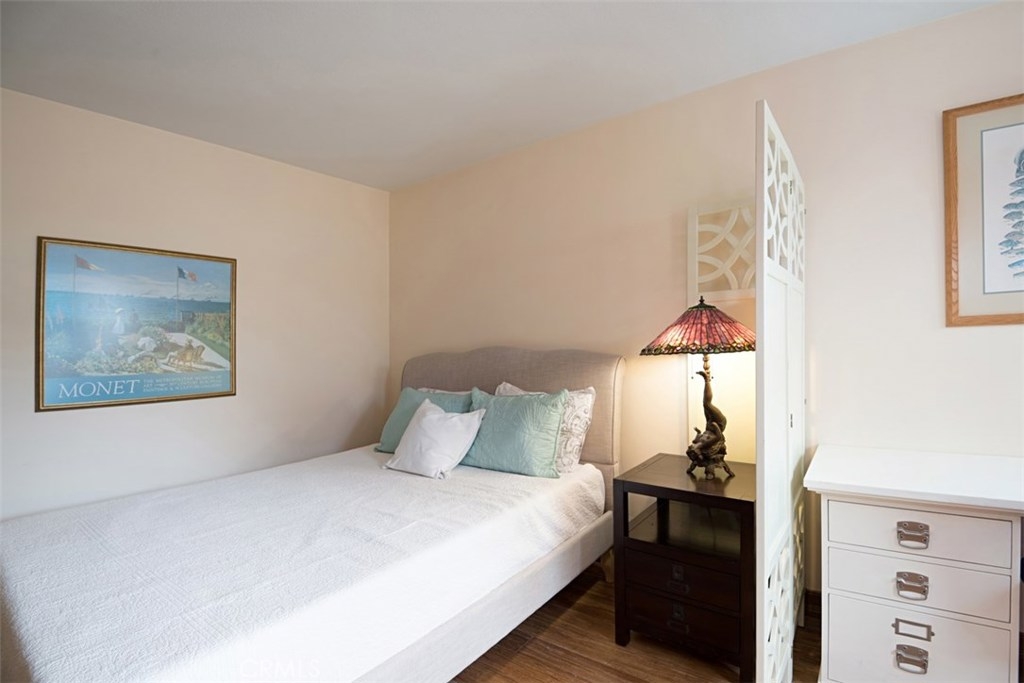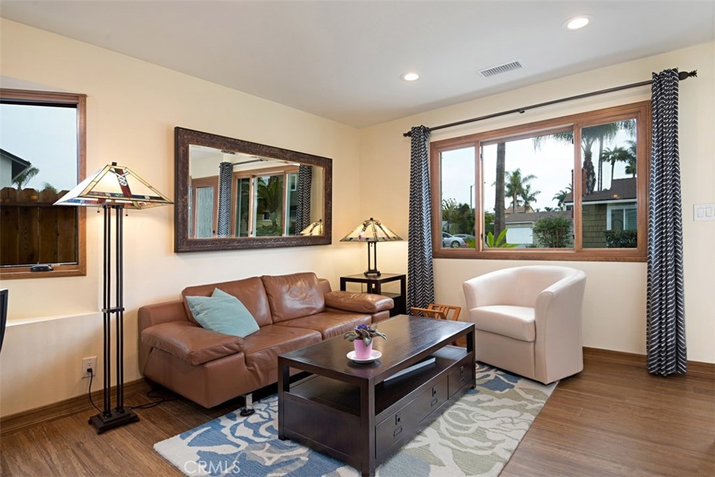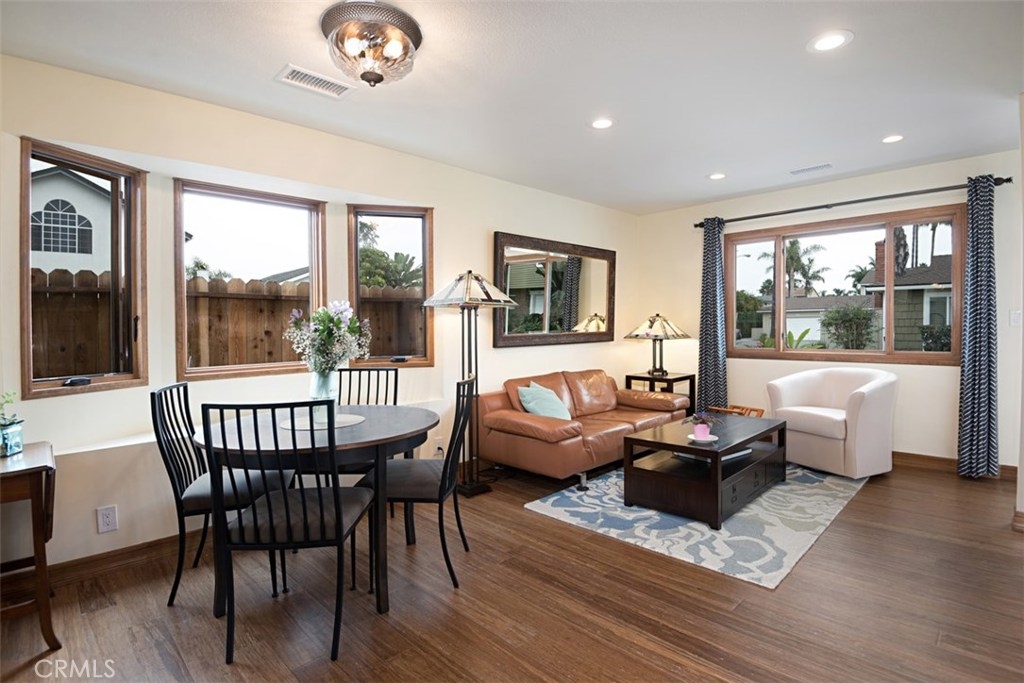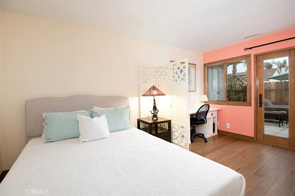 This beach bungalow in a planned community gives you a common landscaped greenbelt to enjoy, a private back patio, and a ten-minute walk to the ocean. This pastel yellow ranch home is less than a year into a complete remodel that included new dual pane windows, lighting and electrical, HVAC, plumbing systems, and more. Bamboo floors connecting the entire home begin in the living, dining, and kitchen in a huge main area. The dining room is brightened with panoramic bay windows and adjoins a truly gorgeous kitchen starring a drop lit center island of slate green quartzite with a deep sink basin. All new rolling drawer cabinetry, new stainless-steel dishwasher, microwave, wine cooler and gas range. Via the kitchen you can head out the double glass French Doors to a sizeable patio where you can sip your coffee while contemplating the fresh salt air. A large master bedroom suite includes a new en-suite tiled bath too, with Jack-and-Jill sink vanity and step-down tile shower. Let in some light with the remote-control skylight – a feature both the homes bathrooms share. The guest bedroom can be used as its own space with a private entry; and the in- room office alcove is perfect for working from home or writing that beach novel. There’s a dedicated laundry area that can accommodate a full-size washer & dryer. Attached two car garage, and private off-street parking is reserved for residents, so you won’t struggle to find a space.