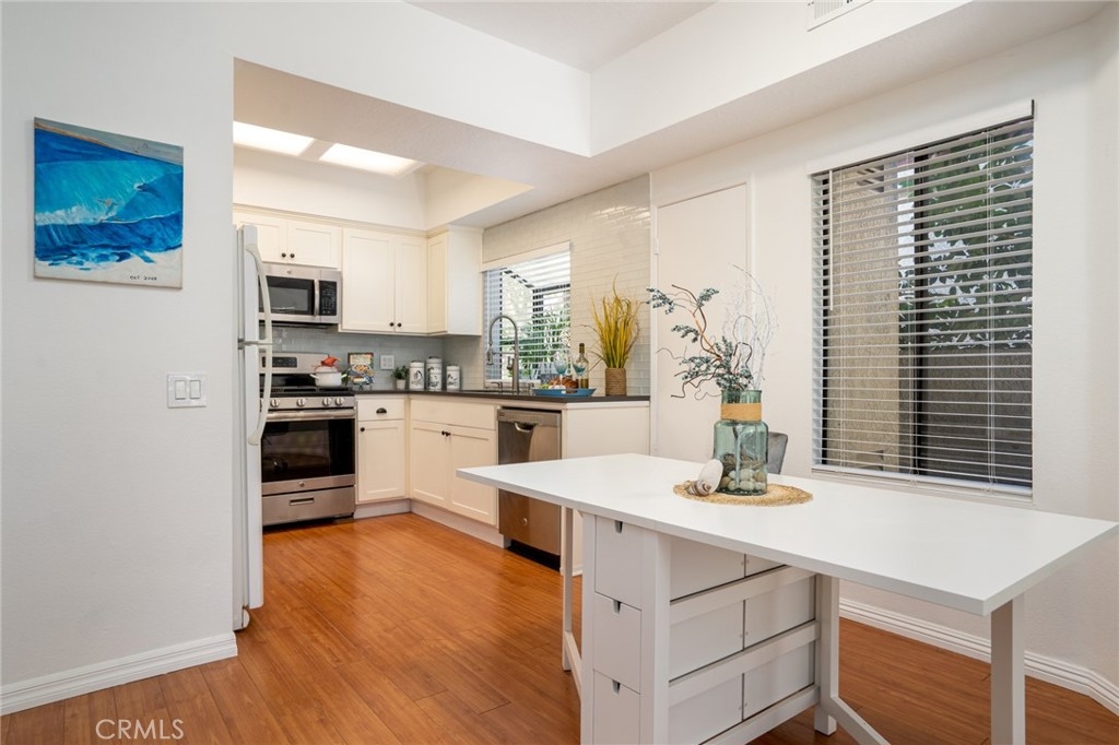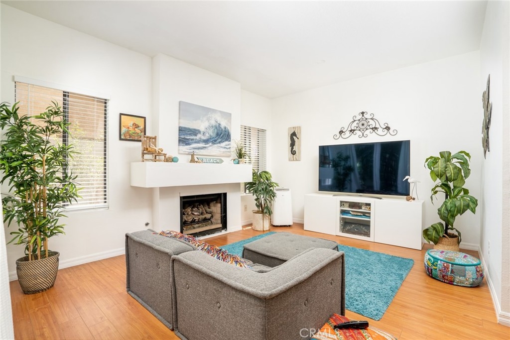 PRICE IMPROVEMENT = NEW OPPORTUNITY!! Nestled in a quiet location of the sought-after Tiara de la Pacifica community, sits this breezy downstairs two bedroom, one and a half bath condo. This home is unique in that it is one of the few in the community with an extra-large wraparound patio, giving you a large, private outdoor area for plants, pets or a place of peaceful enjoyment in your outdoor space. With an open floor plan, abundant windows with new blinds, and attractive laminate wood style flooring, the home is both comfortable and convenient. The kitchen has been tastefully remodeled, with white shaker cabinets and beautiful quartz countertops topped off with a stunning glass brick backsplash. In the living room, is a cozy gas fireplace with a large mantle for decor or a large television. The ensuite main bathroom has a vanity with two sinks plus a walk-in closet. And with an inside washer and dryer, doing laundry is easy and convenient. This home includes a private single car garage plus one reserved parking space in a gated community. Tastefully updated and meticulously maintained, this lovely beach house is just waiting for you to move in and enjoy life at the beach. Join this beautiful community, known for its resort-like atmosphere and high standards of common area maintenance. Hang out at the recently-renovated pool and clubhouse, a centerpiece of the neighborhood. Get out for a scenic hike around the nearby Bolsa Chica wetlands then hit the beach for a day in the sun. Or stay close to home and relax by the pool. Entertain friends with a poolside barbeque and ping pong. Or visit nearby local restaurants and Huntington Harbour Mall Shopping Center, which includes Trader Joes, banks and shopping. Life is better at the beach!