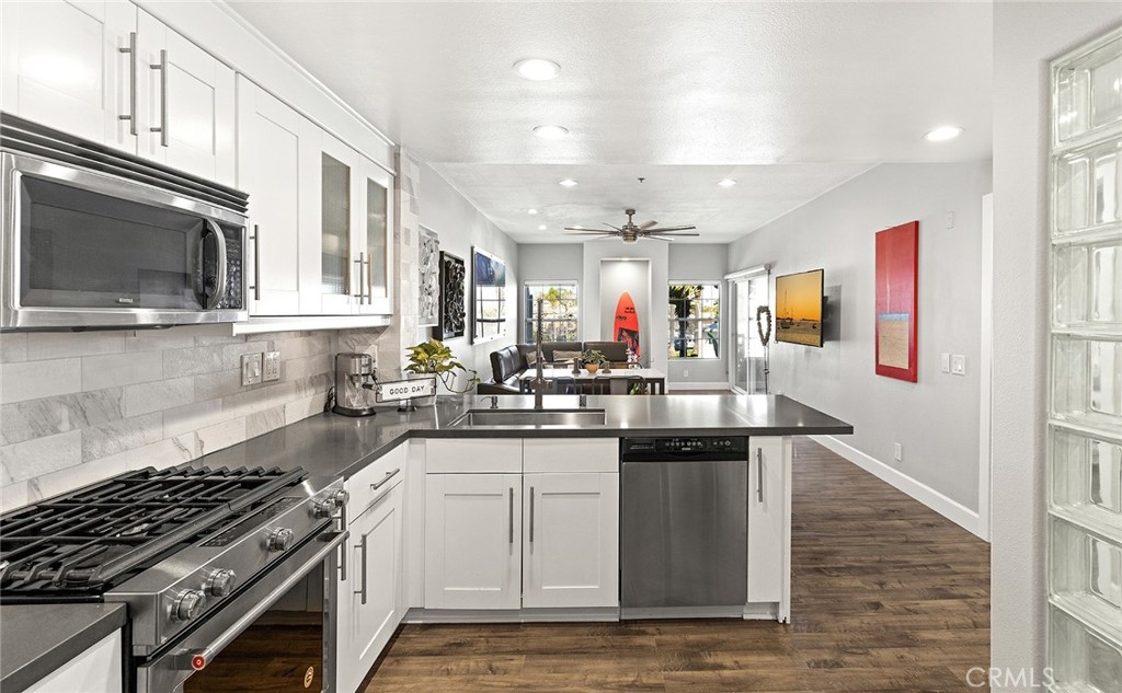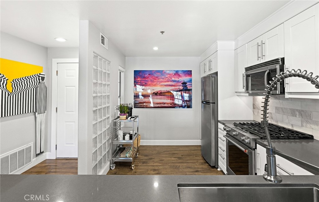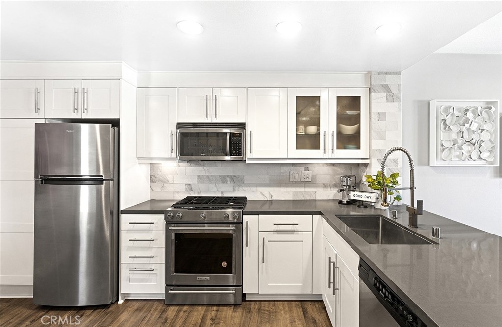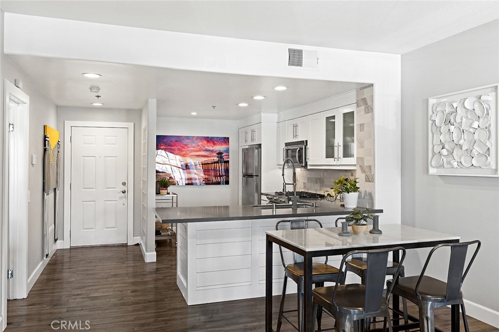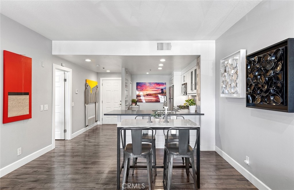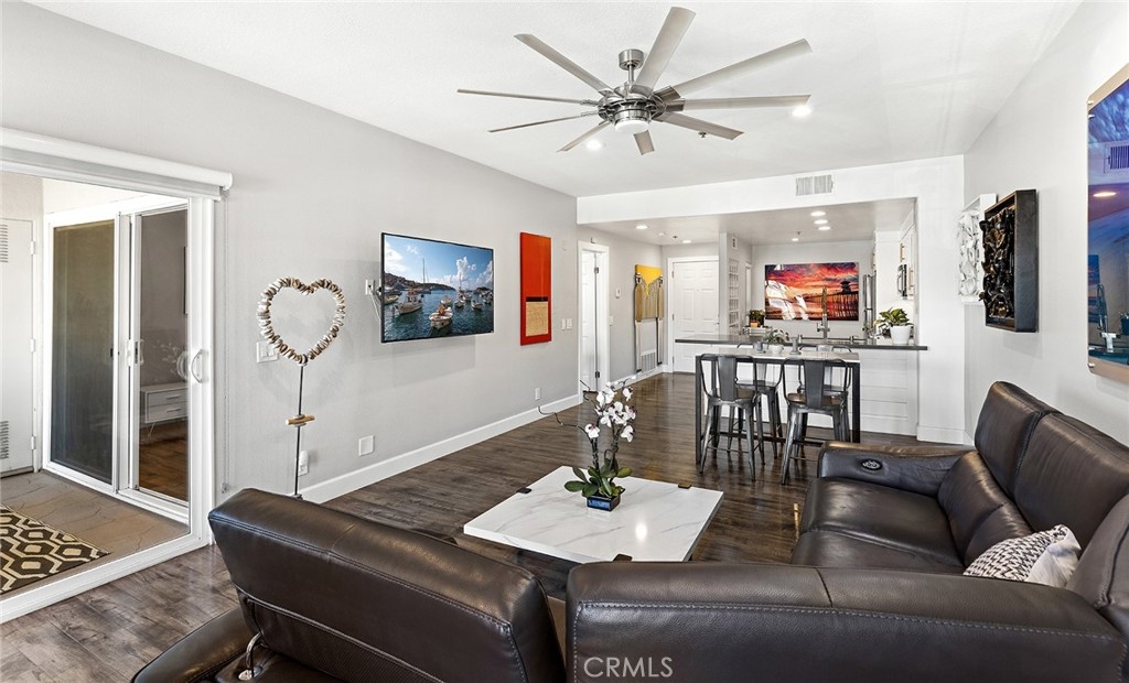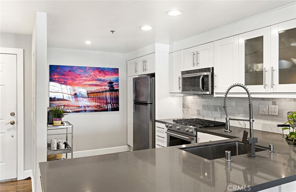 Welcome to Townsquare Condos; your own slice of luxury beach living! This meticulous & freshly remodeled extra-large 1 Bedroom condominium offers privacy with state-of-the-art secured access as well as an effortless downtown lifestyle just steps to the sand. This amazing property is located right on main street with over 100 restaurants and local eateries, live music and farmers markets, surf competitions, one block to Pacific City and annual festivities, Huntington Beach is truly defined by its sense of community and fun-loving atmosphere! This Pied-à-terre has spared no expense and has been remodeled from top to bottom. Brand new expanded open concept kitchen-living space, custom cabinetry with quartz counters, shiplap and marble accents with a stainless (gas) appliance group package. The home is outfitted with luxury LTV flooring throughout with gray and subtle brown undertones, blending seamlessly with any decor & artwork. Large living and sleeping quarters with dual sliders leading out to your private patio space from either room; overlooking the sunsets, palms and green space (additional storage closet and utility access location as well). The large walk-in master closet adjoins an exquisitely remodeled en-suite bathroom that boasts designer tile from floor to ceiling, custom cabinetry with quartz counters and raised modern wash-room accents, large format matte gray porcelain floors lead to an oversized frameless heavy-glass shower and water closet area. Upgraded plumbing, lighting and electrical with recessed lighting additions and an interior laundry closet with washer/dryer are included. Elevator access to all floors including the secure access subterranean garage for both personal and guest vehicles along with two convenient bike storage locker-rooms. This unit comes with 3 parking spaces!, 1 assigned and 2 guest spots. This second floor unit is also uniquely positioned within the complex as there is no dwelling unit above you. Beautifully maintained and private grounds with luxury pool and spa. Come and see this piece of coastal paradise!