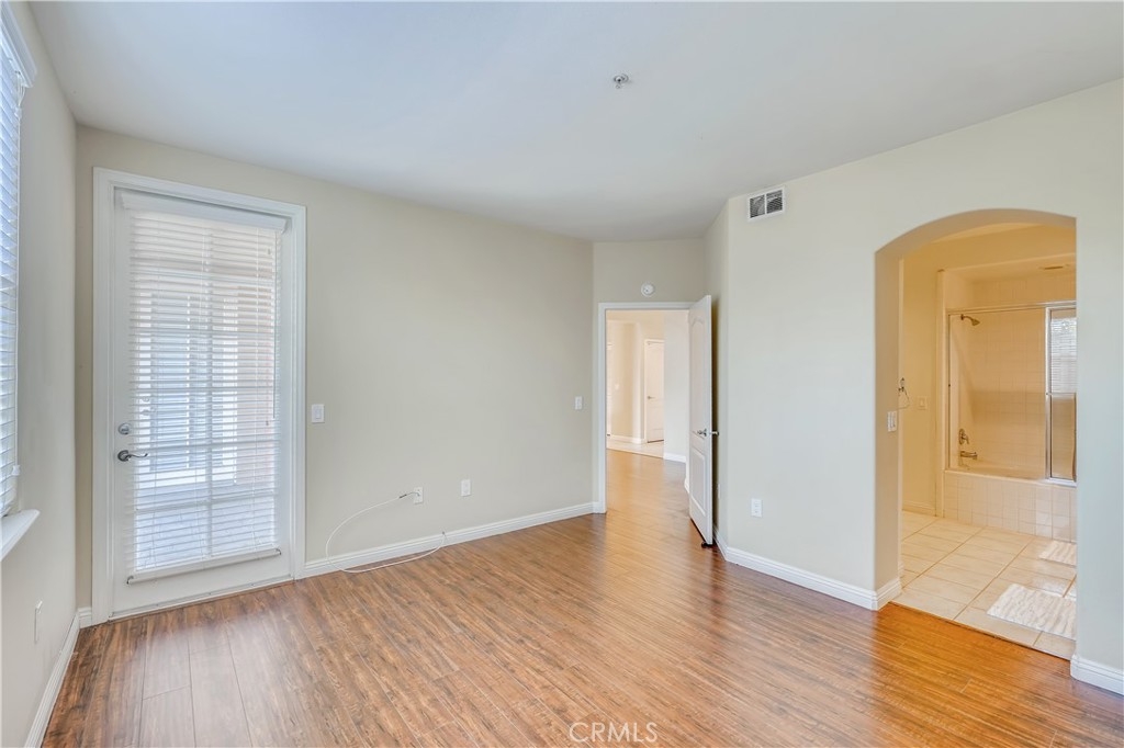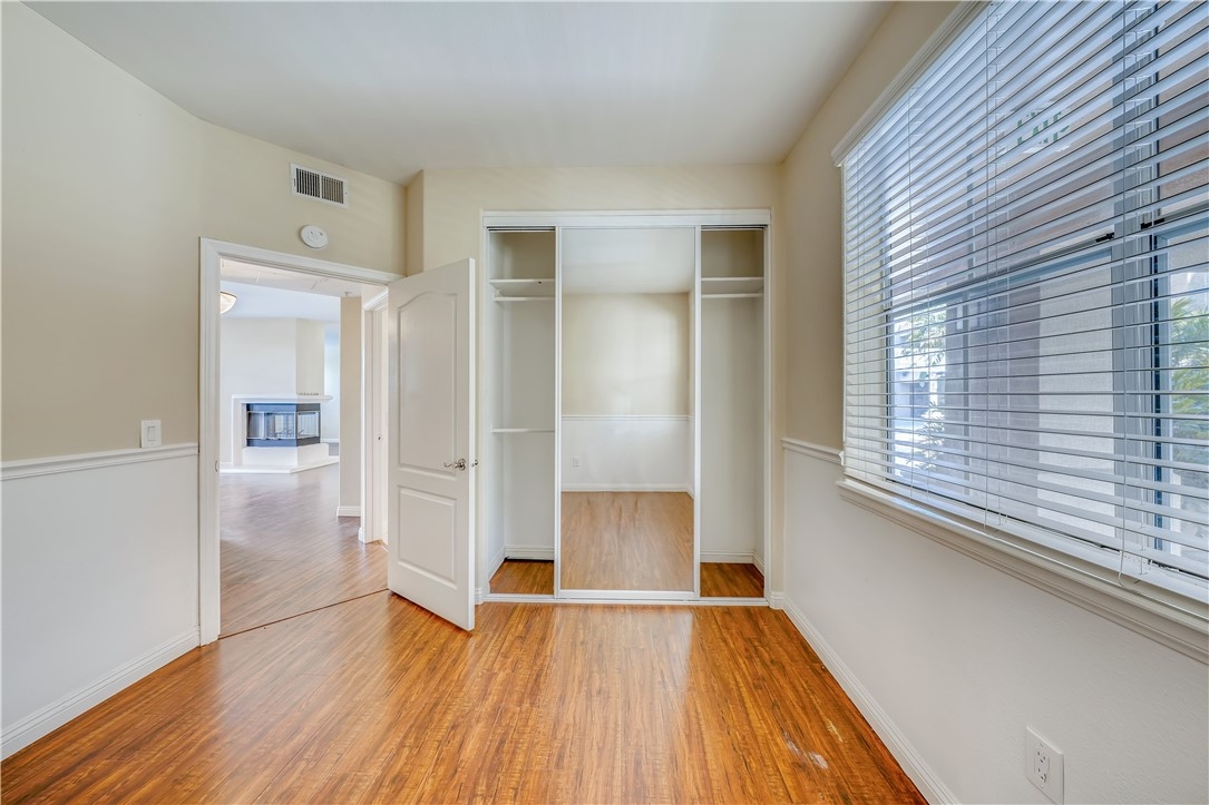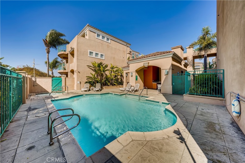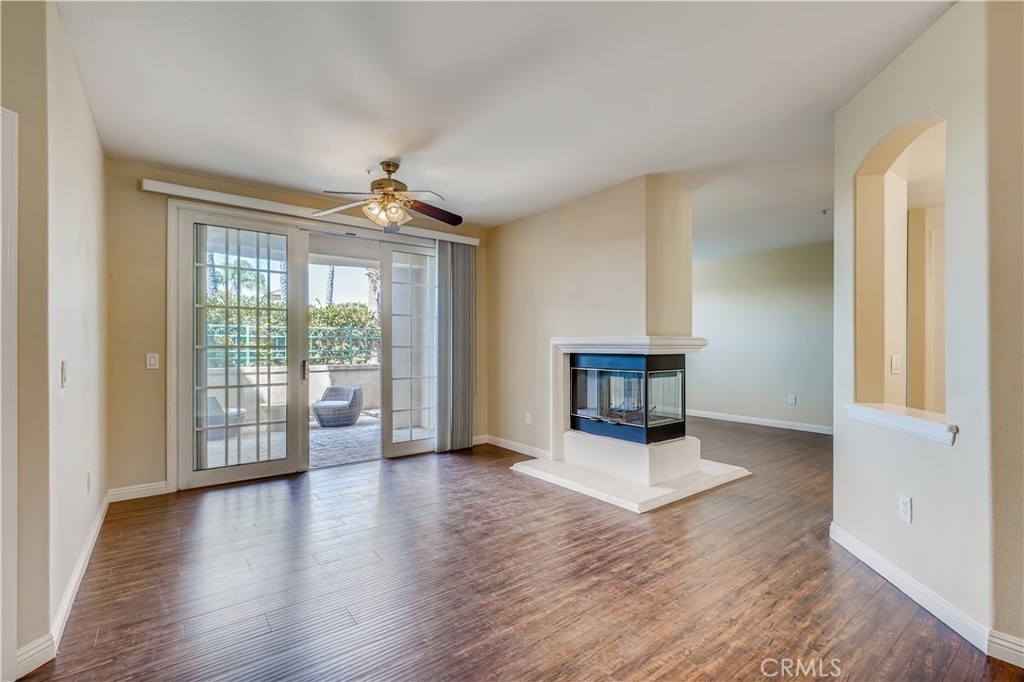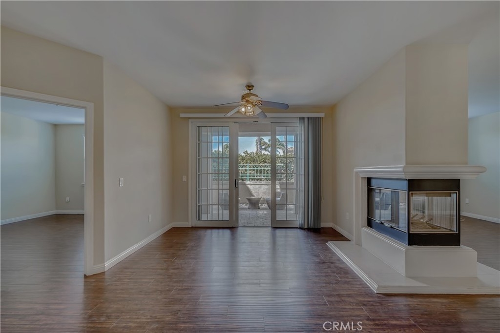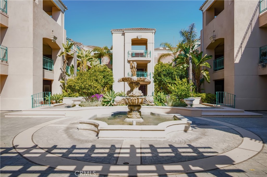 First floor, single level unit with 2 bedrooms and 2 bathrooms in Villa Milano! The spacious primary suite has a walk in closet, bathroom with tub/shower combo and dual sink vanity, as well as direct access to the patio. The secondary bedroom is located at the front of the unit, and secondary bathroom also has a tub/shower combo. There is a patio off of the kitchen, and another patio off of the living room which has a covered and open area. The kitchen is located just inside the entry door, and contains a laundry closet with stackable washer/dryer. The unit has engineered hardwood floors, and tile in the kitchen and bathrooms. There are two living room areas with a centrally located fireplace. The complex has a gated pedestrian entry gate, as well as a gated subterranean parking area with elevator. The unit has two assigned parking spaces, and a storage closet. With beautifully maintained grounds, the association has a tranquil central courtyard with fountain and arbor, pool, spa and BBQ area with bathroom/shower for outdoor entertaining. There are only 33 units in this intimate community, and the location provides for easy access to beaches, shopping centers, parks, schools and all of the amenities that Huntington Beach has to offer!
