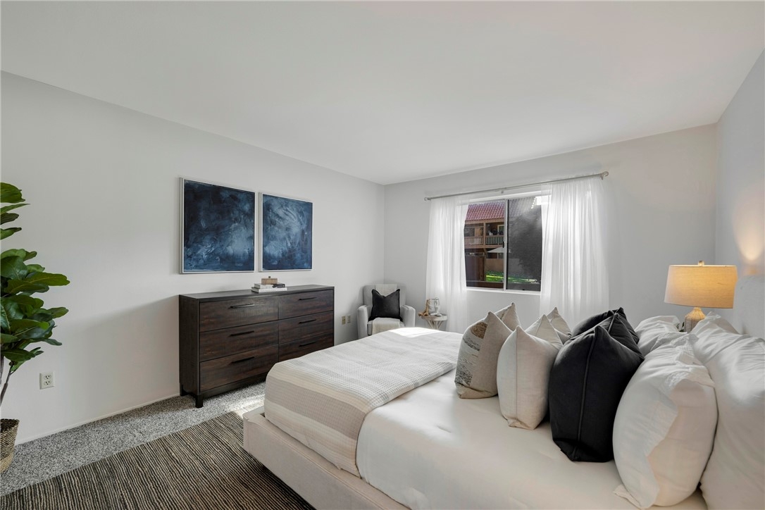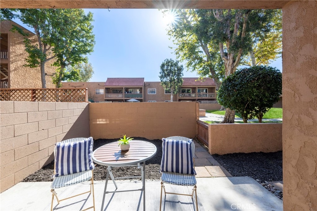 Welcome to Villa Warner, a lovely, well maintained park-like community! This is a ground floor condo. The layout feels very spacious, the bedroom is large with a separate dressing area that has 2 generous closets. A charming backyard patio looks out to the well manicured community grounds and has a gate which provides easy access to the community grounds. This unit comes with 1 assigned, covered parking space.