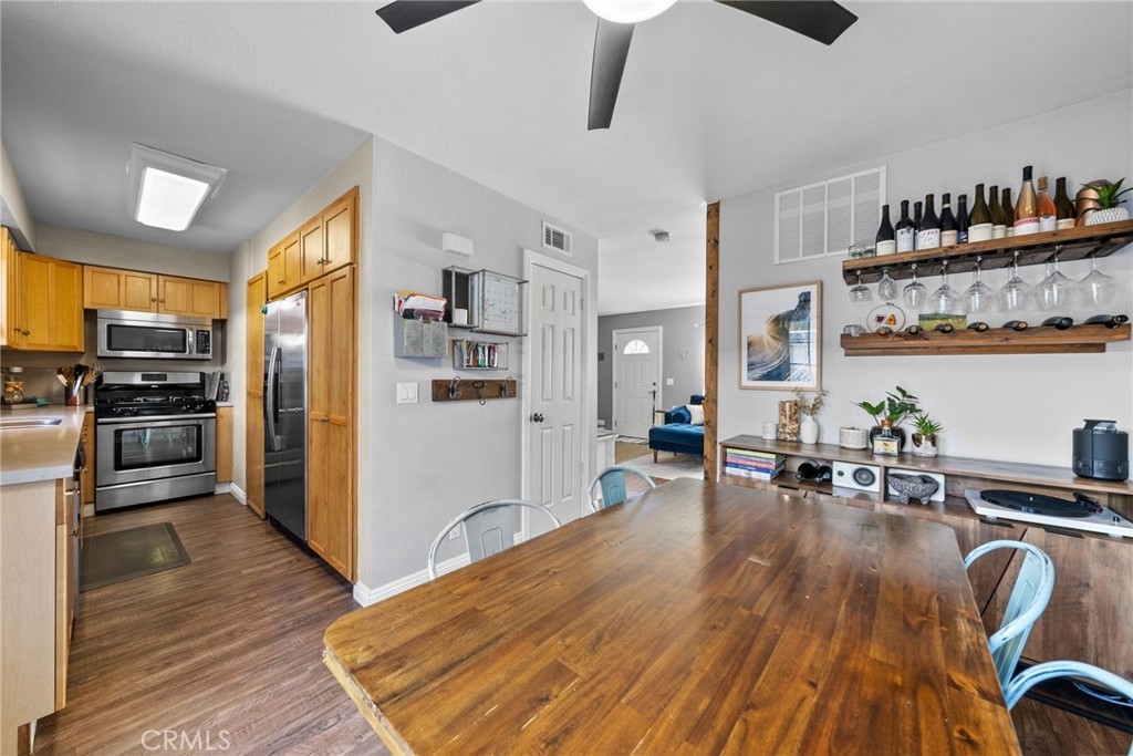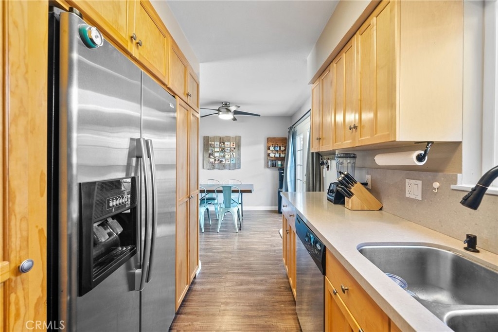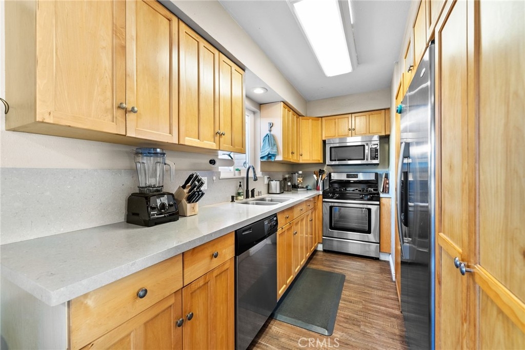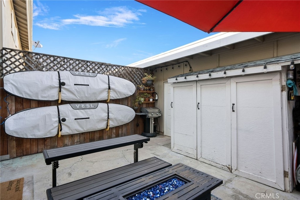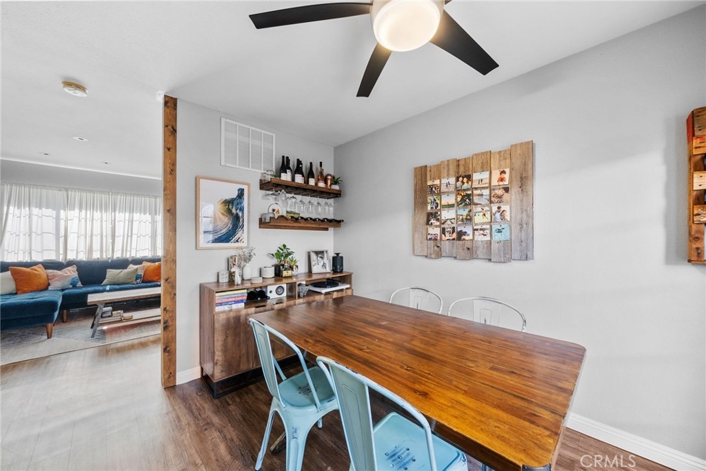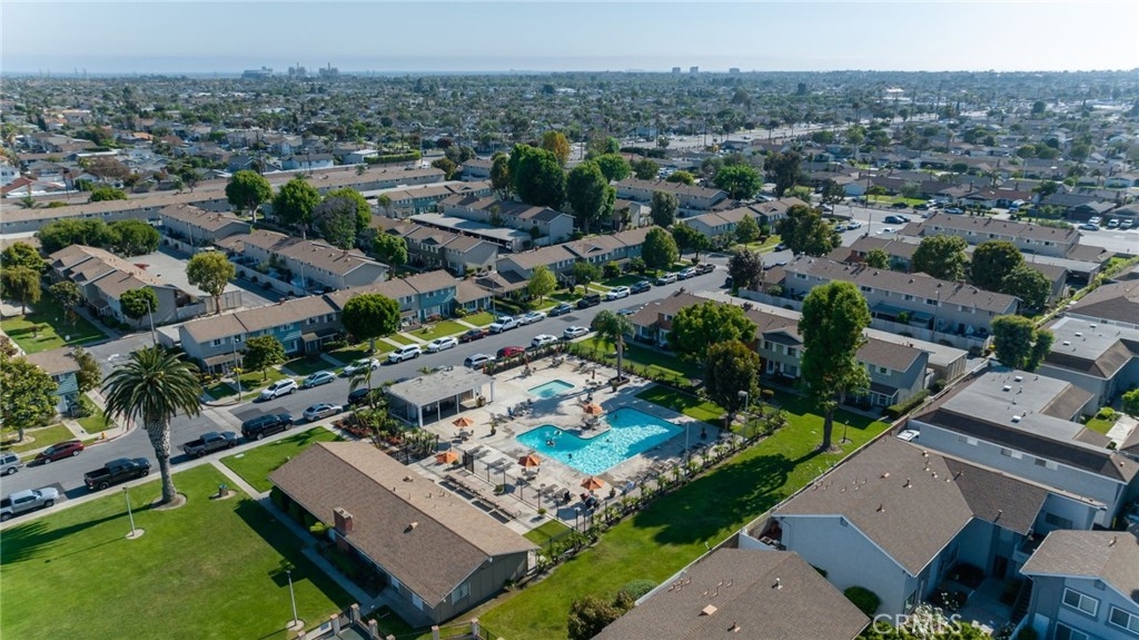 Location, location, location! This spacious 3 bed, 1.5 bath end unit townhome has every feature you could wish for. The luxury vinyl flooring downstairs brings elegance and charm. The living room features a fireplace, bringing charm to the space, and leads seamlessly to the dining and kitchen area. The kitchen had the original washer/dryer relocated upstairs, offering a sizable upgrade in storage for your kitchen, and the dining room showcases french doors that open to a peaceful enclosed patio, a perfect arrangement for entertaining or enjoying a night in. The patio boasts custom built storage, an excellent addition to any home, and has direct access to the carport, a superb feature for any electric vehicle owners, as the home includes a 240v charger and cord that reaches the carport spot! Walking upstairs, you will note the custom stair runner, and additionally find upgraded bamboo flooring on the second level. This community offers a pool, clubhouse, full basketball and tennis courts, play area, and large grass lawn, and is perfectly nestled within easy access to schools, parks, shopping, dining, and is a quick 10-minute drive to the beach! Don't miss your chance to start living your best Huntington Beach life!