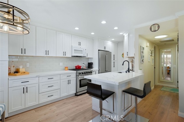 Beautifully Remodeled 2 Bedroom Condo in a 55+ Huntington Beach Gated Community, Just 3 Miles from the Ocean! Welcome to this stunning, completely Remodeled Ground-floor End unit located in a desirable gated community of Huntington Beach. Just 3 miles from the sand, this modern coastal retreat offers the perfect blend of style, comfort, and convenience. Step inside to discover an open-concept layout featuring luxury vinyl plank flooring, crown molding, shutters, and abundant natural light. The updated kitchen shines with quartz countertops, stainless steel appliances, and sleek cabinetry, perfect for cooking and entertaining. Enjoy easy single-level living with NO Stairs, ideal for seniors seeking comfort and accessibility. Relax or entertain on your private patio, surrounded by lush landscaping for added privacy. Located within a secure, gated community offering well-maintained grounds, plenty of parking including a private 1 car carport, and an affordable HOA, this home delivers exceptional value, BEST Price in HB, just minutes from world-class beaches, shopping, dining, and freeway access.
