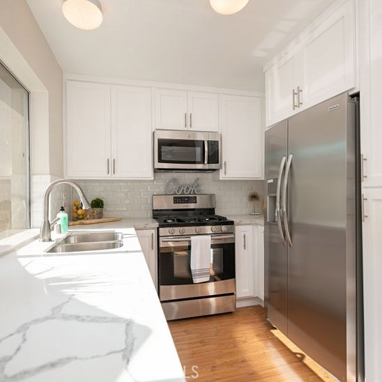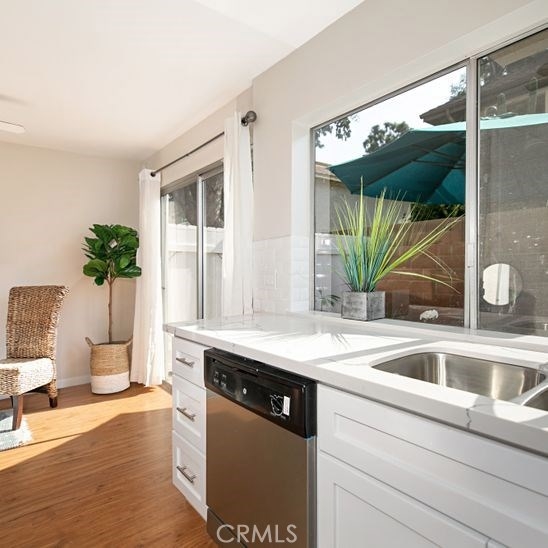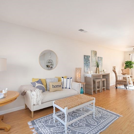 Welcome to Yorktown Villas! This Stunning upgraded end unit has no one above or below and is close to the beach! This home features 2 bedrooms, 1 1/2 bathrooms and 1,020 sq. ft of interior living space. This unit has many upgrades including a recently remodeled gorgeous kitchen! Featuring soft close cabinets, Quartz counter tops, and all new stainless steel appliances! Additionally, this home has been upgraded with new paint throughout, scraped ceilings, hand scraped engineered wood floors, a newer furnace and a new garage door. This home also has an enclosed back patio with a gate leading to a private greenbelt which feels like your own backyard. With low HOA fees of $300 per month, a detached garage in walking distance to the unit, beautiful upgrades, this property has it all! This picturesque community is ideal with plentiful greenery, parks, and a community pool. Don't miss out!