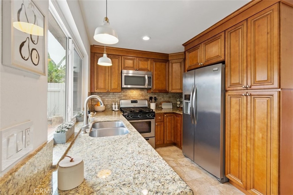 Dreaming of a Huntington Beach home where you can simply move in and relax? This recently remodeled, desirable end-unit townhome is presented in immaculate condition and just waiting for you to make it your own. A bright and inviting interior welcomes you inside with easy-maintenance tile floors, recessed lighting, and numerous windows adorned with plantation shutters. A stylish dining nook, illuminated by sliding glass doors, adjoins the galley kitchen. Granite countertops and subway tiles beautifully complement rich, dark cabinets. Stainless steel appliances make meal preparation and cleanup a breeze as you take in views of the backyard. Take advantage of three bedrooms and two baths, all featuring hardwood-style floors and ceiling fans. You’ll also have the convenience of a separate laundry room. Step outside to your private, fenced rear courtyard. A raised, rich-toned wood deck pairs with a concrete patio to provide an ideal space for outdoor relaxation, cooking on the grill, and al fresco dining. You’ll have access to ample green space for afternoon picnics or enjoying lawn games. Your sophisticated and modern abode is located in a great school district just a few miles from the Huntington Beach pier, and Fairview Park is only a few blocks away. You’ll have easy access to nearby shopping and dining destinations. Come take a tour before this incredible opportunity passes you by!