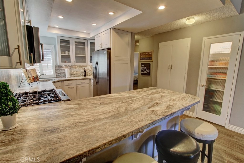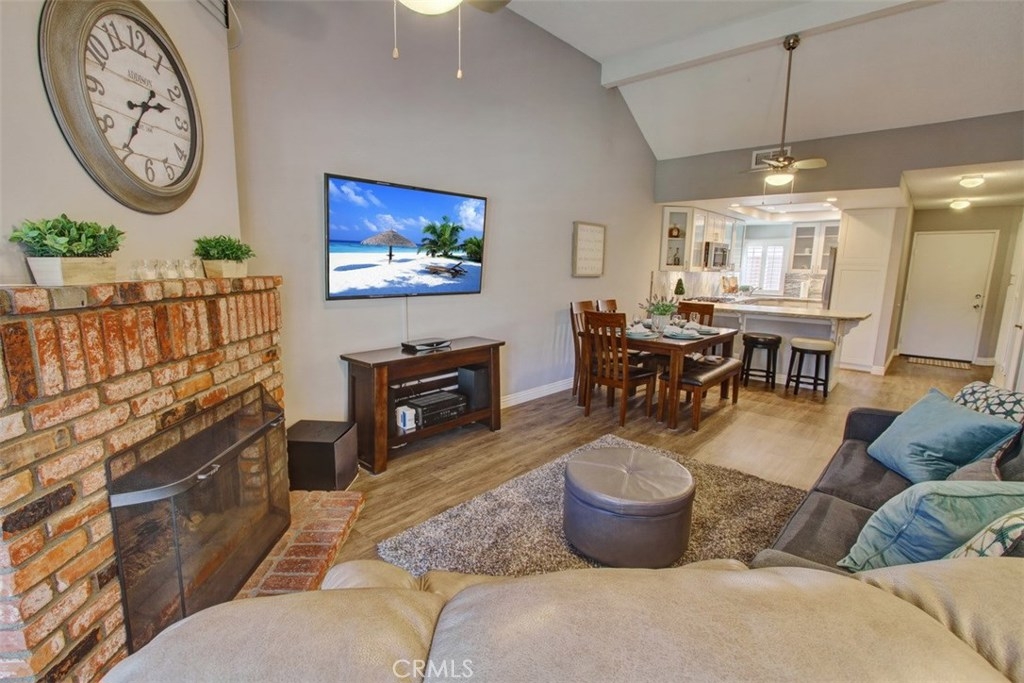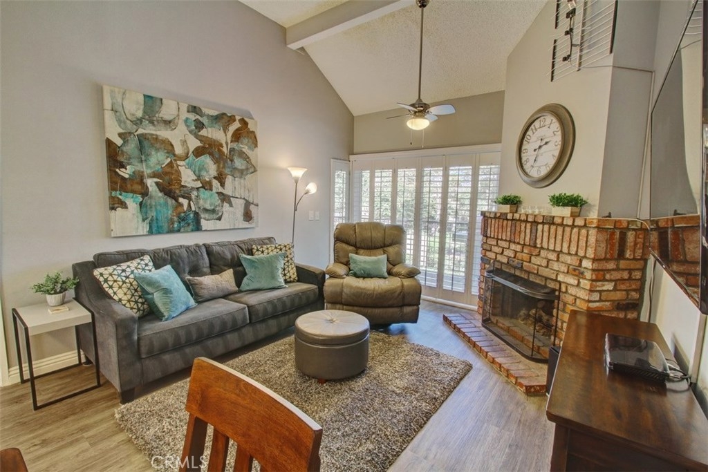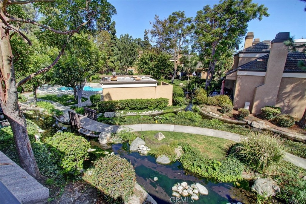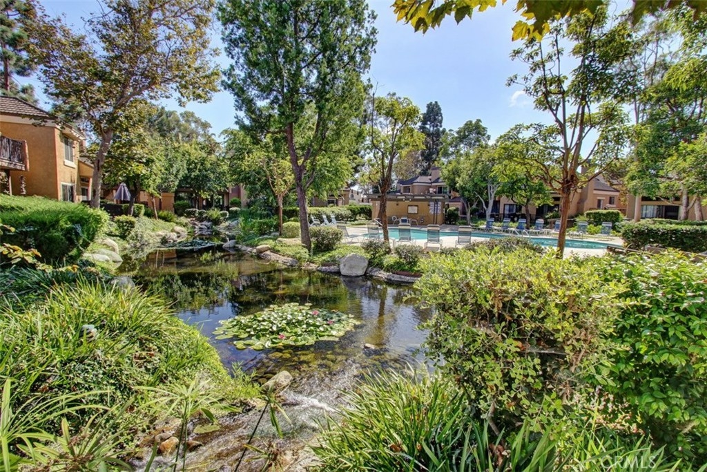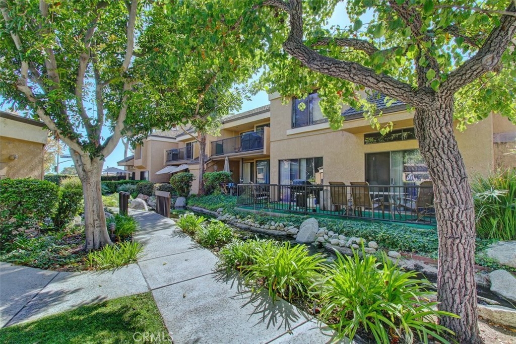 Beautifully upgraded condominium located in the private Huntington Beach gated community of Mill Stream. Kitchen is absolutely gorgeous with leathered quartz counters and backsplash, white custom wood cabinets with glass fronts, and stainless steel appliances. Kitchen with eating bar opens into the living and dining area with high vaulted ceilings which lend a spacious and airy feeling to the home. Living room has a warm brick fireplace and looks out onto the meticulously manicured grounds and babbling streams. Both the living room and master bedroom have plantation shuttered doors which open out to the large balcony, perfect for relaxing and enjoying the soothing and tranquil views. Full size laundry area is conveniently located indoors along with second bedroom and 1.5 customized baths. One car garage has ample storage and has rear door which opens directly to the staircase and entry. Newer: flooring, dual pane vinyl windows, heating and air conditioning. Community amenities include pool, spa and tennis courts as well as relaxing pathways amongst streams and lush landscaping. Centrally located close to shopping, entertainment, parks, beach and freeway access. Must see for yourself!