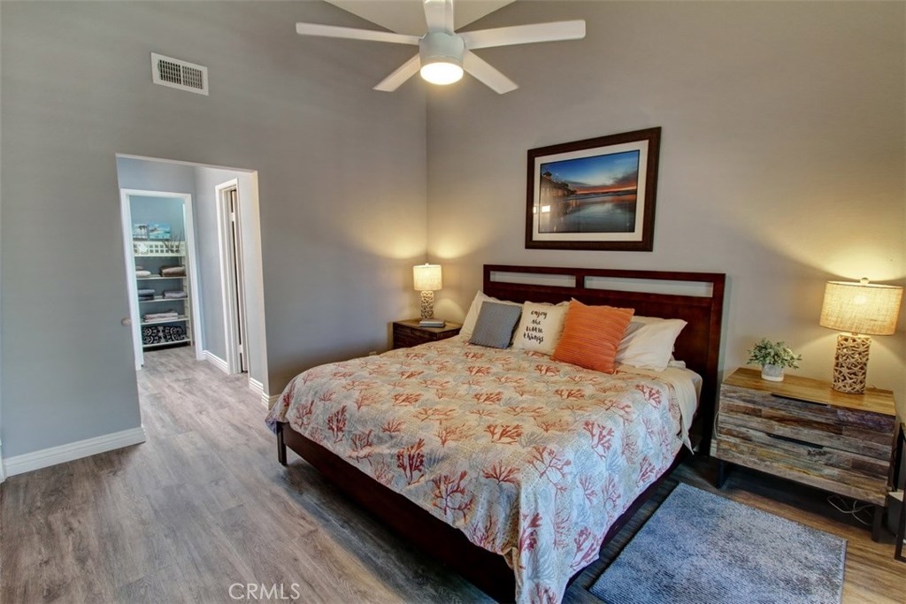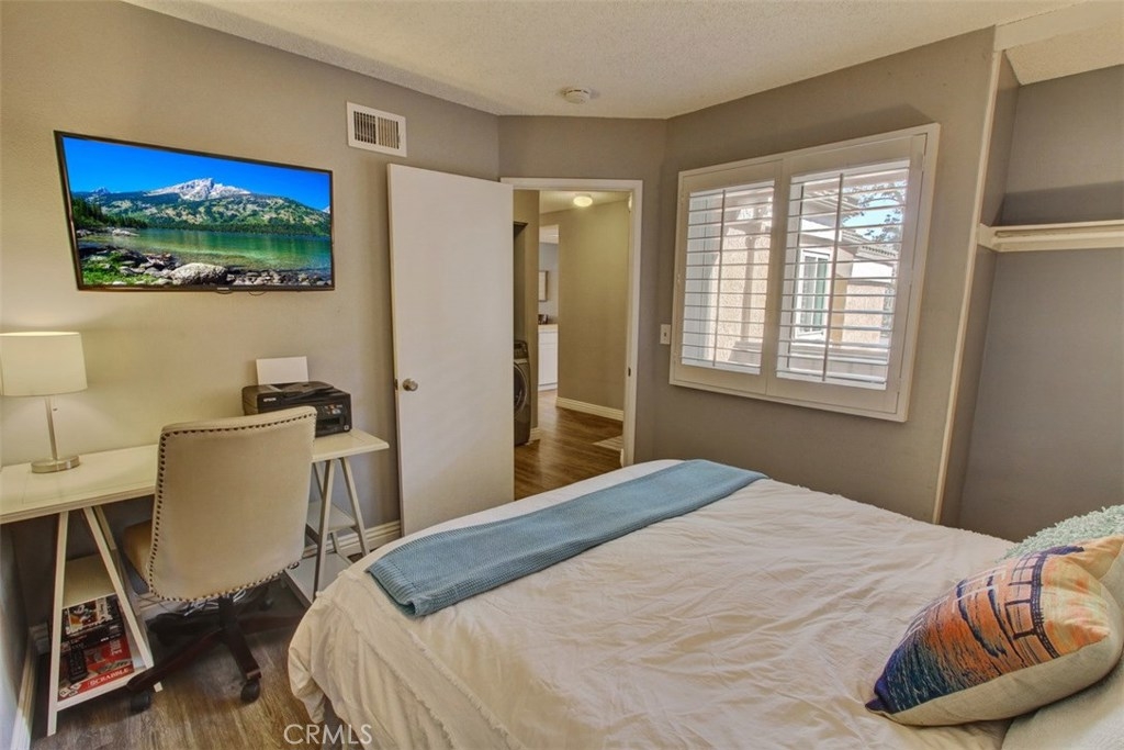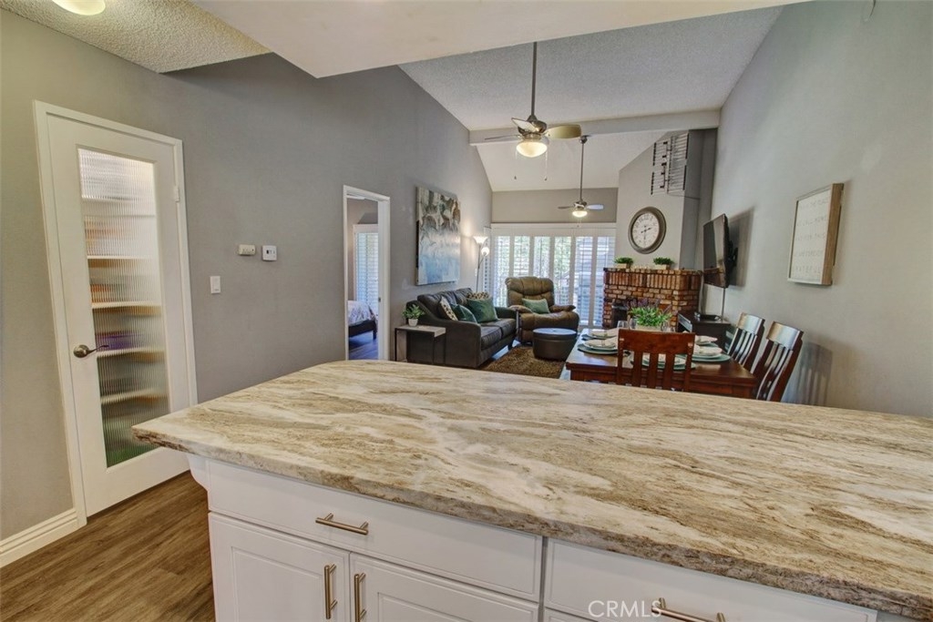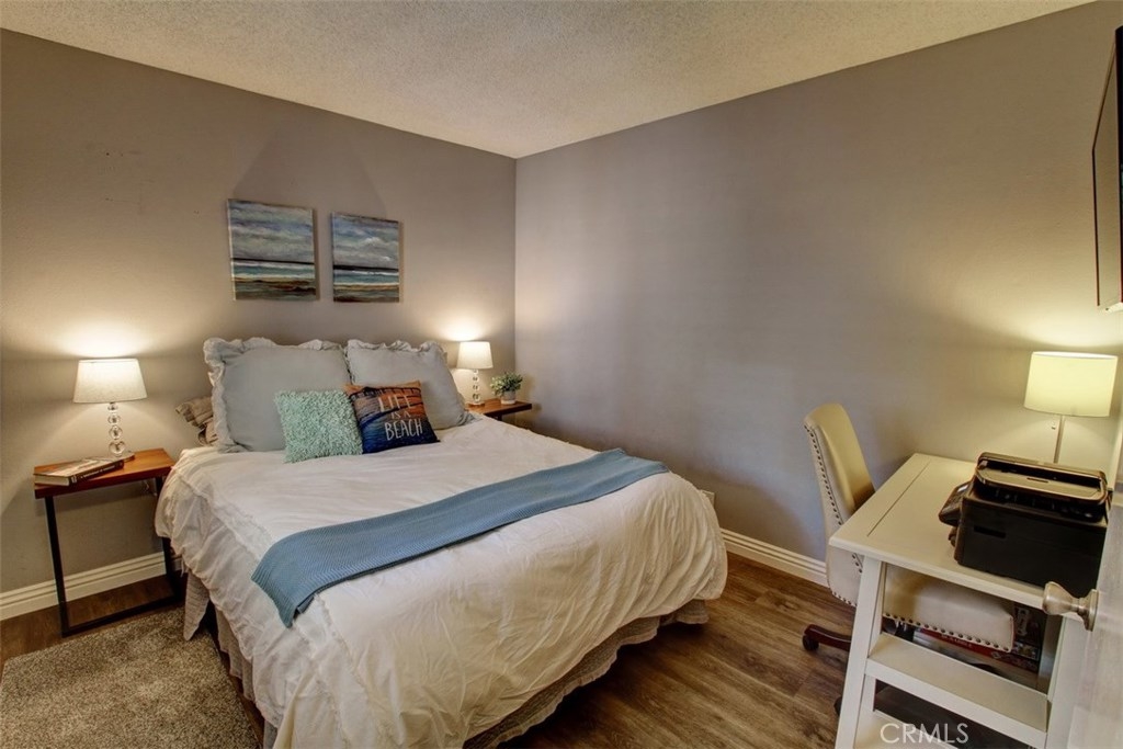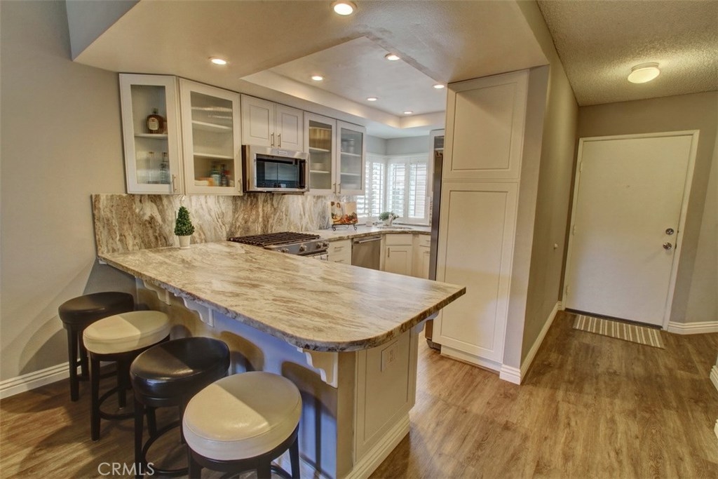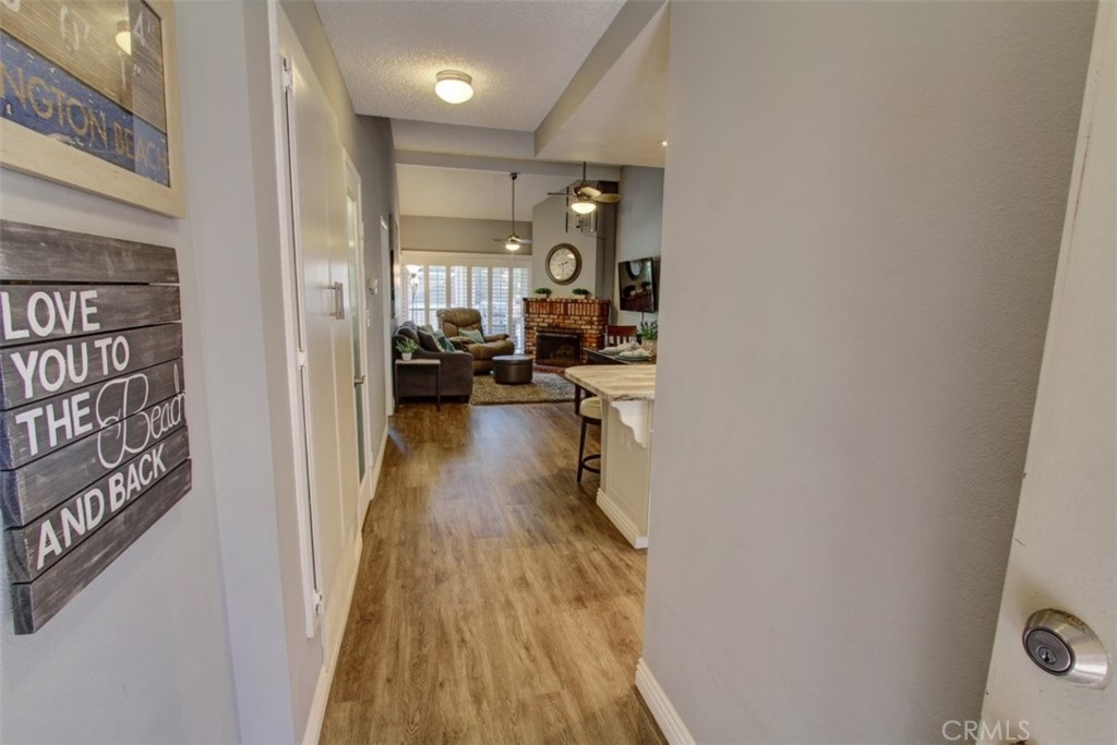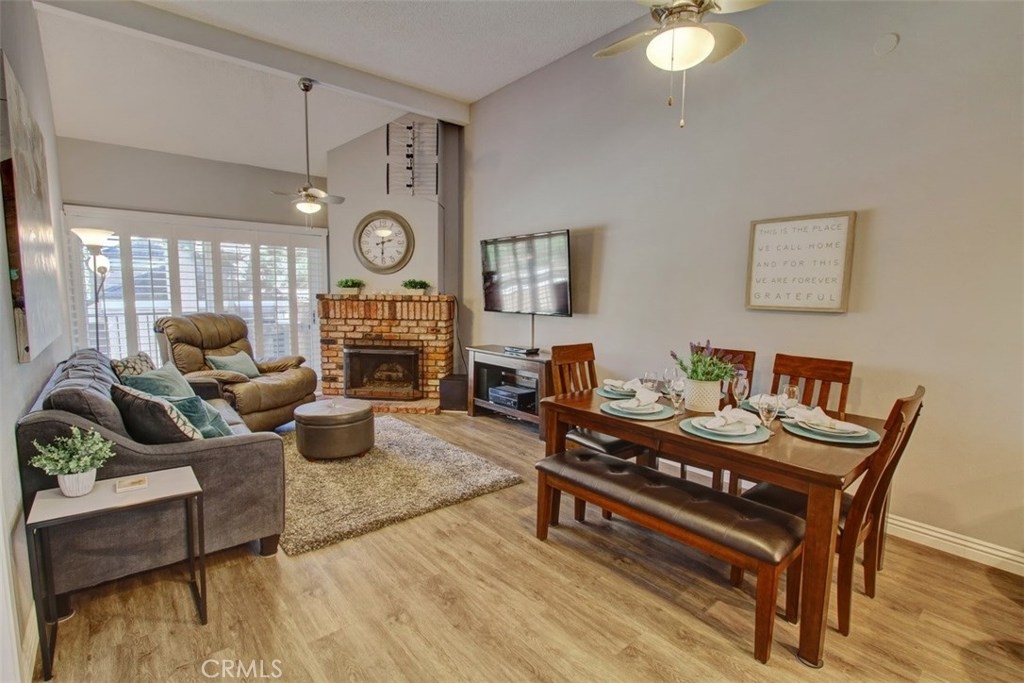 Beautifully upgraded condominium located in the private Huntington Beach gated community of Mill Stream. Kitchen is absolutely gorgeous with leathered quartz counters and backsplash, white custom wood cabinets with glass fronts, and stainless steel appliances. Kitchen with eating bar opens into the living and dining area with high vaulted ceilings which lend a spacious and airy feeling to the home. Living room has a warm brick fireplace and looks out onto the meticulously manicured grounds and babbling streams. Both the living room and master bedroom have plantation shuttered doors which open out to the large balcony, perfect for relaxing and enjoying the soothing and tranquil views. Full size laundry area is conveniently located indoors along with second bedroom and 1.5 customized baths. One car garage has ample storage and has rear door which opens directly to the staircase and entry. Newer: flooring, dual pane vinyl windows, heating and air conditioning. Community amenities include pool, spa and tennis courts as well as relaxing pathways amongst streams and lush landscaping. Centrally located close to shopping, entertainment, parks, beach and freeway access. Must see for yourself!