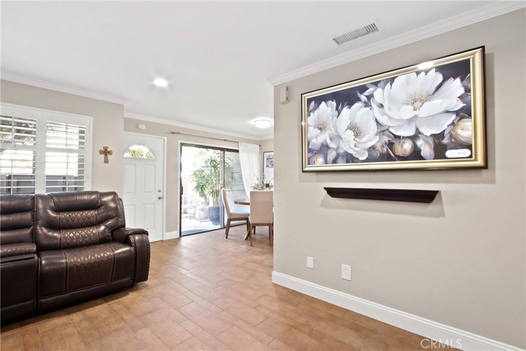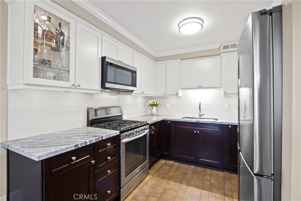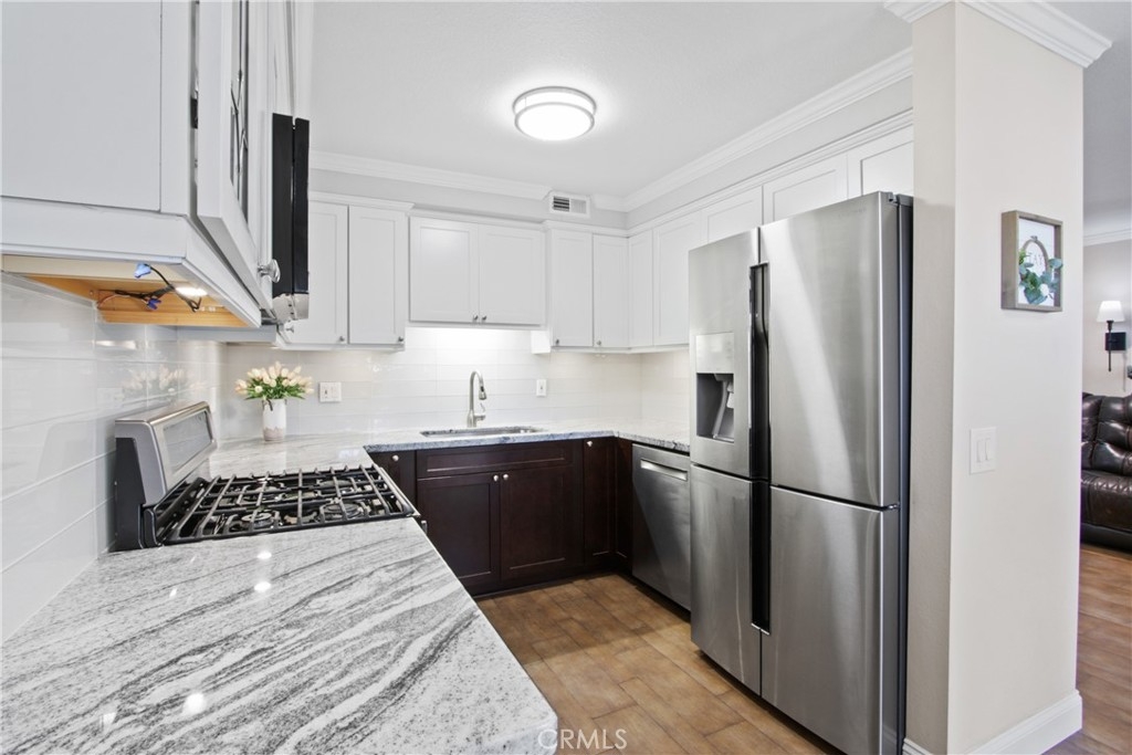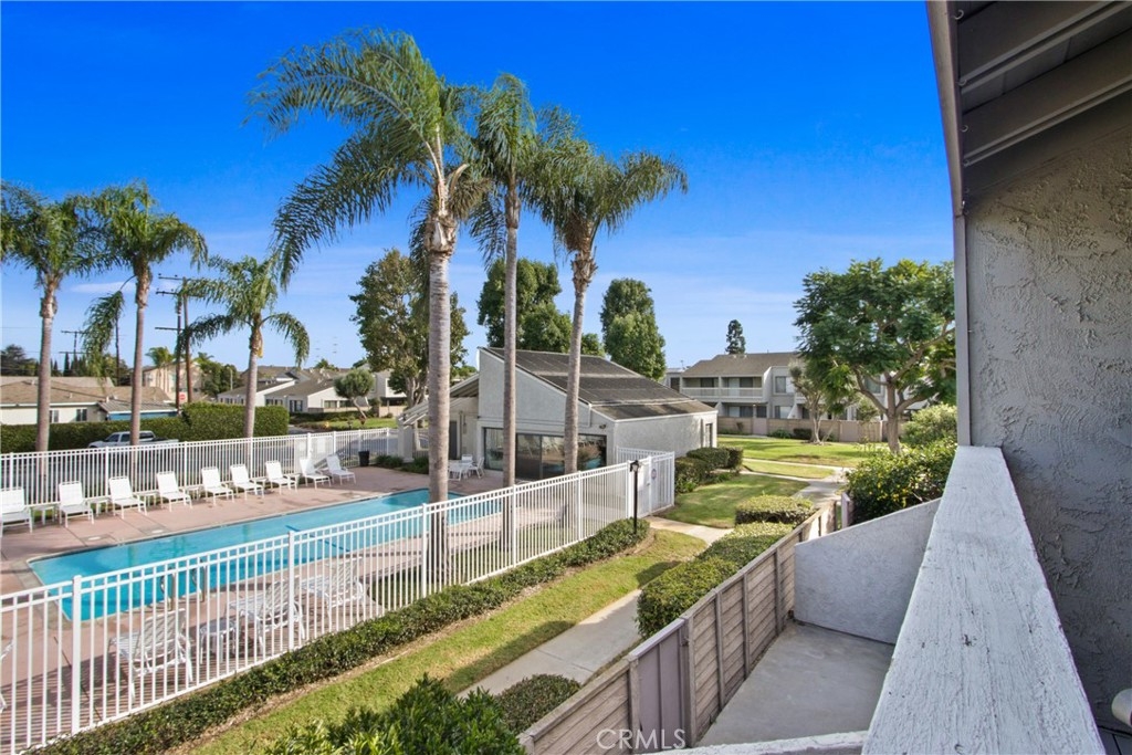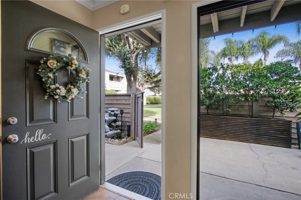 Nestled in the charming Huntington Beach community of Tamarack Village! HIGHLY UPGRADED townhome with a LOW HOA, three-bedrooms, one and a-half-baths, situated nicely within the middle of the community overlooking the pool and clubhouse, with no neighbors in front or behind! This home has been lovingly cared for by the owners for the past 21 years, truly a rare gem waiting for you to discover! The remodeled kitchen (in 2018) is equipped with elegant Viscount white granite counters, 16x4 inch modern white glass back splash, Pro-American recessed shaker style panel cabinets in Java Cherry (lowers) and Linen (uppers) including under lighting, a Kohler stainless sink, five burner KitchenAid gas range with oven, Samsung refrigerator, Bosch dishwasher, and an under mounted microwave above the stove. The dine in kitchen is adjacent to the living room, and a spacious private front enclosed patio connected by a sliding door which makes it perfect for entertaining! Tucked around the back side of the living room is the half bathroom, and the direct access to the garage. All three bedrooms are located on the second level, a nice size primary room with two separate closets (mirrored sliding doors), and a balcony overlooking the pool with expansive views of the community! Across the hall from the primary suite, are the two additional bedrooms. The upstairs bathroom was handsomely remodeled in 2022 includes a Carrara marble vanity, bidet toilet, and a floor to ceiling “marble like” large tiled shower with frameless glass enclosure and a long shelf perfect for all of your toiletries! Other upgrades include: Central AC and heat, a separate 220V outlet for EV charging in the garage, dual pane low e-glass windows, plantation shutters, Gambarelli Atlantis Porcellanato plank tile "wood look" downstairs and in both bathrooms, crown molding, larger baseboards, dimmable LED recessed ceiling lights, 40 gallon water heater installed in 2023 with a six yr. warranty, diamond cut and polished cement patio slab, and washer and dryer in the garage are included. Residents of this community enjoy the sparkling swimming pool, complimentary use of the clubhouse and green belts! Water and trash are included with the HOA! Just a short four mile drive to Huntington State Beach where the sea meets the sand! This turnkey townhome is a must have!