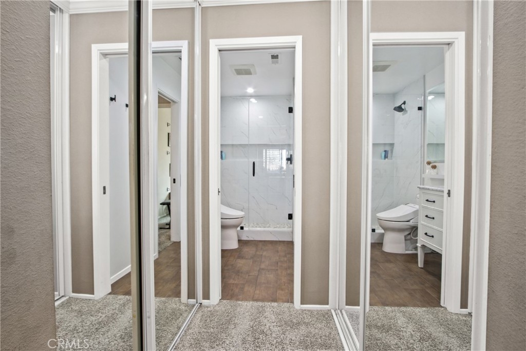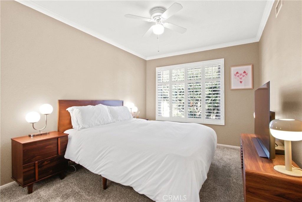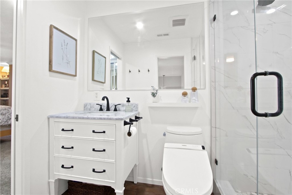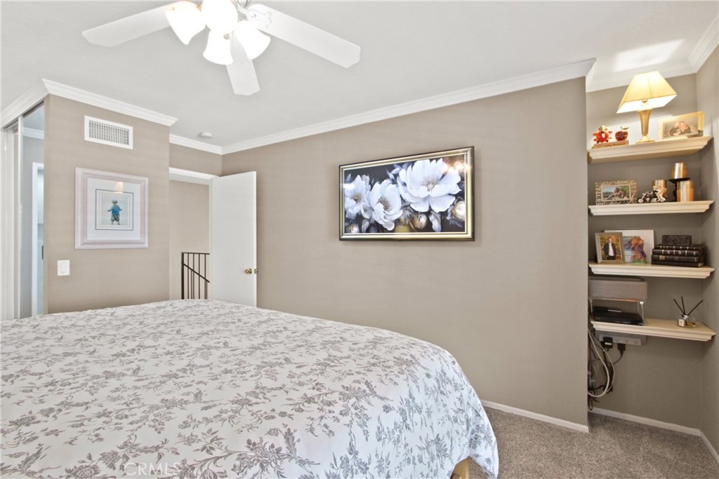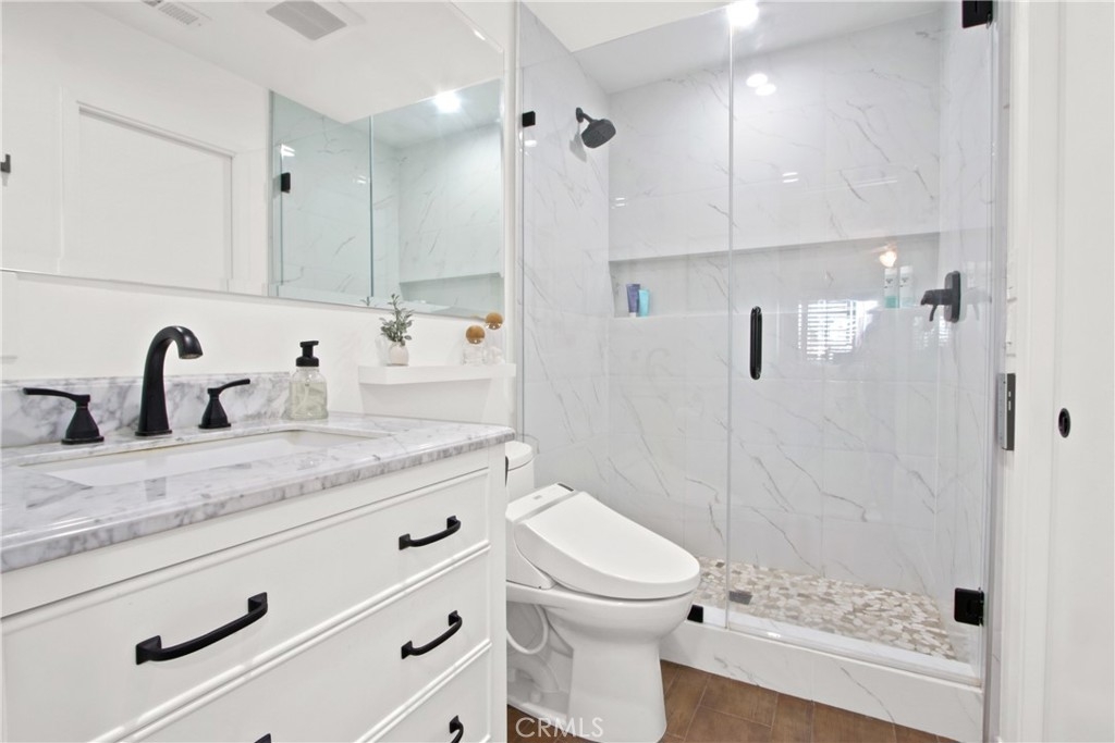Nestled in the charming Huntington Beach community of Tamarack Village! HIGHLY UPGRADED townhome with a LOW HOA, three-bedrooms, one and a-half-baths, situated nicely within the middle of the community overlooking the pool and clubhouse, with no neighbors in front or behind! This home has been lovingly cared for by the owners for the past 21 years, truly a rare gem waiting for you to discover! The remodeled kitchen (in 2018) is equipped with elegant Viscount white granite counters, 16x4 inch modern white glass back splash, Pro-American recessed shaker style panel cabinets in Java Cherry (lowers) and Linen (uppers) including under lighting, a Kohler stainless sink, five burner KitchenAid gas range with oven, Samsung refrigerator, Bosch dishwasher, and an under mounted microwave above the stove. The dine in kitchen is adjacent to the living room, and a spacious private front enclosed patio connected by a sliding door which makes it perfect for entertaining! Tucked around the back side of the living room is the half bathroom, and the direct access to the garage. All three bedrooms are located on the second level, a nice size primary room with two separate closets (mirrored sliding doors), and a balcony overlooking the pool with expansive views of the community! Across the hall from the primary suite, are the two additional bedrooms. The upstairs bathroom was handsomely remodeled in 2022 includes a Carrara marble vanity, bidet toilet, and a floor to ceiling “marble like” large tiled shower with frameless glass enclosure and a long shelf perfect for all of your toiletries! Other upgrades include: Central AC and heat, a separate 220V outlet for EV charging in the garage, dual pane low e-glass windows, plantation shutters, Gambarelli Atlantis Porcellanato plank tile "wood look" downstairs and in both bathrooms, crown molding, larger baseboards, dimmable LED recessed ceiling lights, 40 gallon water heater installed in 2023 with a six yr. warranty, diamond cut and polished cement patio slab, and washer and dryer in the garage are included. Residents of this community enjoy the sparkling swimming pool, complimentary use of the clubhouse and green belts! Water and trash are included with the HOA! Just a short four mile drive to Huntington State Beach where the sea meets the sand! This turnkey townhome is a must have!