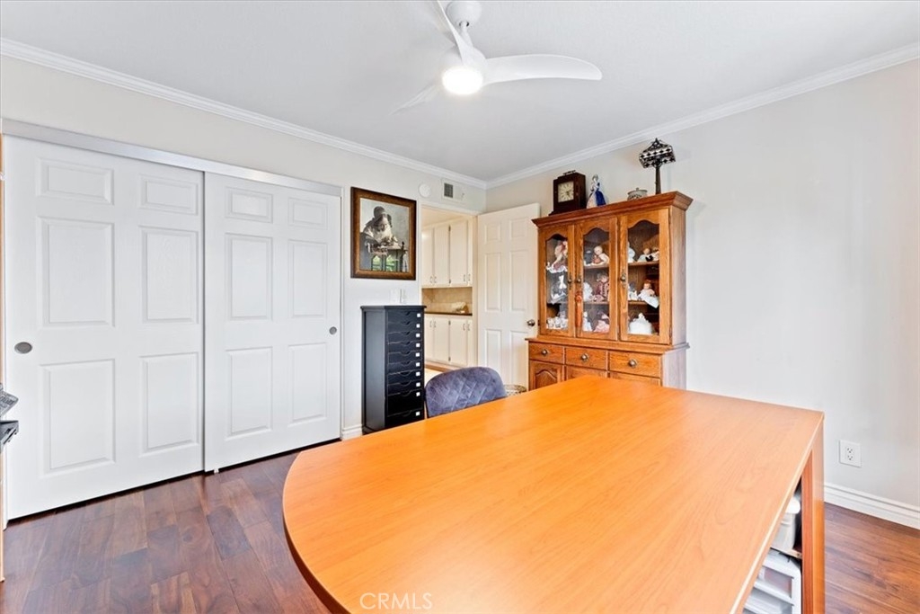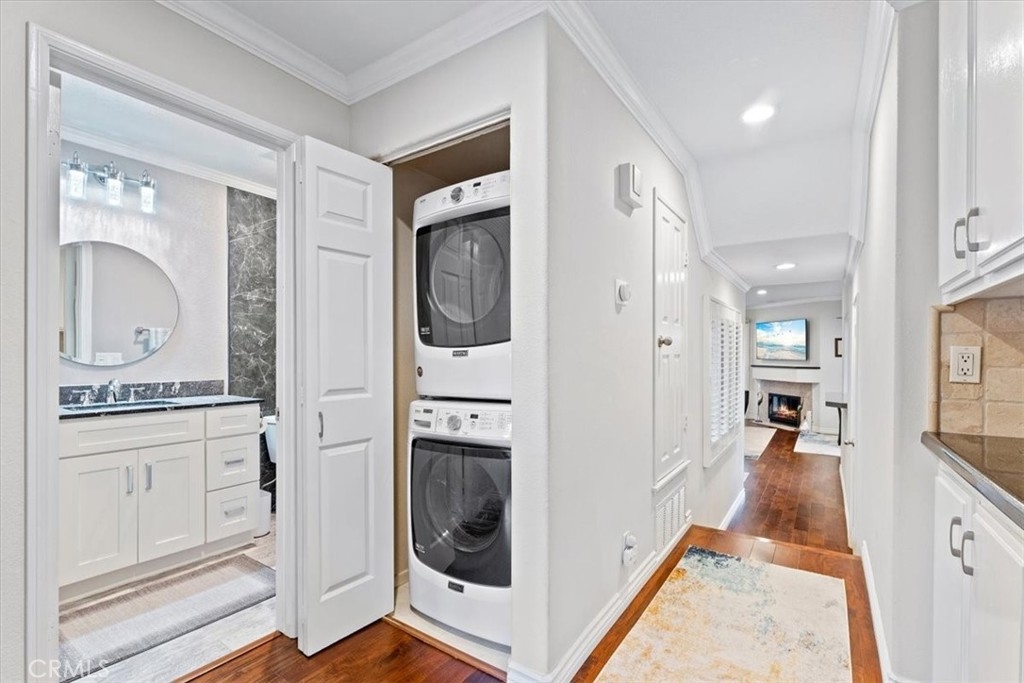 Elevated appointments abound in this Huntington Beach haven located just over a mile from the beach. This 2 bedroom, 2 bathroom end-unit is nestled in a lush garden setting that regularly entertains herons and osprey and provides the owner privacy and tranquility. Wood and porcelain tile flooring, canned lighting and crown molding throughout the unit complement the natural stone and quartz choices for the gas fireplace mantle and surround. The nine and a half foot ceilings and seven and a half foot patio doors give added dimension to the generous family room. All doors and windows are double paned glass. Opening the sliding doors invites the outside in and extends the living space of the family room and dining area on to the patio. In the evening, motorized shades transform this entertainment space into an intimate retreat. The custom built-in buffet lends a dramatic element to the dining area and provides storage as well as an area for displaying treasures. Quartz countertops and marble and glass backsplash are visual delights in the kitchen. Cooks will enjoy the various options afforded by the gas oven, including slow cook, dehydrate, bread proof, and convection as well as the five burner cooktop. The new refrigerator, microwave, dishwasher and pantry cupboard complete this culinary setting. The master bedroom has two double closets and is ensuite with a tiled shower, double sinks and linen closet. The guest bedroom has a double closet and a view of the park. The guest bathroom has an impressive contemporary feel and boasts a soaking tub and shower head with a seven foot height. With ample storage, a garage and parking space, this gem is available for your visit today.