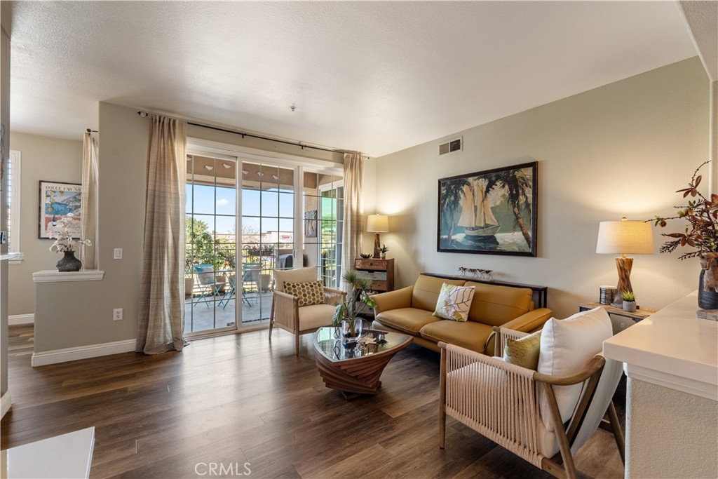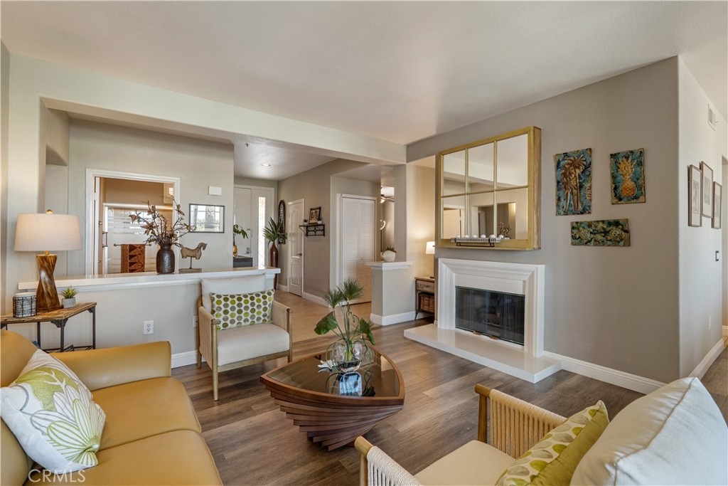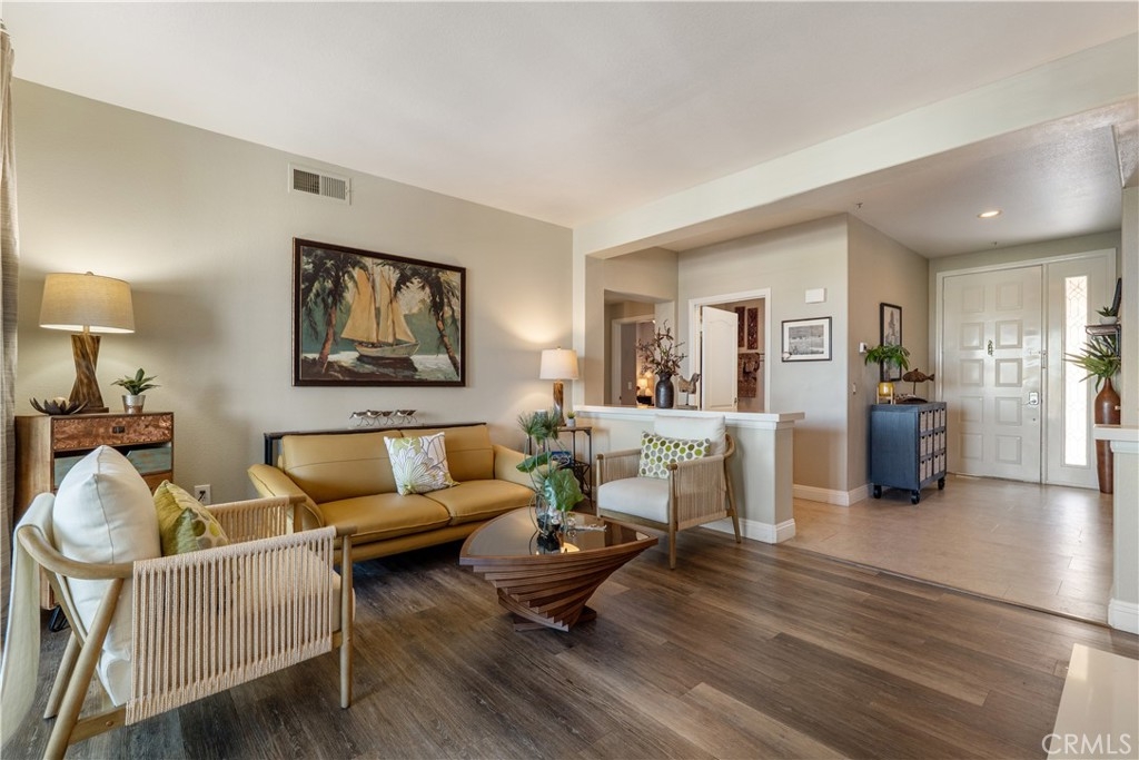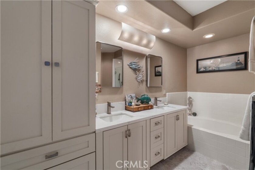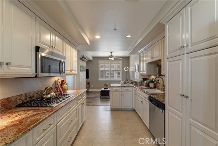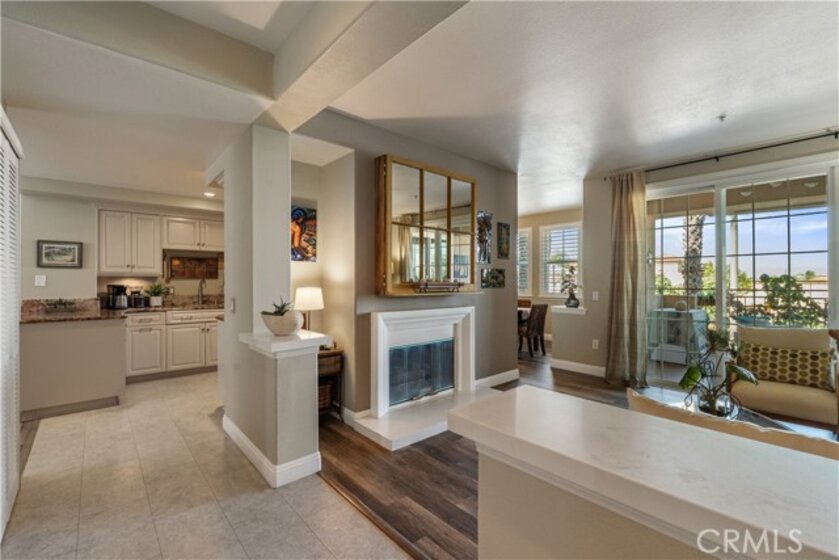 Just up the street from the Bolsa Chica Wetlands, Huntington Harbour, and the coastline sits this beautifully designed 2 bedroom, 2 bath Huntington Beach villa. As you step inside the welcoming entryway, you are greeted by a large living room, filled with abundant natural light and anchored by a cozy fireplace. Neutral vinyl wood flooring flows seamlessly throughout, creating a comfortable, easygoing atmosphere suited for quiet evenings or lively gatherings. The large, remodeled designer kitchen blends style with everyday function, offering high-end cabinetry, granite countertops, stainless steel appliances, and a spacious pantry with pull-out drawers that make staying organized feel effortless. The space invites both casual mornings and more thoughtful meal preparation. Adjacent, a separate den provides a versatile extension of the home, perfect as a home office, media room, or a quiet retreat when you need a little separation from the main living areas. Next, enter the thoughtfully placed dining area, framed by newer windows that invite in soft natural light and create an easy flow between spaces, ideal for both everyday living and entertaining. The primary suite feels like a true retreat, generous in size and designed for comfort, with direct access to the balcony. An ensuite bath has been beautifully updated with a new double sink vanity and quartz countertops, along with a soaking tub and separate shower. The second bedroom offers its own private ensuite bath, providing comfort and privacy for guests, extended stays, or a secondary primary setup. And when you want to enjoy the outdoors, step outside to the private balcony, where gentle coastal breezes and distant mountain views offer a peaceful moment of escape. Throughout the home, thoughtful details like plantation shutters, newer windows and central air conditioning add to the overall comfort, while an in-unit stackable washer and dryer and two side-by-side parking spaces with ample additional storage bring everyday convenience. Beyond the home, the community is well maintained and welcoming, featuring an elevator, a tranquil courtyard with a fountain, and resort-style amenities including a pool, spa, and inviting common areas designed for relaxation. All of this is set in a location near shopping, dining, walking trails and just minutes from the beach. What a beautiful place to call home!